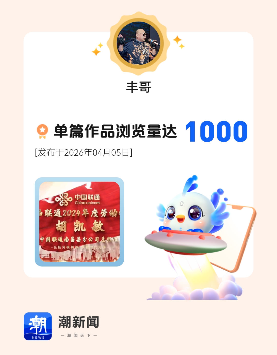 我在潮新闻发表的单篇作品浏览量达到1000!