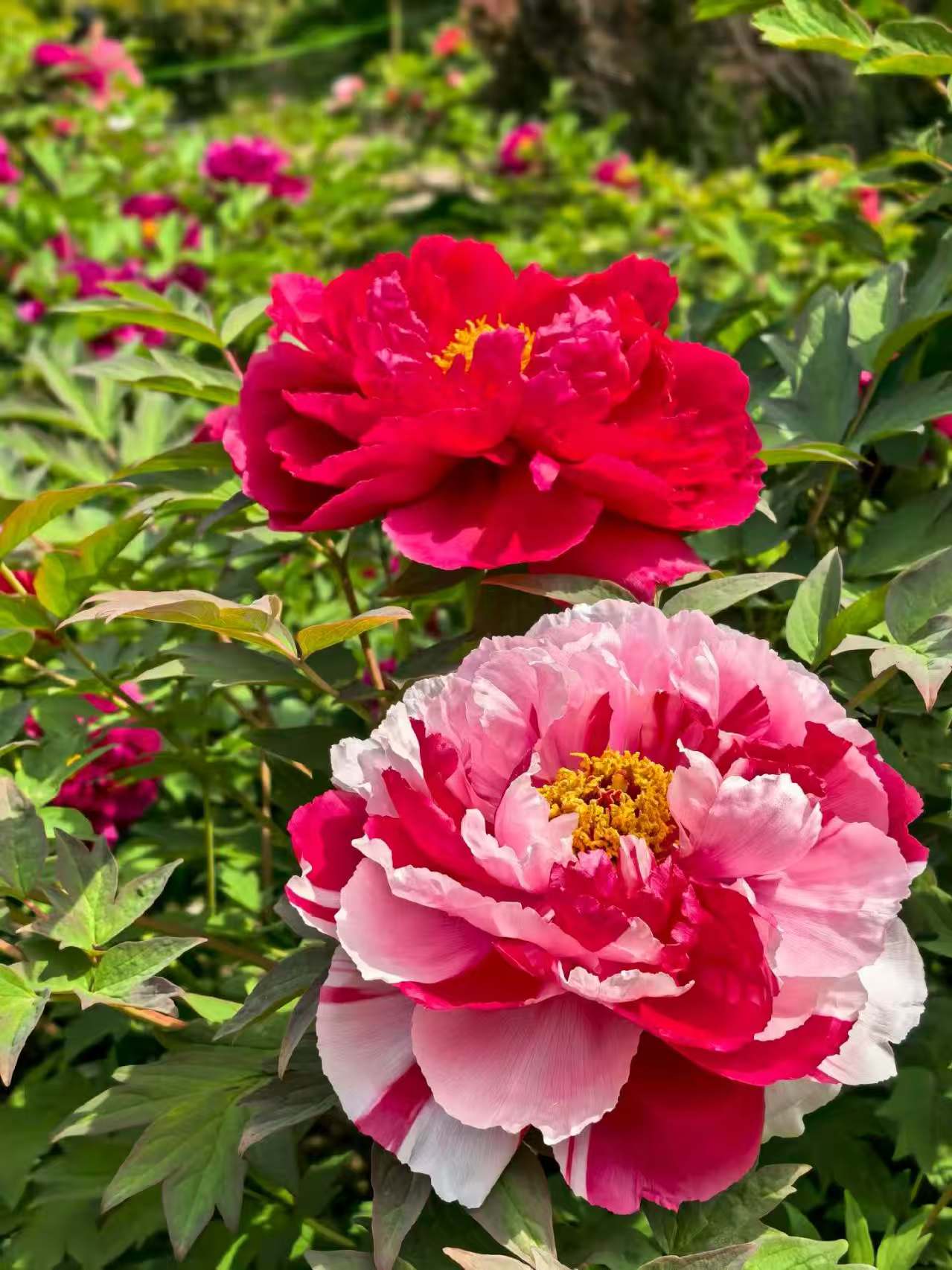 国色天香属二乔— —暮春时节,牡丹如约绽放, 二乔牡丹更是惊艳。一朵花揉碎了胭脂与白雪,红的浓艳似火,粉的温婉如云,层层叠叠的花瓣裹着金黄花蕊,在绿意中舒展芳华。 牡丹不愧是花中之王,雍容华贵又不失清雅,每一寸花瓣都透着从容,尽显春日极致的雍容与生机。