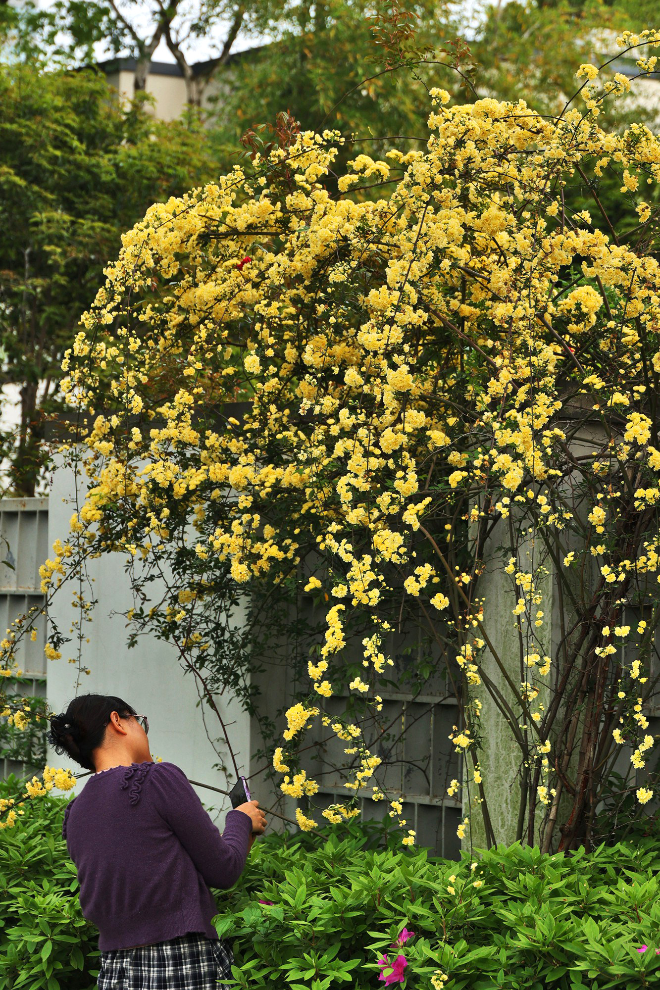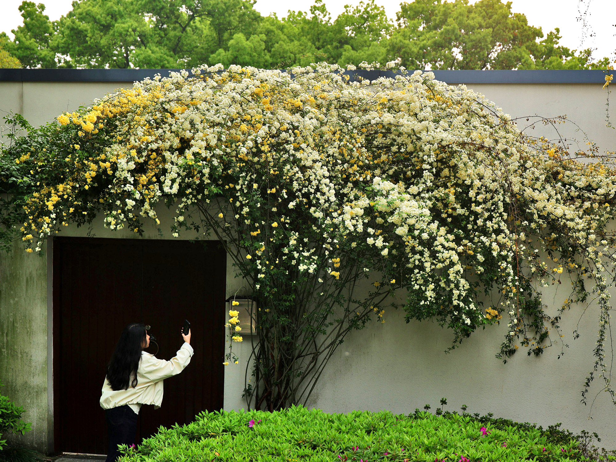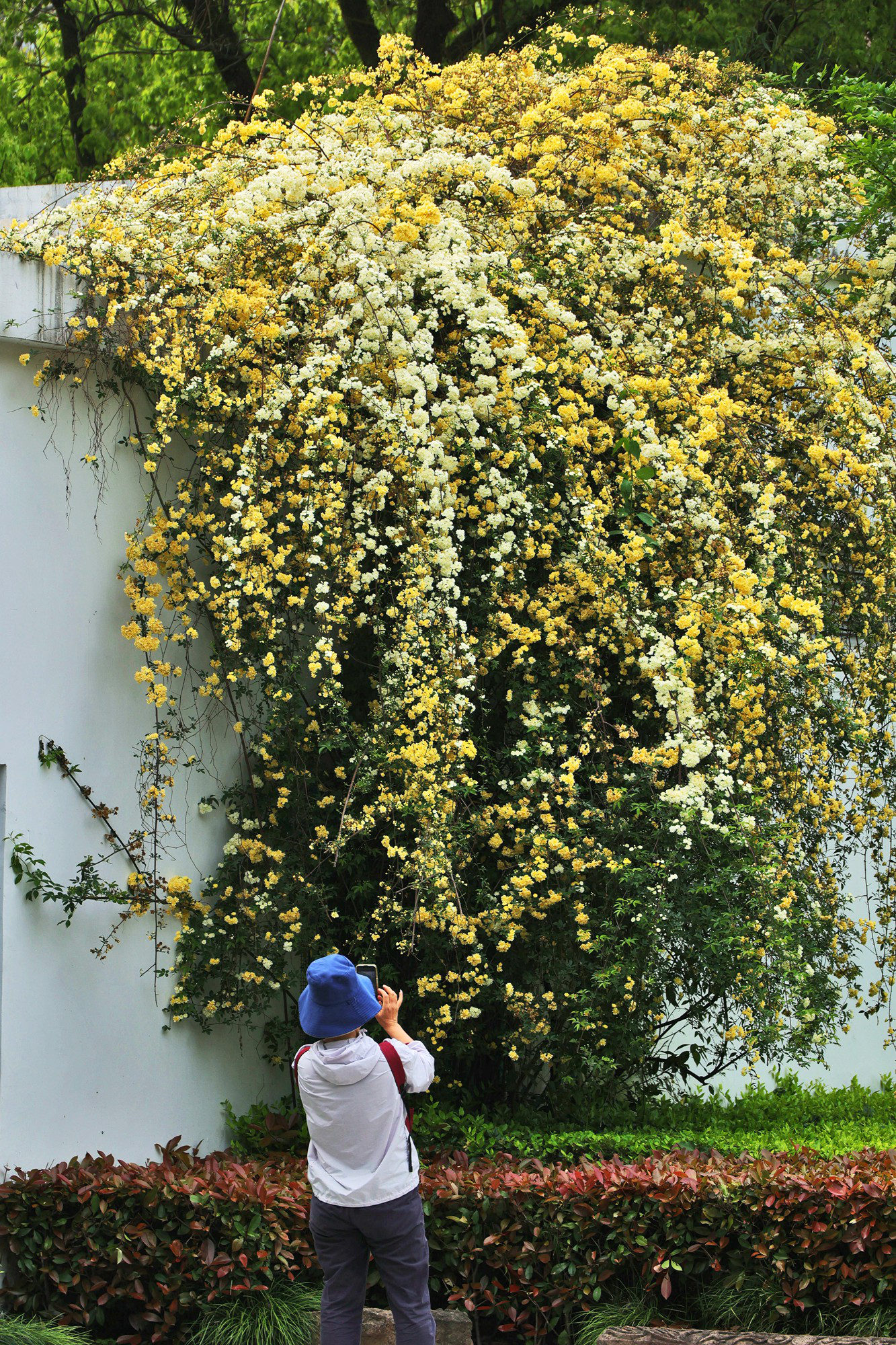 《木香花如瀑》早上,走过宁波江北绿岛公园,遇见园林博物馆外围墙上如瀑的木香花正热烈绽放,白如雪,黄似霞,繁花似锦。靠近花瀑,清香弥漫,令人心旷神怡。