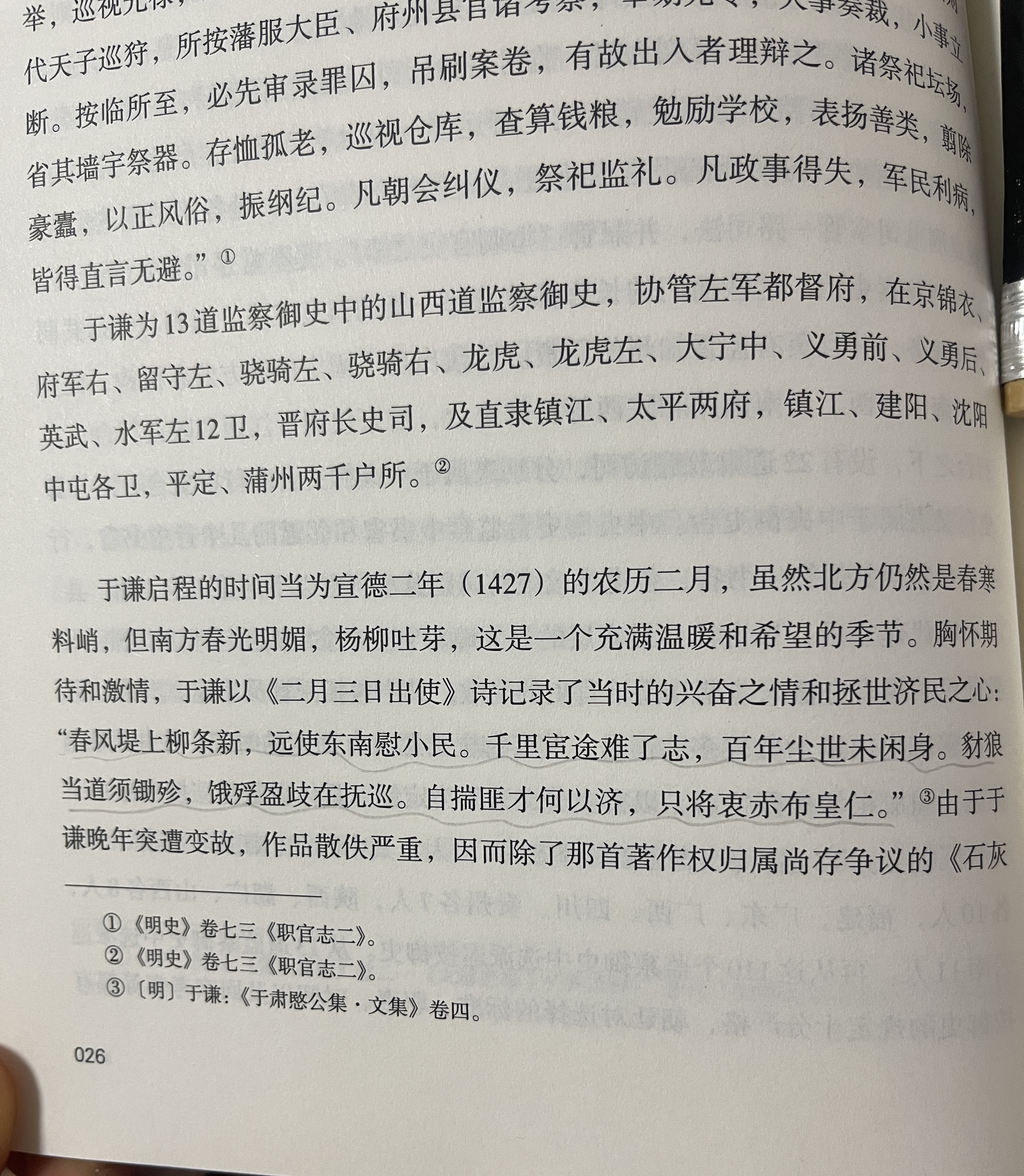 Day7: 今天继续阅读《风孰与高于谦传》。 通过高煦之乱后,于谦开始巡按江西,写下了一首描写他当时启程去江西的心情和抱负的诗篇:“春风堤上柳条新,远使东南慰小民。千里宦途难了志,百年尘世未闲身。豺狼当道须锄殄,饿殍盈歧在抚巡。自揣匪才何以济,只将衷赤布皇仁。”后来他也是践行了诗中的期许,践行了他的衷赤。