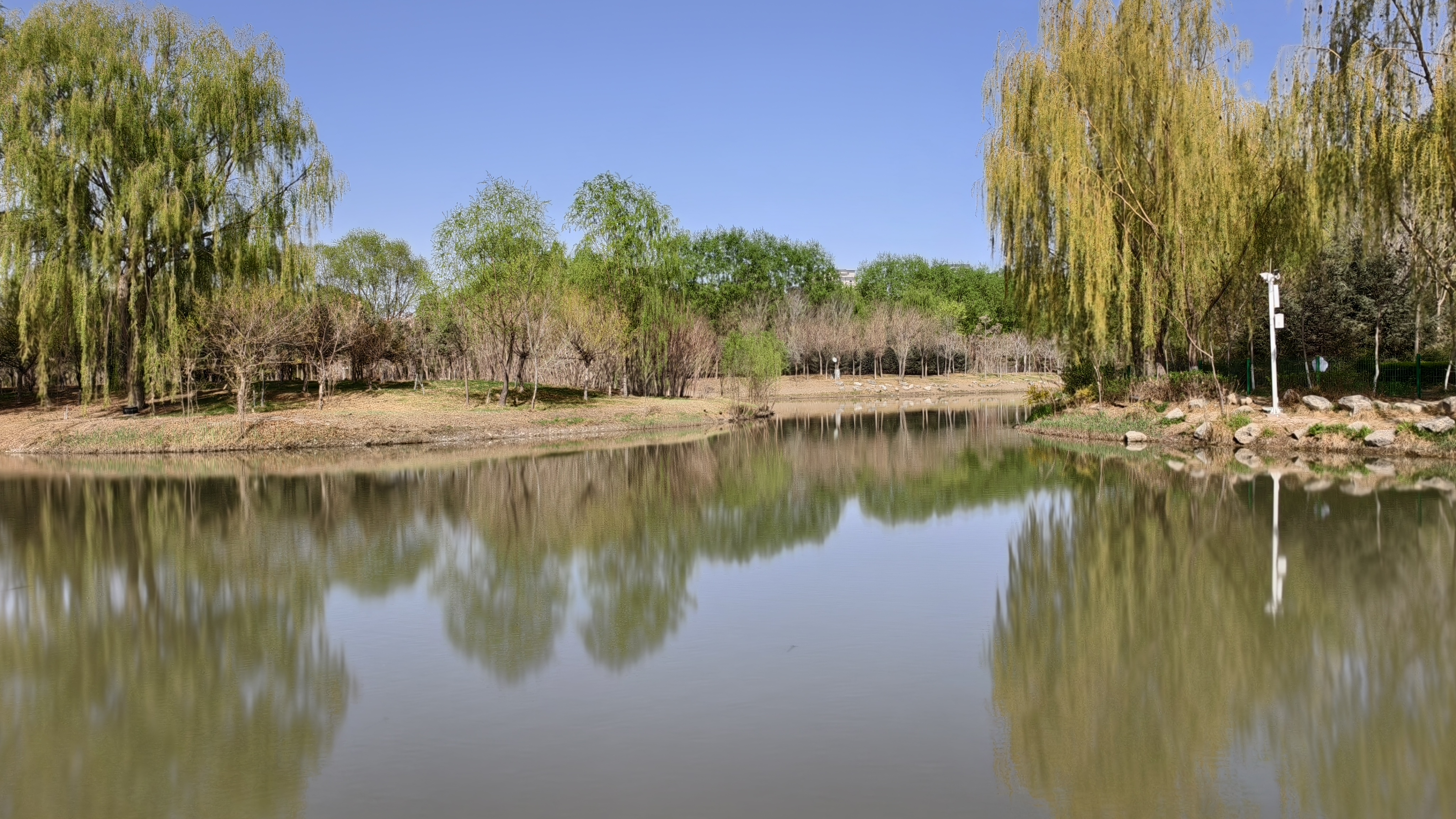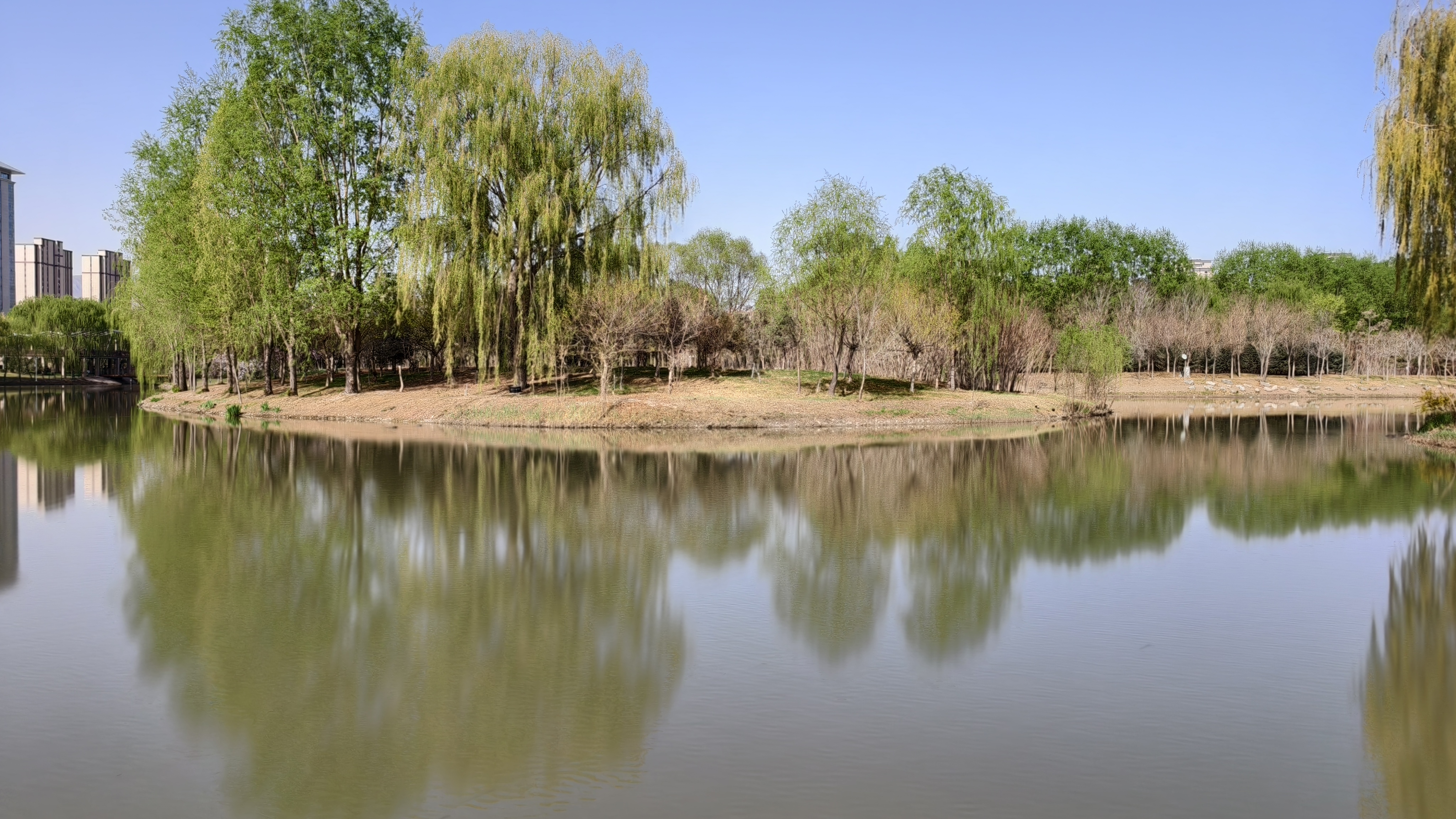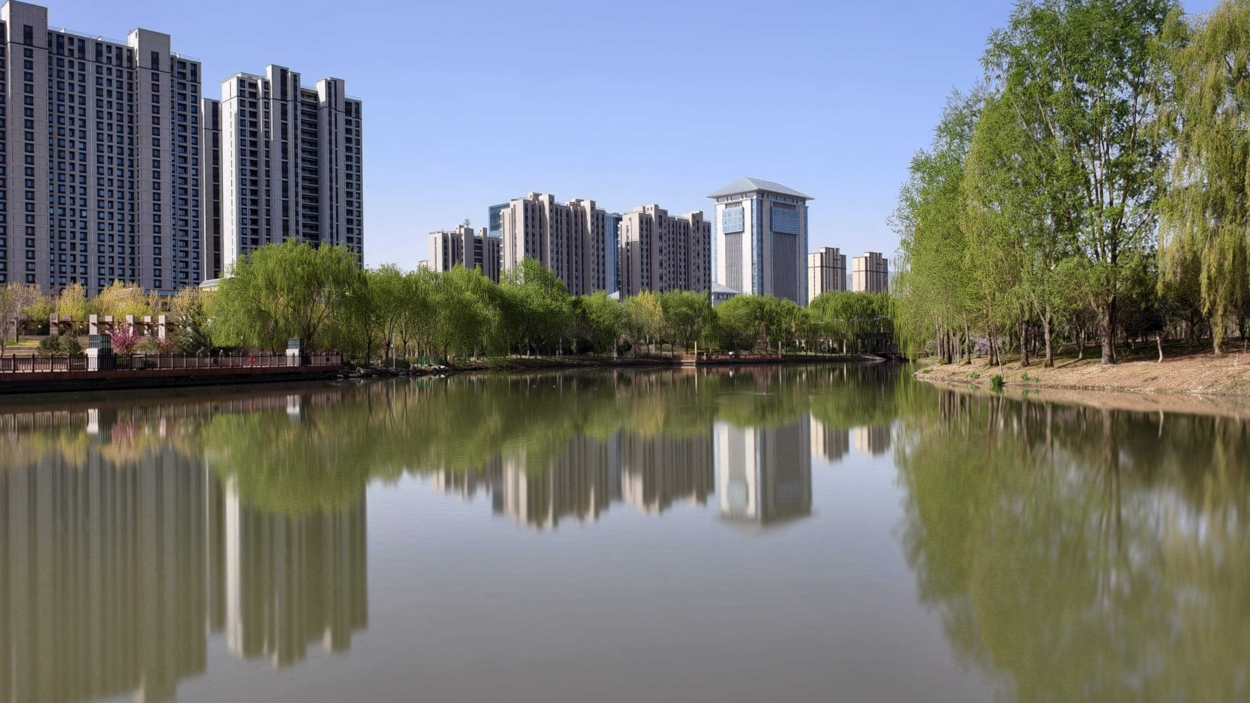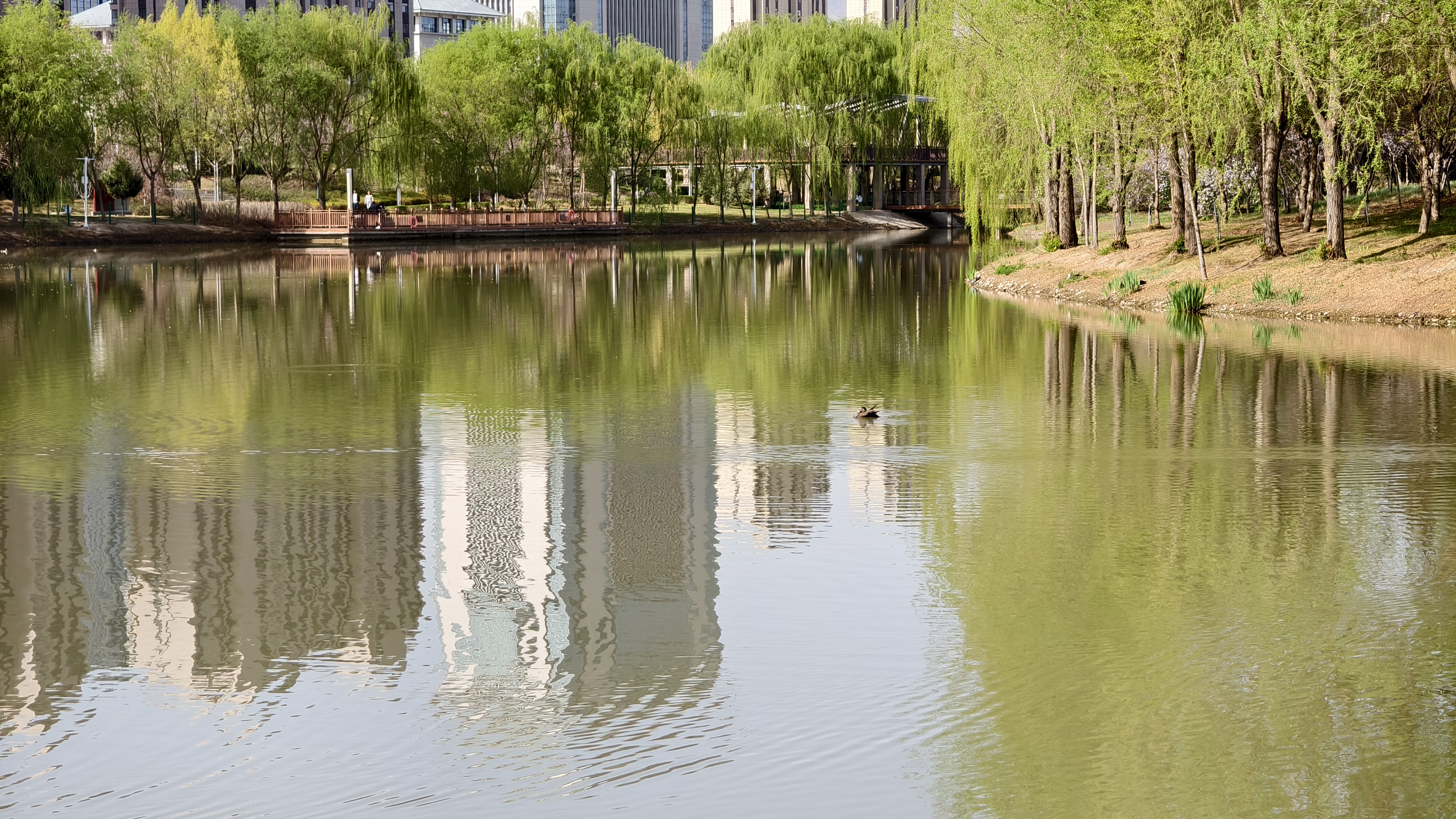 2026年4月12日,甘肃武威海藏湿地公园满园春色。柳丝垂碧水,樱云浮亭影。紫叶李与海棠共染春色。