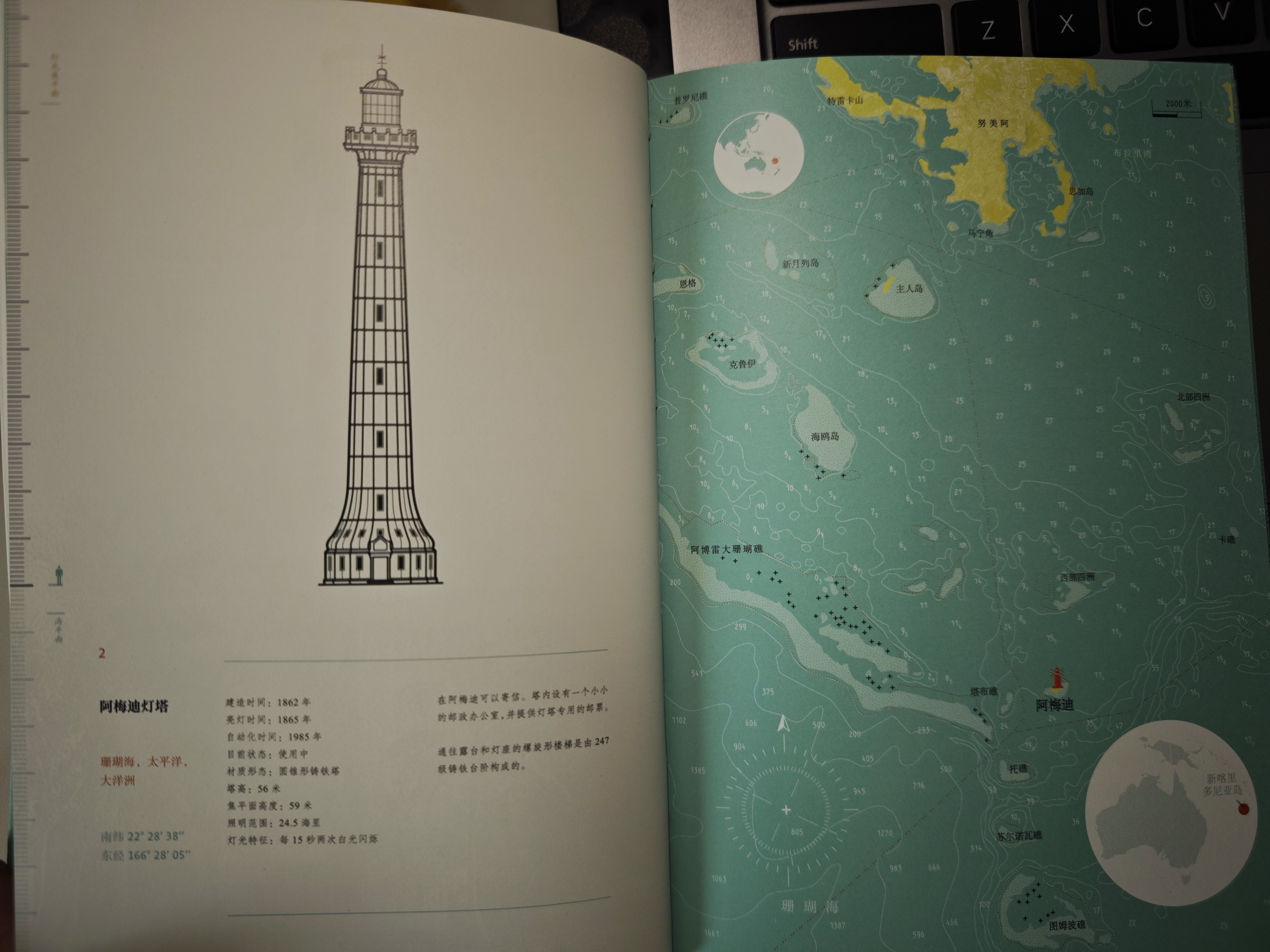《世界尽头的灯塔》之阿梅迪灯塔 阿梅迪灯塔(Phare d'Amedée)是一座充满法式浪漫与历史反差感的地标,它不仅是一座导航设施,更是一个极具魅力的旅游目的地。 这座灯塔位于新喀里多尼亚(法国海外属地),矗立在努美阿(Nouméa)以南约24公里的灯塔岛上。它高56米,是世界上最高的铸铁灯塔之一。灯塔由著名的法国工程师古斯塔夫·埃菲尔(Gustave Eiffel,埃菲尔铁塔设计者)的团队设计。整座灯塔在巴黎制造,被拆解成1200个铸铁部件,穿越半个地球运抵此地组装而成,于1865年正式投入使用。 阿梅迪灯塔最独特之处在于它“文明与野蛮”的共生。当年法国人建立这座灯塔,是为了引导载满政治犯和危险罪犯的船只安全抵达这片“太平洋上的洁净监狱”。如今,这里却是人间天堂。灯塔内部设有一个迷你邮政局,你可以在这里寄出盖有灯塔专属邮戳的明信片,这是它延续至今的浪漫传统。沿着塔内247级旋转楼梯登顶,你可以俯瞰世界最大的潟湖和细腻的白沙,景色极为震撼。岛上一面是开发完善的旅游区,另一面则保留了原始的棕榈树林和海滩,你还可以体验深海喂鲨鱼或与小鲨鱼共游。