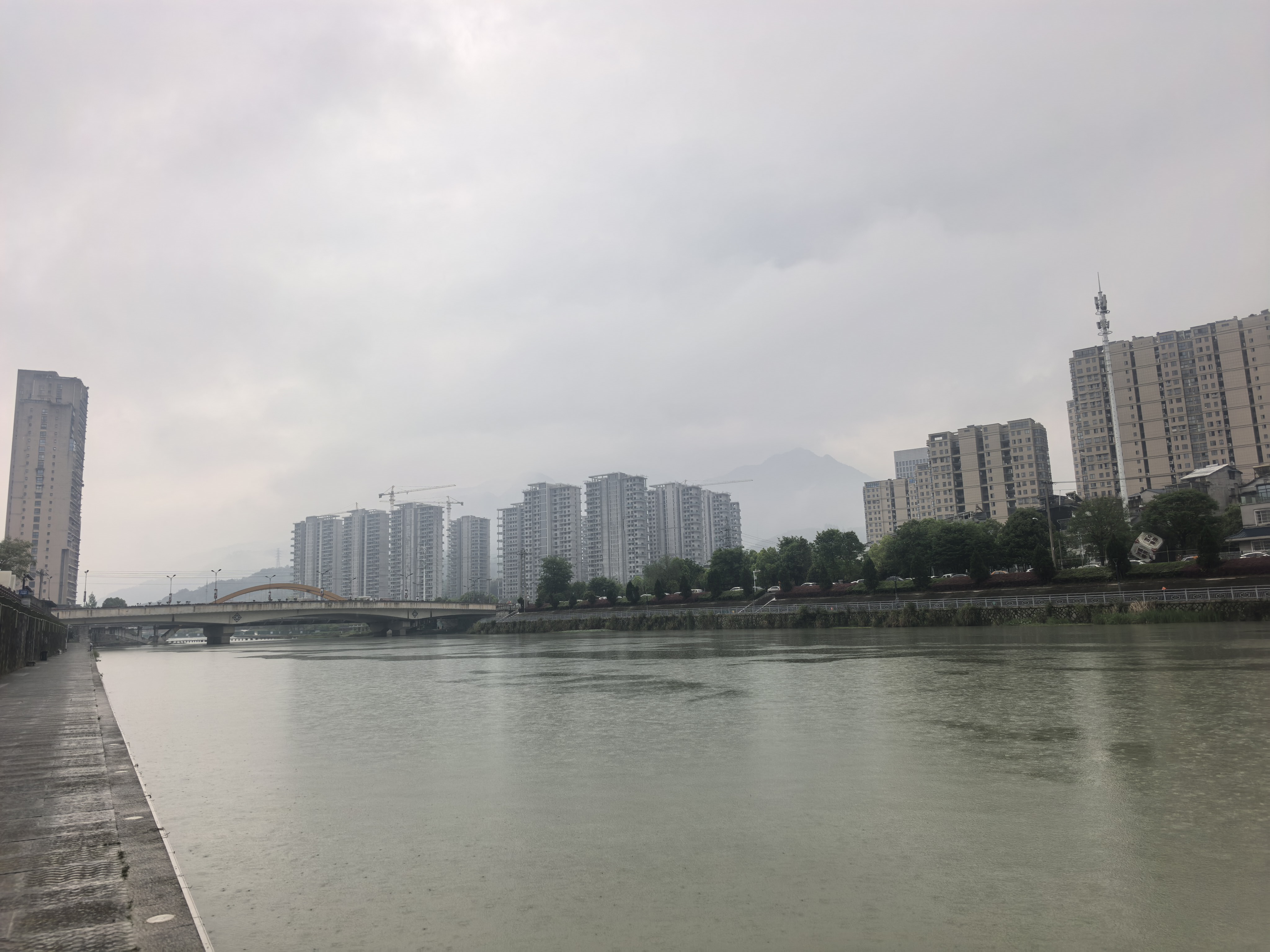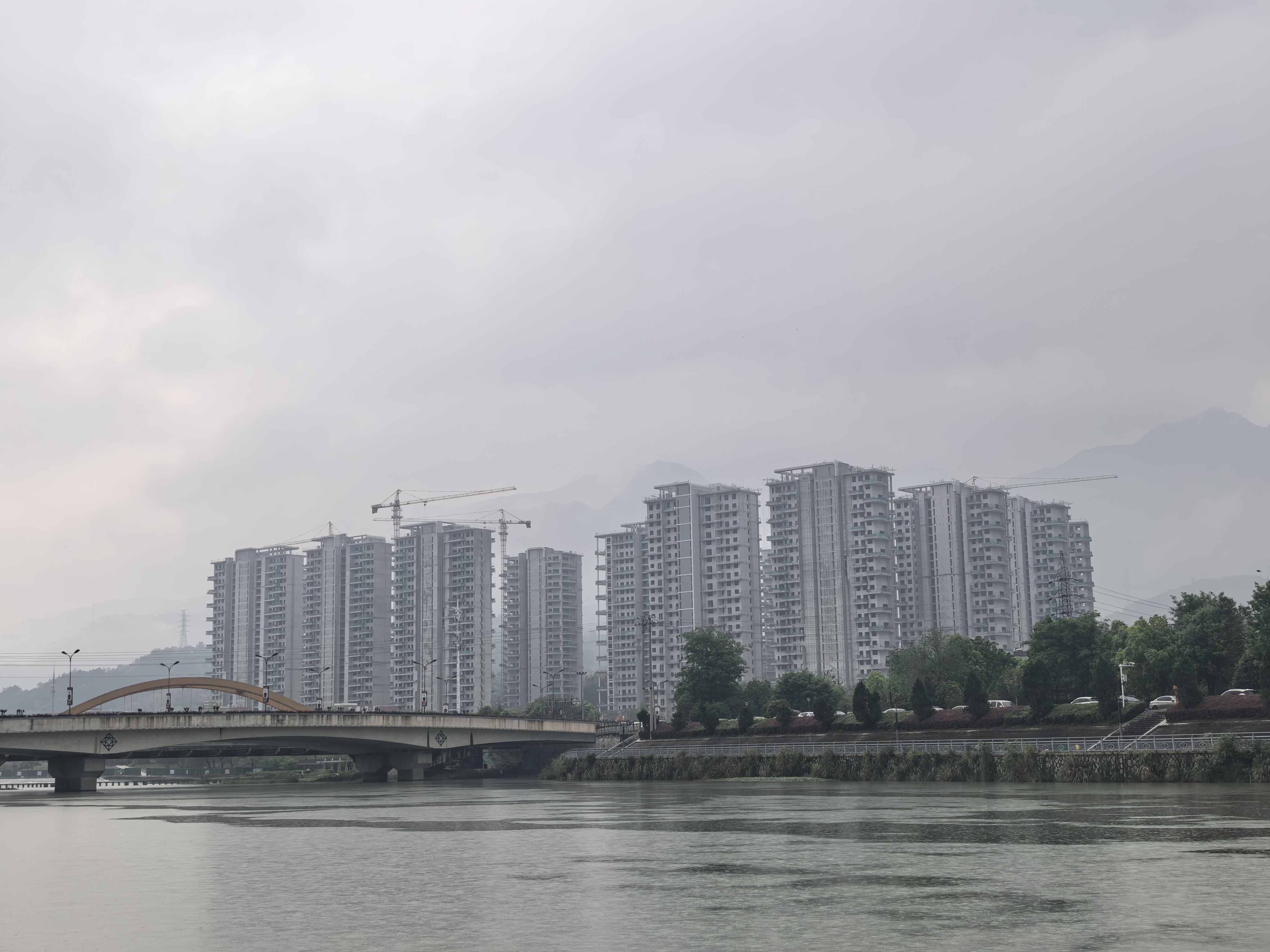 阴天里的城市脉搏,河岸步道慢行,看塔吊轻摇、江景与远山静静对话~