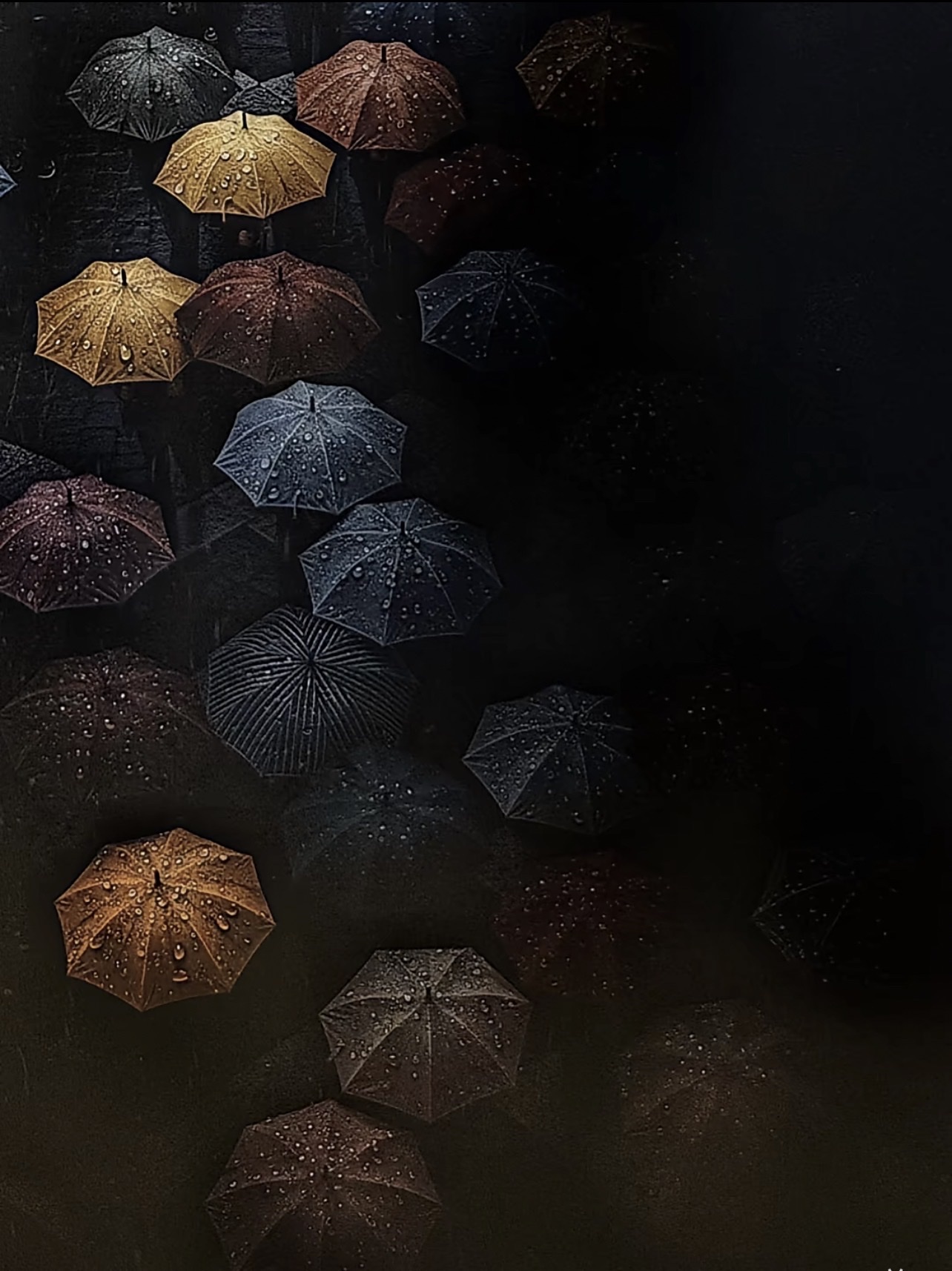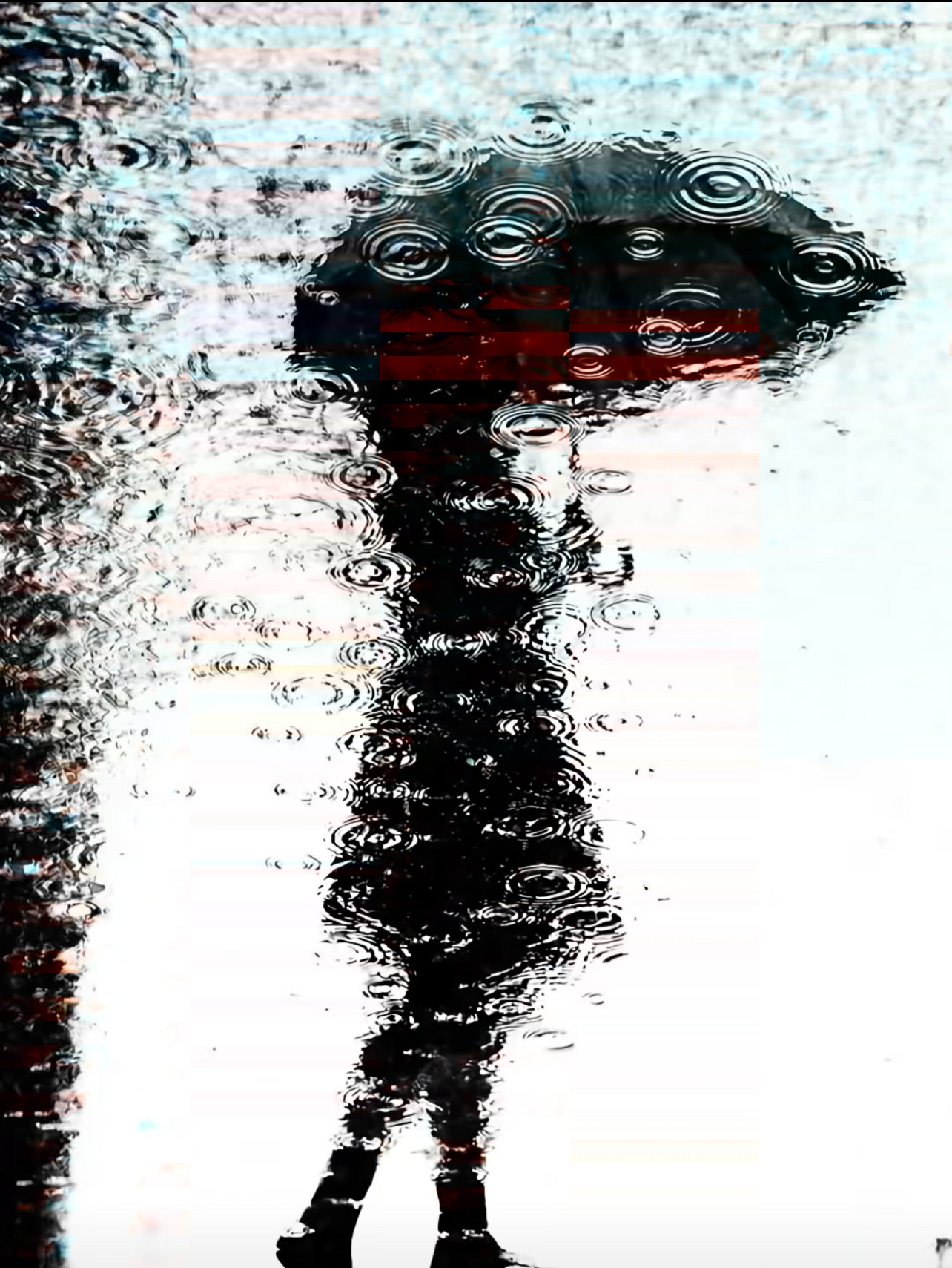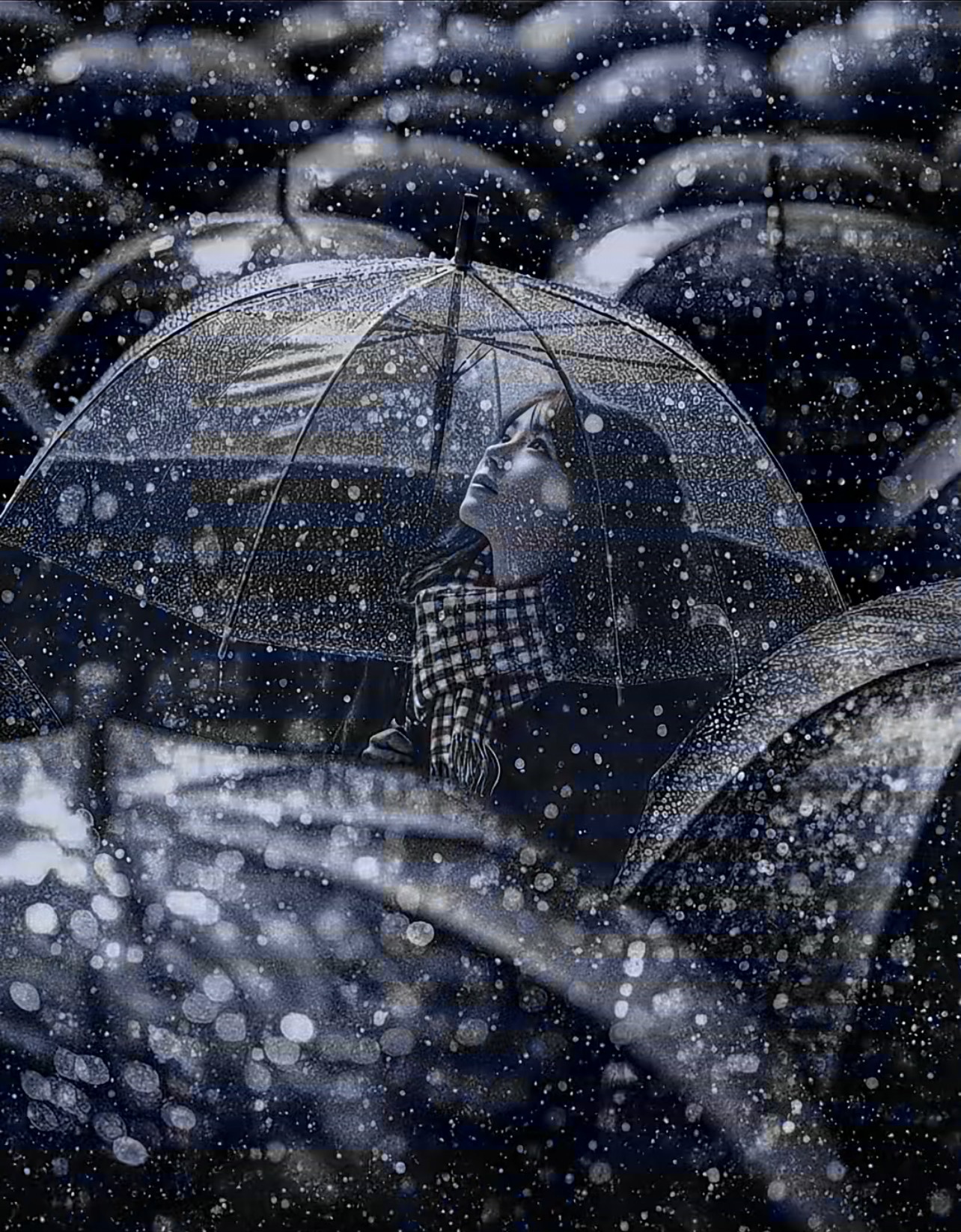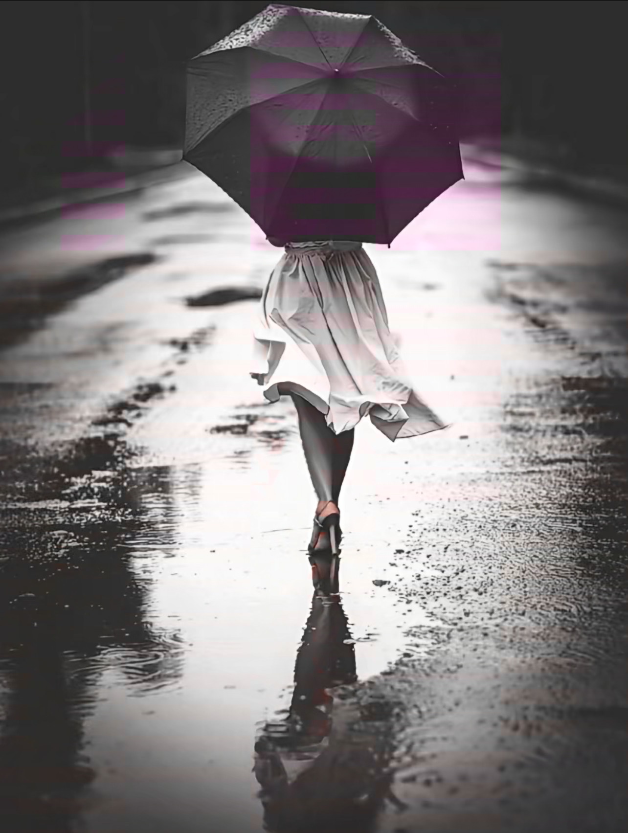 雨丝轻落,白裙曳过墨色街面;伞下独行,倒影碎成紫晕涟漪——整座城,静得只余水光与心跳。