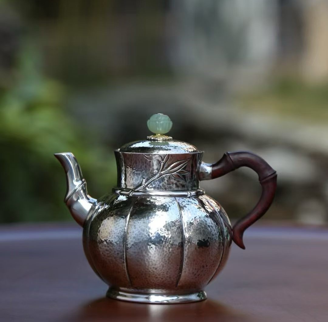 掌声银壶,一盏清欢。 锤纹肌理里藏着光阴的故事,竹影与玉钮相映,把寻常日子泡成诗