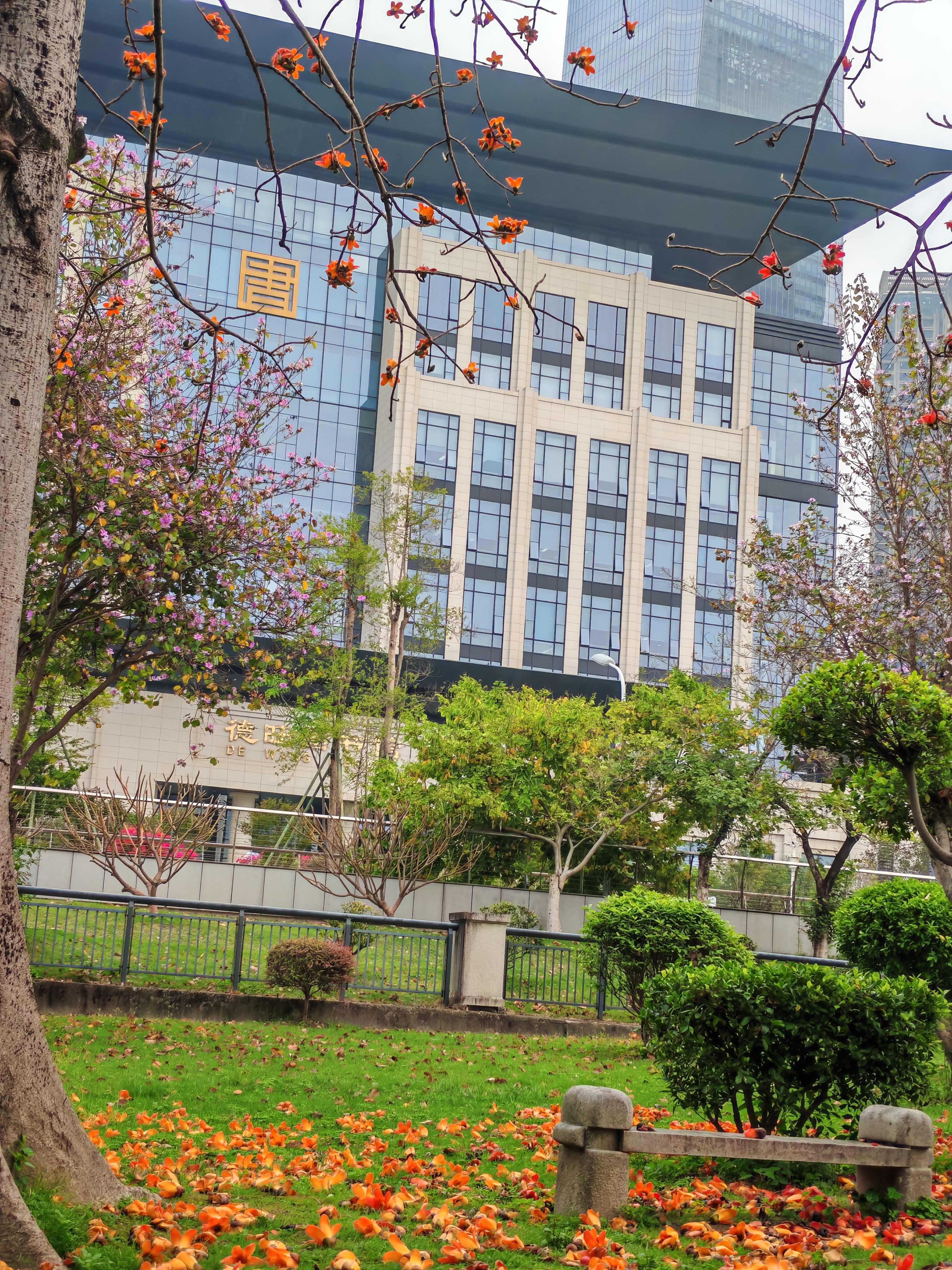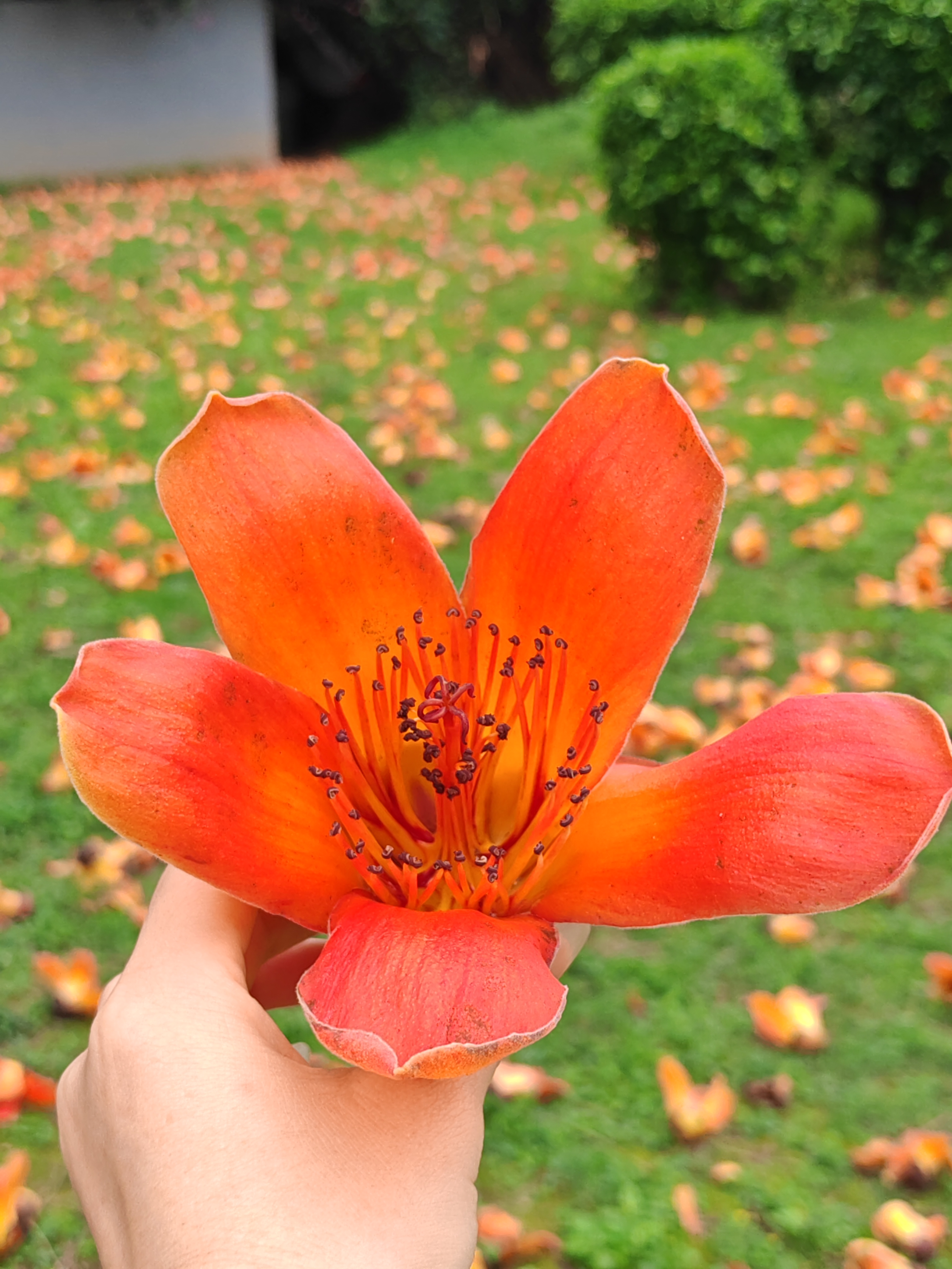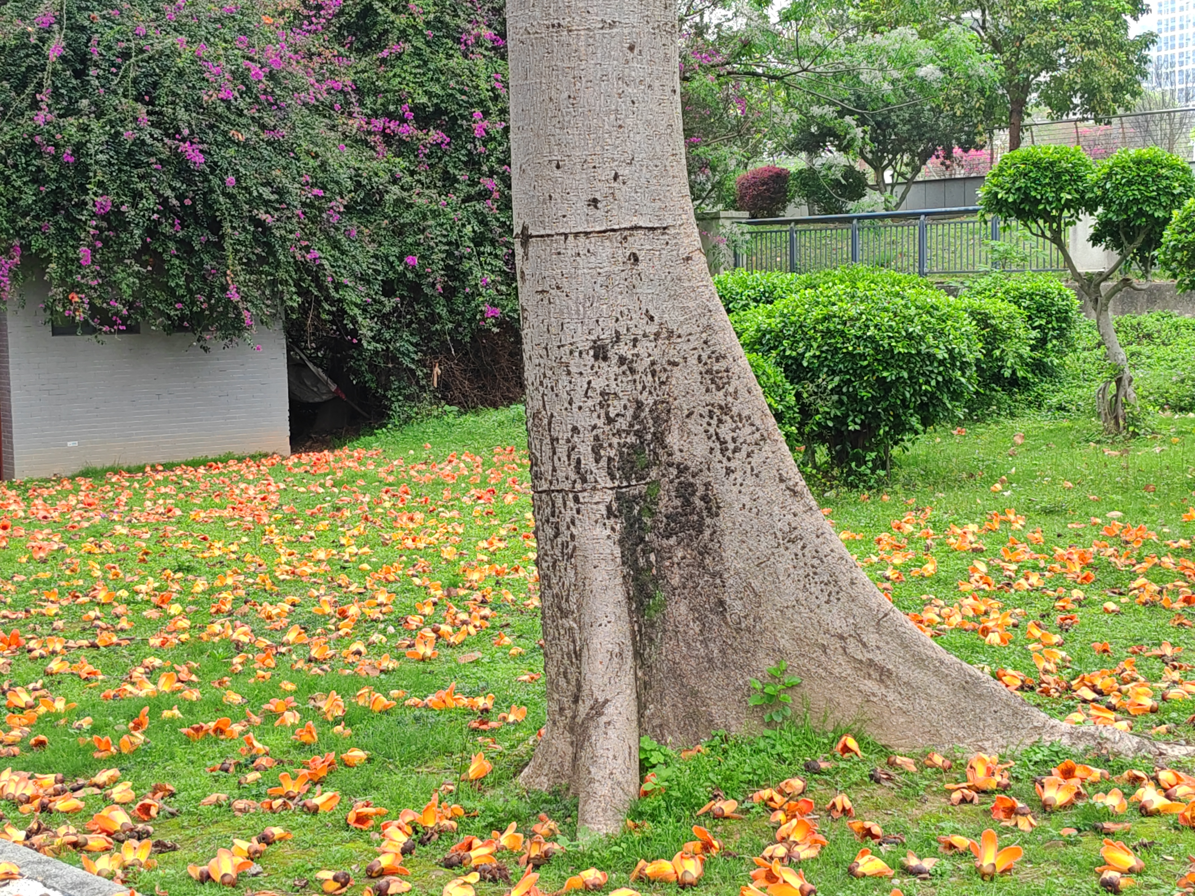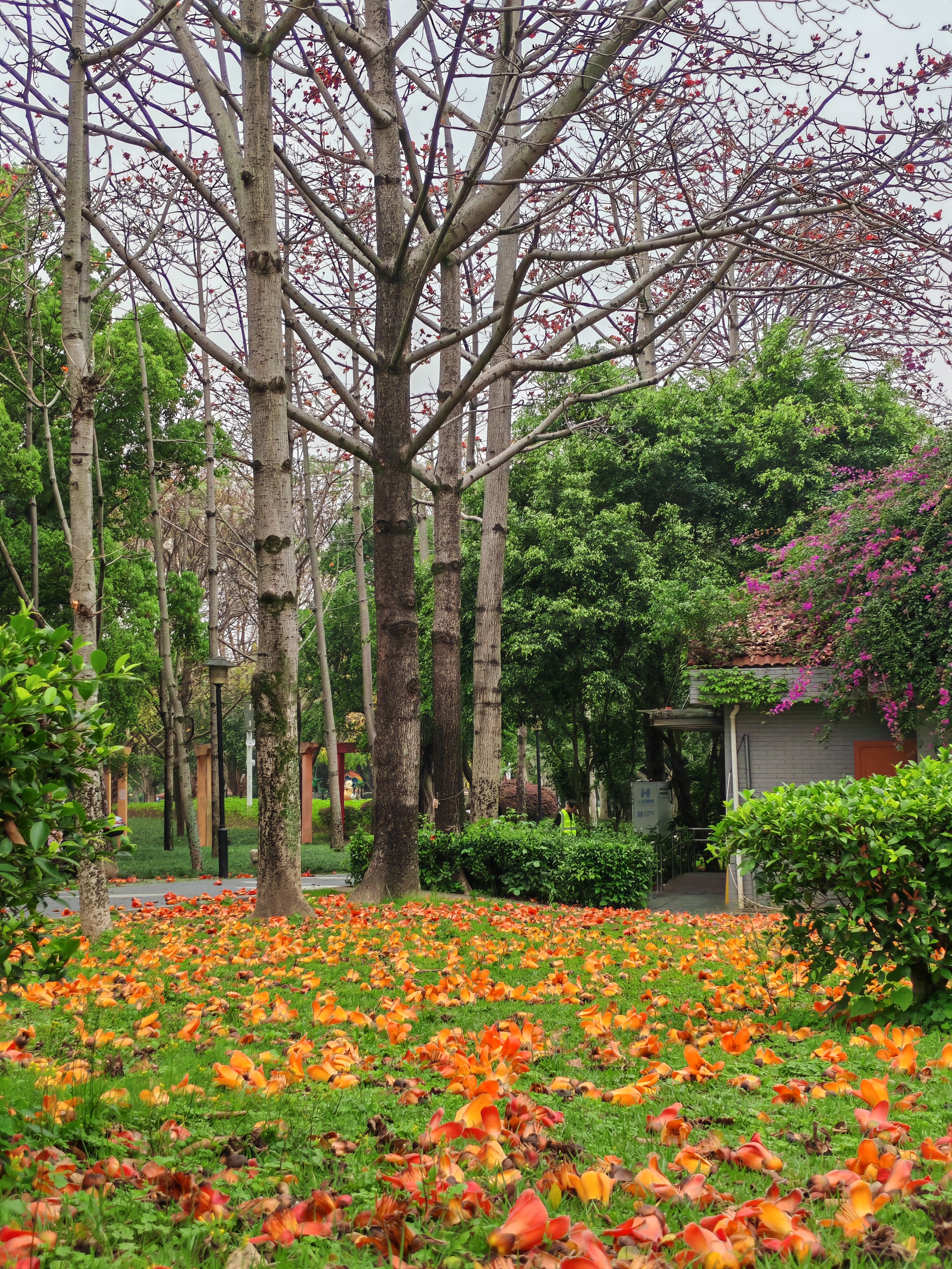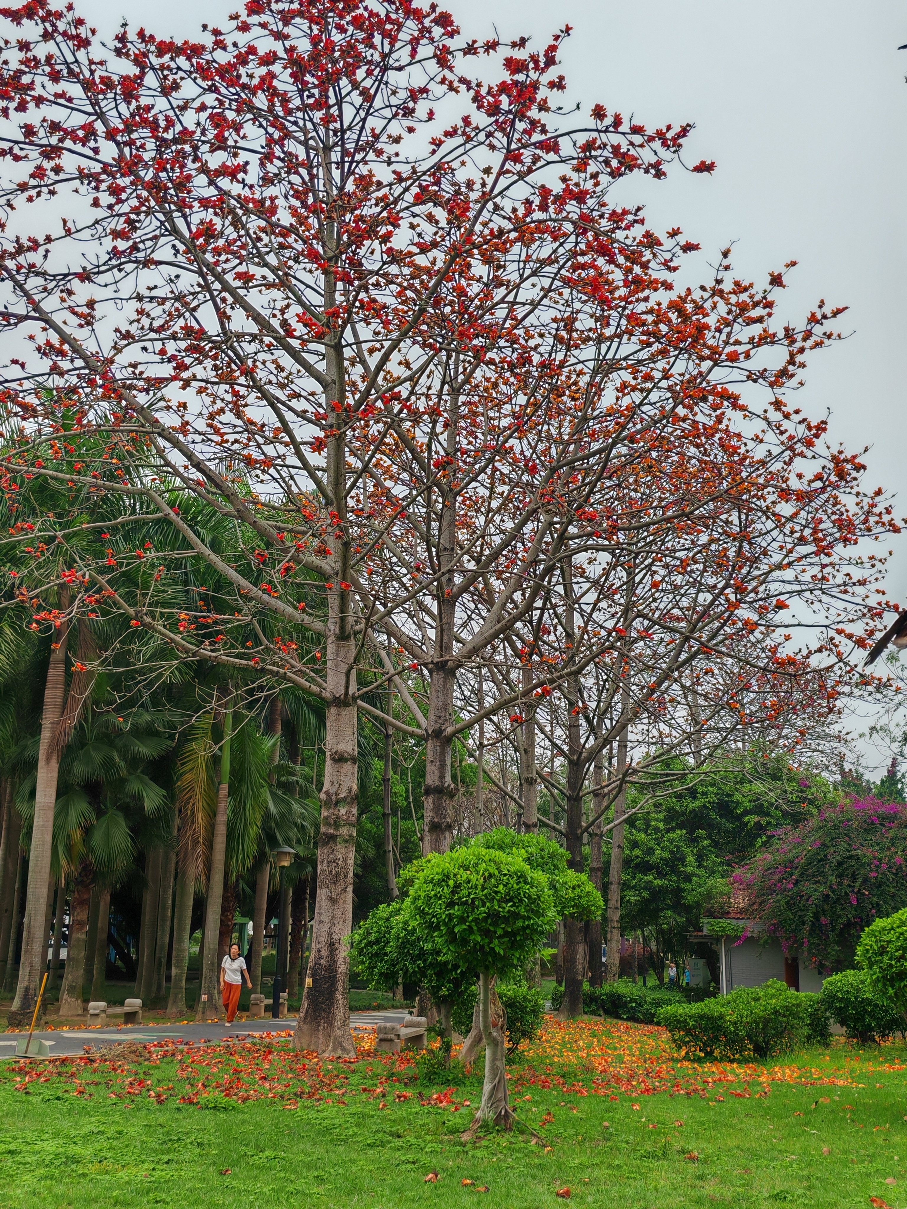 公园的木棉正燃!橙红花雨落满草坪,手捧一朵仰头拍——枝干虽秃,春天却嚣张得理直气壮~
