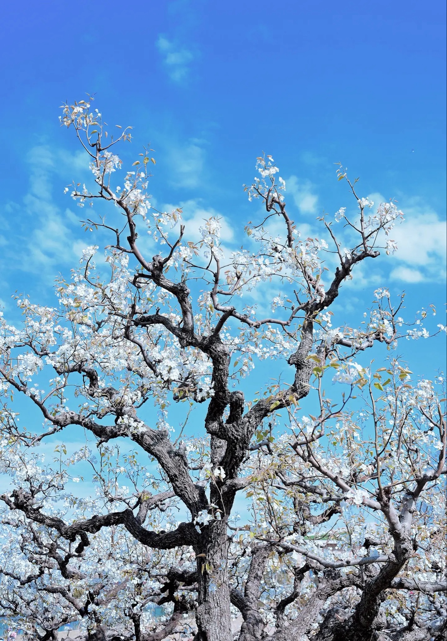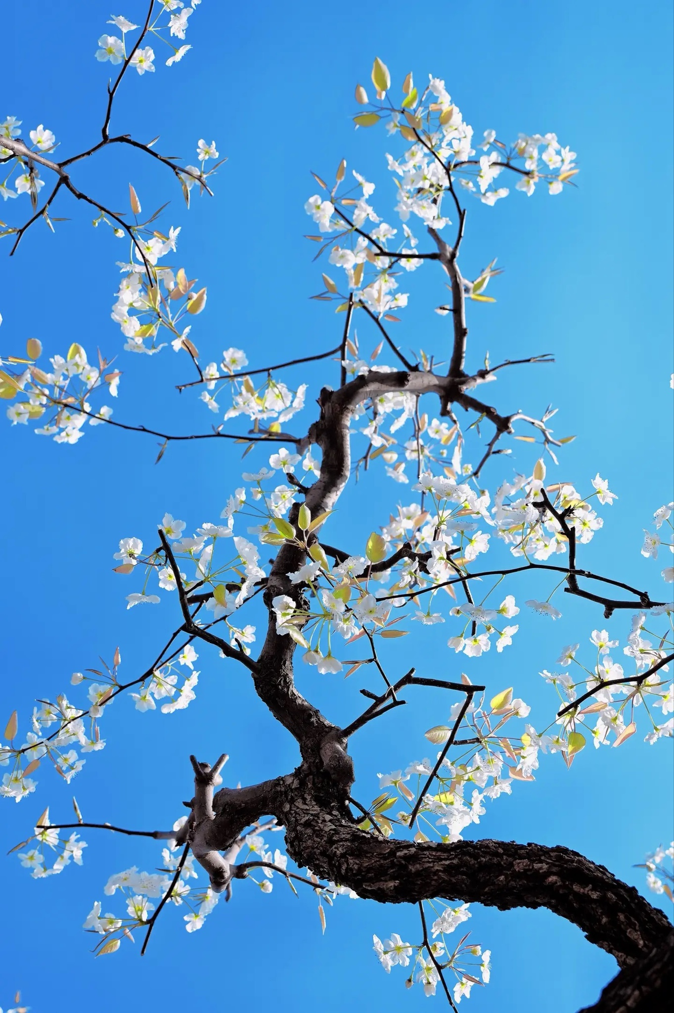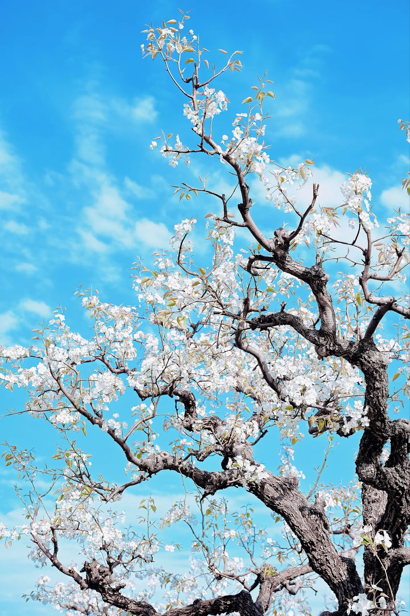 春深似海,老梨树虬枝伸向澄澈蓝天。一树素白,如雪堆云,新叶初绽嫩绿,在风里轻轻摇曳。阳光穿过花隙,洒下斑驳光影——这北国果园的静美,是自然写给春天最清冽的诗行。快门轻按,便锁住整季的纯净与生机。