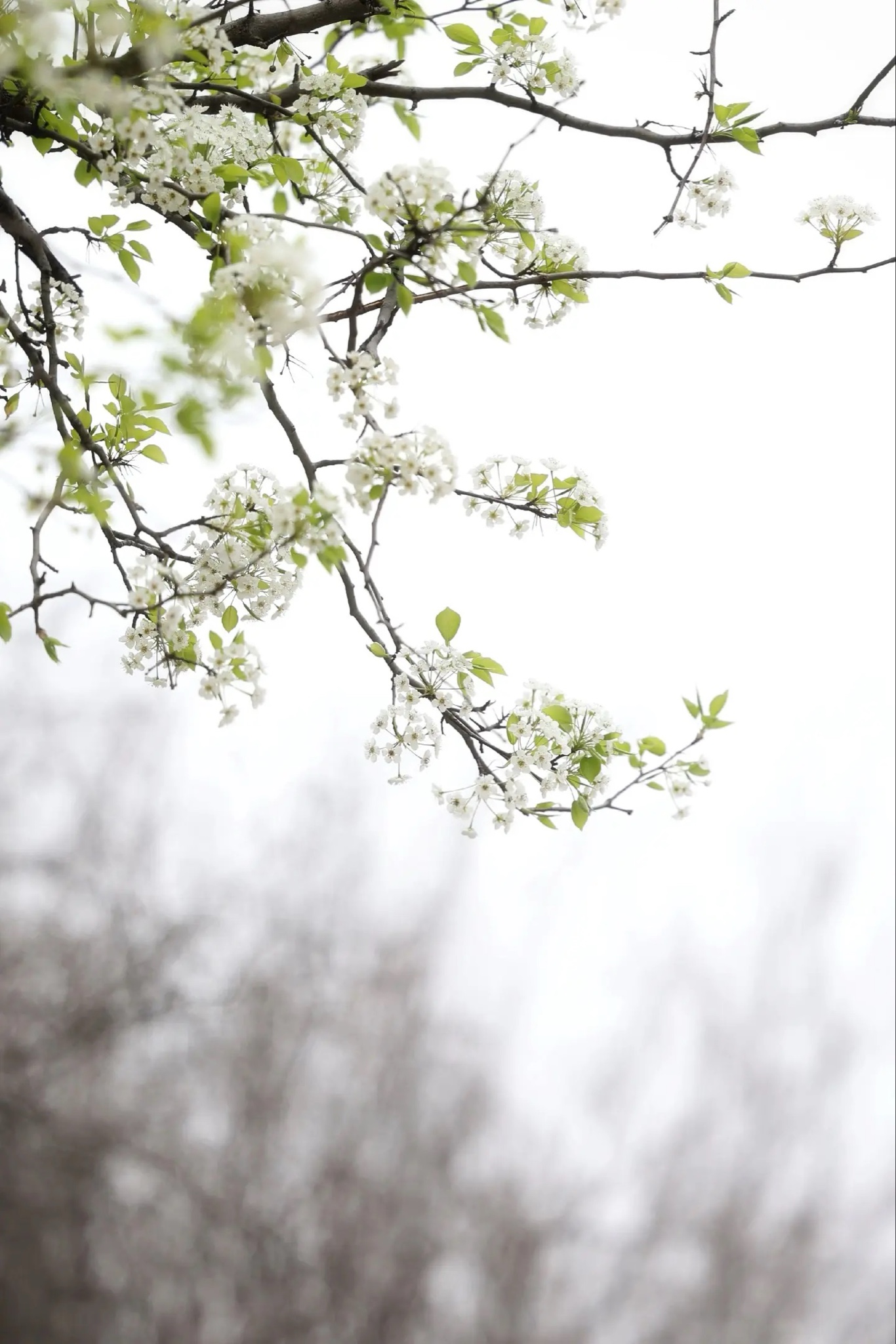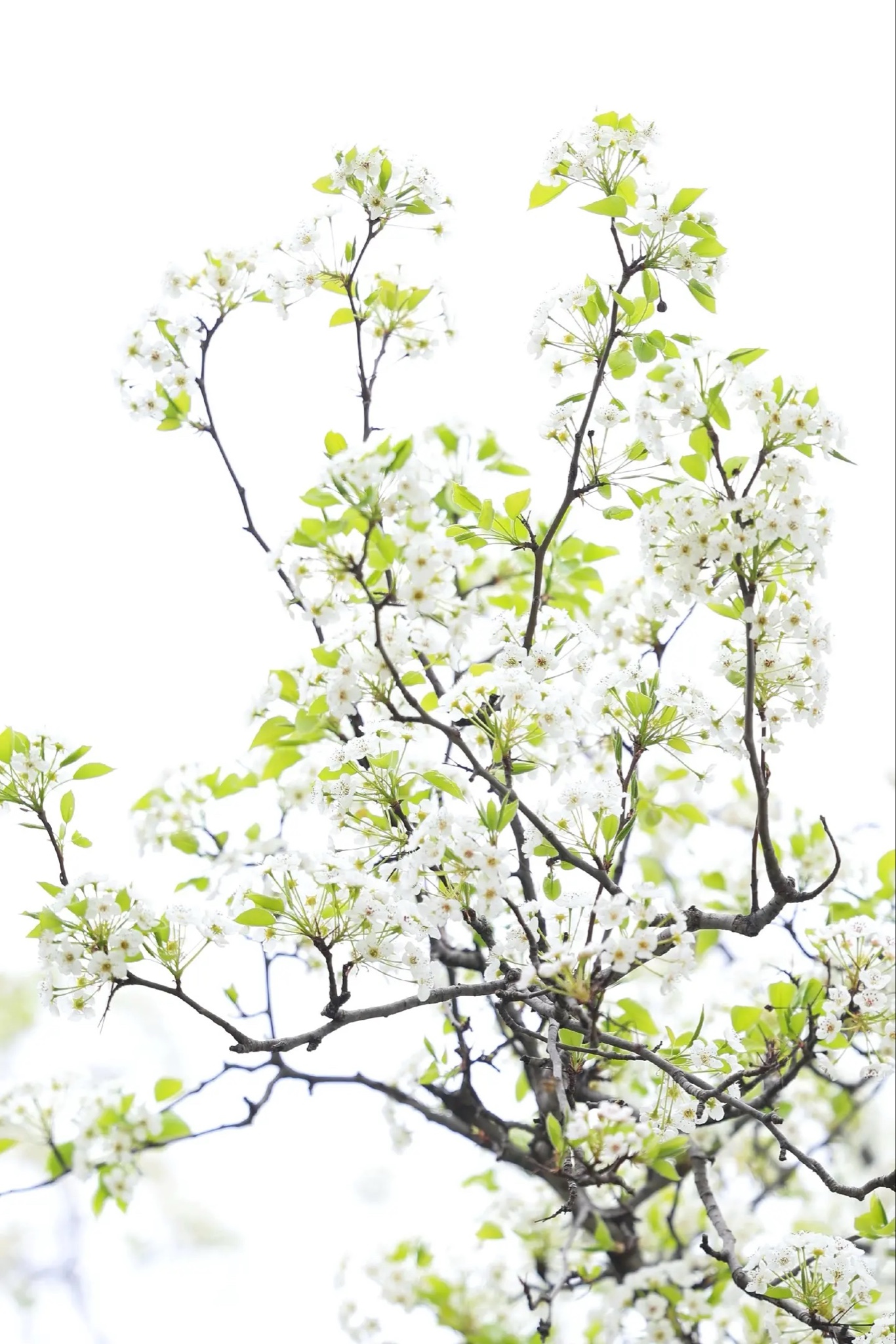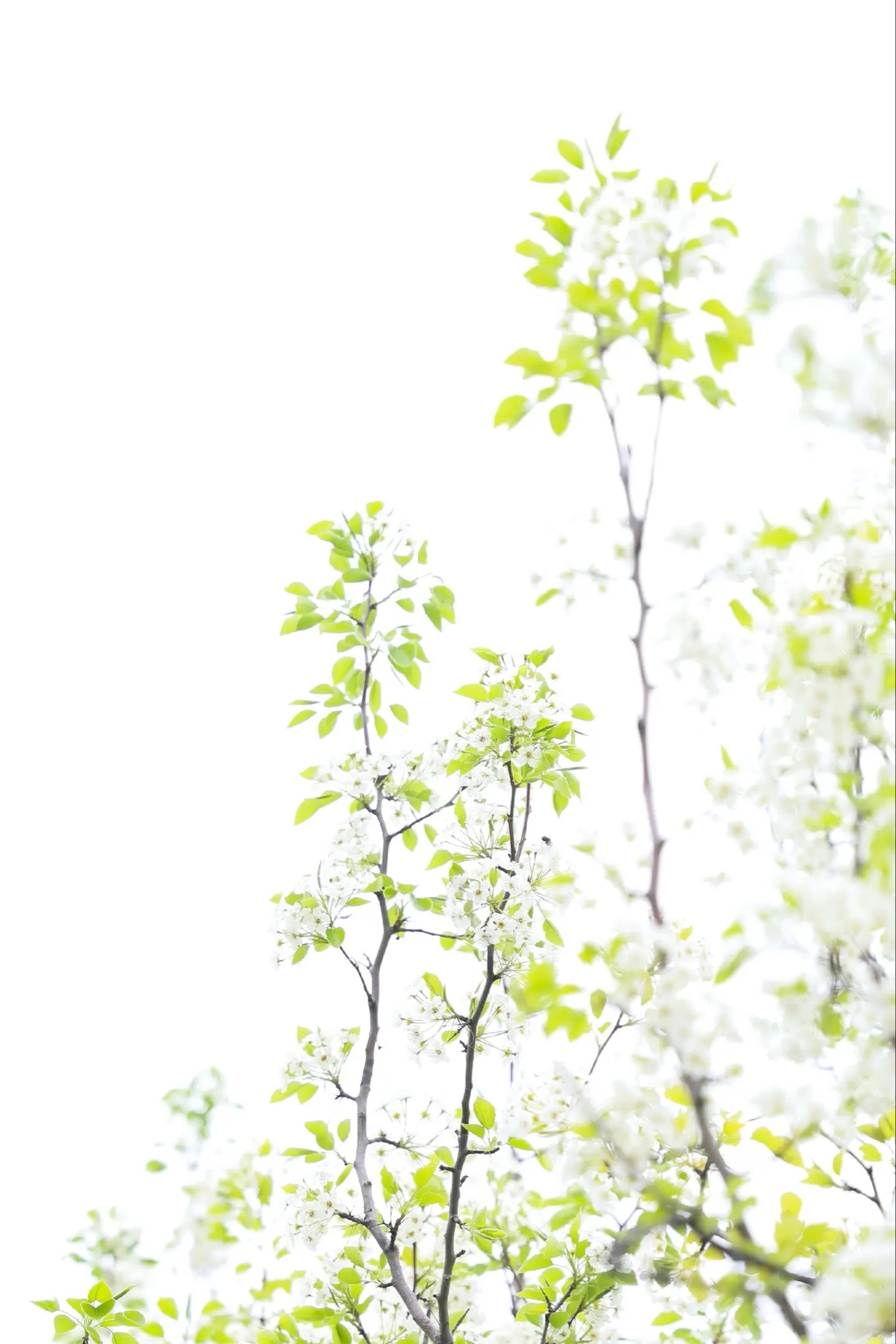 枝头梨花初绽,素白如雪,嫩绿新叶悄然探出。春光温柔,树梢间浮着薄薄的光晕,风过处,花瓣轻颤,似低语着未写完的诗。取一束柔和光线,框住这清冽的春日呼吸——原来最动人的花事,从不需要浓墨重彩。
