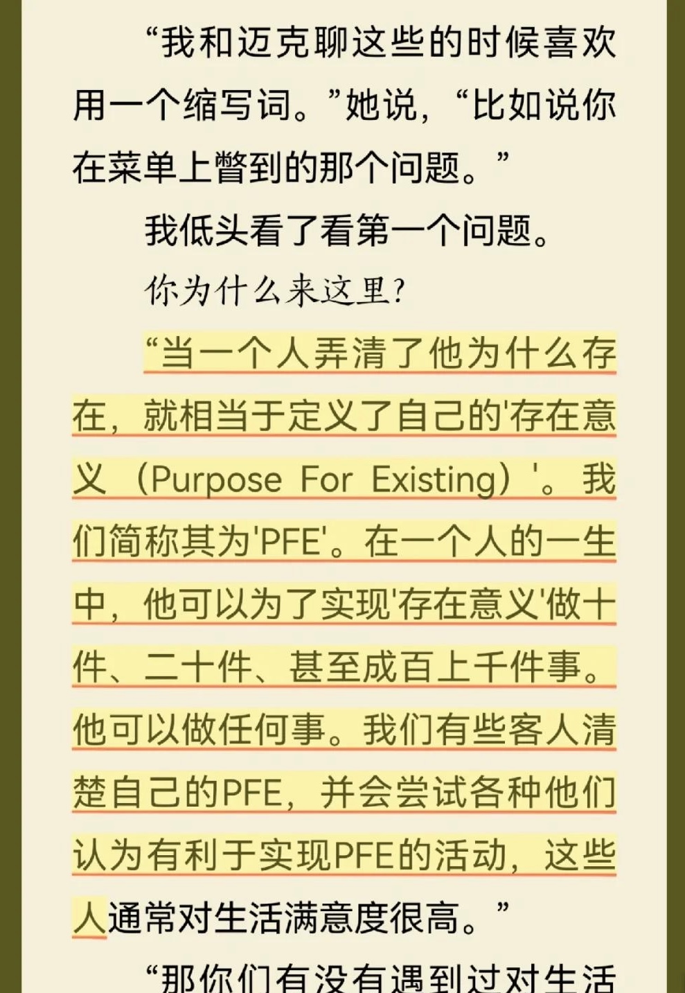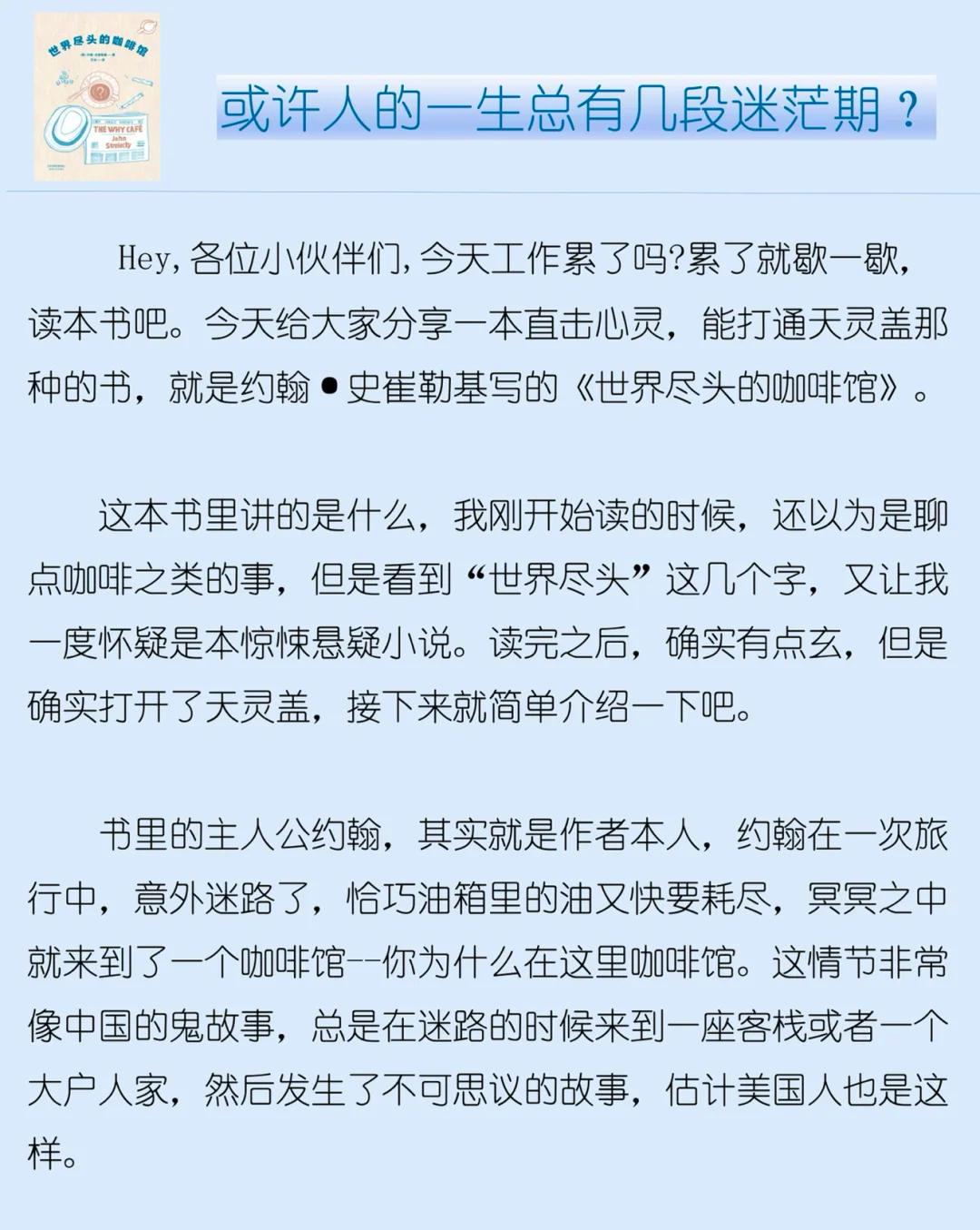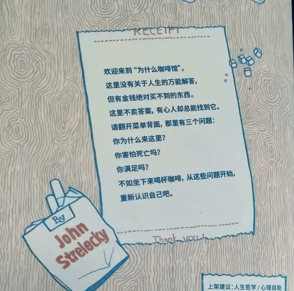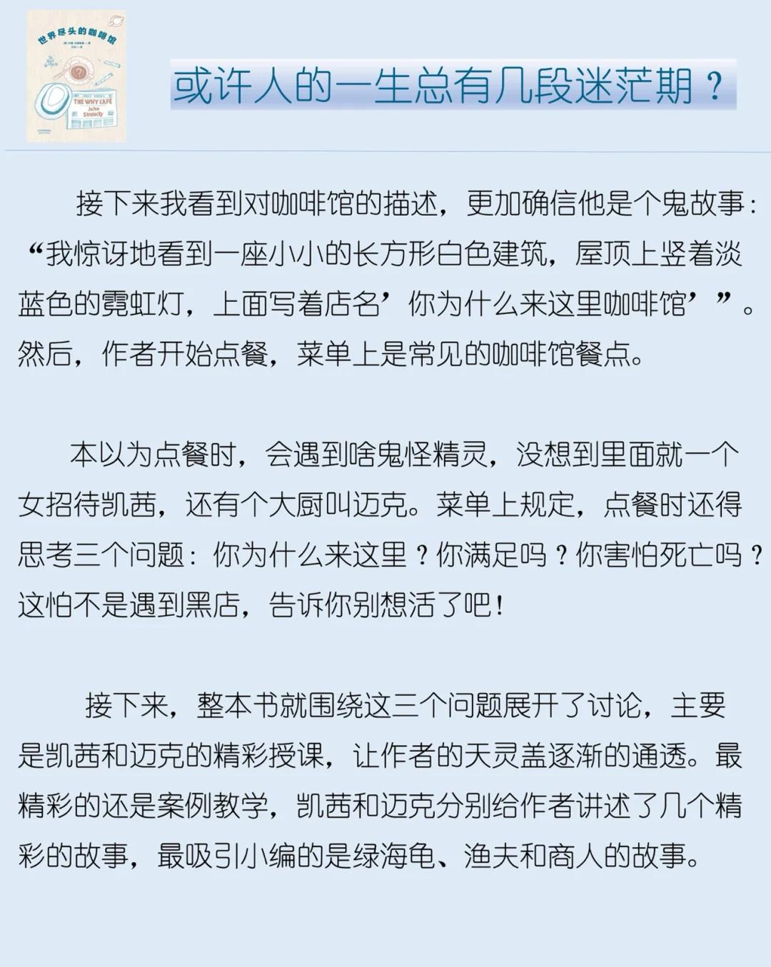 《世界尽头的咖啡馆》是潮新闻第十六期阅读活动我免费兑换到的书籍,想象一下,你正开车行驶在一条看不到尽头的公路上,人生突然陷入迷茫,不知去向何方。这时,路边出现一家名为“你为什么来这里咖啡馆”的神秘小店。走进去,菜单背面只有三个奇怪的问题:“你为什么来这里?”“你害怕死亡吗?”“你满足吗?” 这既是《世界尽头的咖啡馆》的开篇,也是它试图叩问每一个读者的灵魂谜题。作者约翰·史崔勒基(John Strelecky)用一段充满奇幻色彩的经历,引领人们开启一场关于自我与存在的深度对话。 📖 作品简介与创作背景 这本书是美国作家约翰·史崔勒基的处女作。32岁那年,拥有MBA学位的他,虽拥有体面高薪的工作却倍感迷茫。于是,他选择与妻子踏上为期9个月、行程超过7万英里的环球之旅。归来后,他将亲身感悟写成了这本约5万字的自传体小说,起初自费出版,却意外风靡全球,被译成39种语言,成为激励无数人的经典。 📚 故事内容:“菜单背后的灵魂三问” 故事主角约翰因厌倦工作开车旅行,却被堵车和迷路所困。在汽油耗尽之际,他偶然发现了一家名为“你为什么来这里咖啡馆”的小店。在这里,他与店员凯茜(Casey)、老板迈克(Mike)以及顾客安妮(Anne)等几位陌生人展开对话,话题始终围绕着菜单背面那三个看似简单却直抵内心的问题。 ✨ 核心思想:拥抱你的“PFE” 书中将这三个问题凝练为一个核心概念:PFE(Purpose For Existing),即“存在的意义”。为阐释这一概念,作者用了几个精妙的比喻: · 🐢 绿海龟的故事:海龟从不与海浪相争,反浪时保存体力,顺浪时借力前行。这启发我们,面对那些消耗精力的“反向浪”(如无效社交、机械工作),要学会保存实力,将能量聚焦于真正重要的事。 · 🎣 商人与渔夫:商人劝渔夫多捕鱼挣钱以便未来享受,而渔夫反问,他现在享受的陪伴家人、看夕阳,不正是商人奋斗的终点吗?这直指一个矛盾:我们是否在为某个“未来的幸福”而错过了当下的生活。 · 🏌️ 高尔夫球的故事:主角曾因“球场”环境艰苦而放弃打球,后通过“移走障碍物”解决了问题。这象征着我们有能力为自己移走限制性信念,主动选择人生道路。 📖 作品鉴赏:一场温柔而深刻的对话 · 寓言叙事,亲和有力:将哲理融入“偶遇咖啡馆”的奇幻故事,打破了传统说教的距离感。 · “灵魂三问”,直击核心:从“你为什么来这里?”(寻找目标)、“你害怕死亡吗?”(检视行动)到“你满足吗?”(评估状态),构成了一套完整的自我审视逻辑。 · 直觉与善意,情感共鸣:作者并非依靠严密的逻辑论证,而是用直觉和善意引导读者去感受内心渴望。 · 风格清新,短小精悍:全书仅5万字,文字温暖平实,适合在安静午后一口气读完,并在心中留下悠长回响。 🤔 多维度评价 · 🎯 支持者:温柔的心灵指南针:许多读者认为它是现代社会的解药,提供了一条摆脱迷茫、寻找自我的清晰路径。它像一位耐心的朋友,教会你反思日常,勇敢追求热爱。 · ⚖️ 中立者:有益的“引路石”:不少读者认可其作为“入门读物”的价值,认为它提出了一个好问题,能激发自我探索,尤其适合处于迷茫期的人。但它更适合作为起点而非终点。 · 🤨 质疑者:过度简化的“鸡汤”:批判者指出,它作为哲学小说深度不足,情节平淡、角色单薄。书中将复杂的人生意义简化为“做自己热爱的事”,并忽略现实障碍,显得过于理想化。 💎 总结:它是一场邀请,而非答案 《世界尽头的咖啡馆》并非一部精密的哲学论著,它更像一份来自未知世界的邀请,引导我们停下脚步,思考那些真正重要的问题。在充满喧嚣和单一成功标准的时代,它温和地提醒我们,人生的意义不需要他人赋予,而在于你自己的体验和定义。走进这家咖啡馆并非终点,它只是漫长探索旅程的开始。