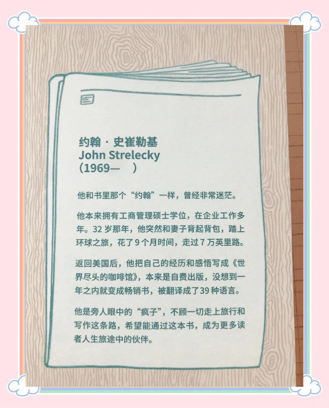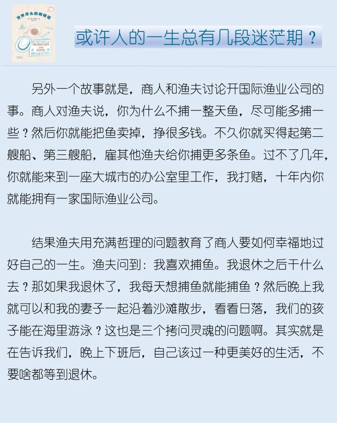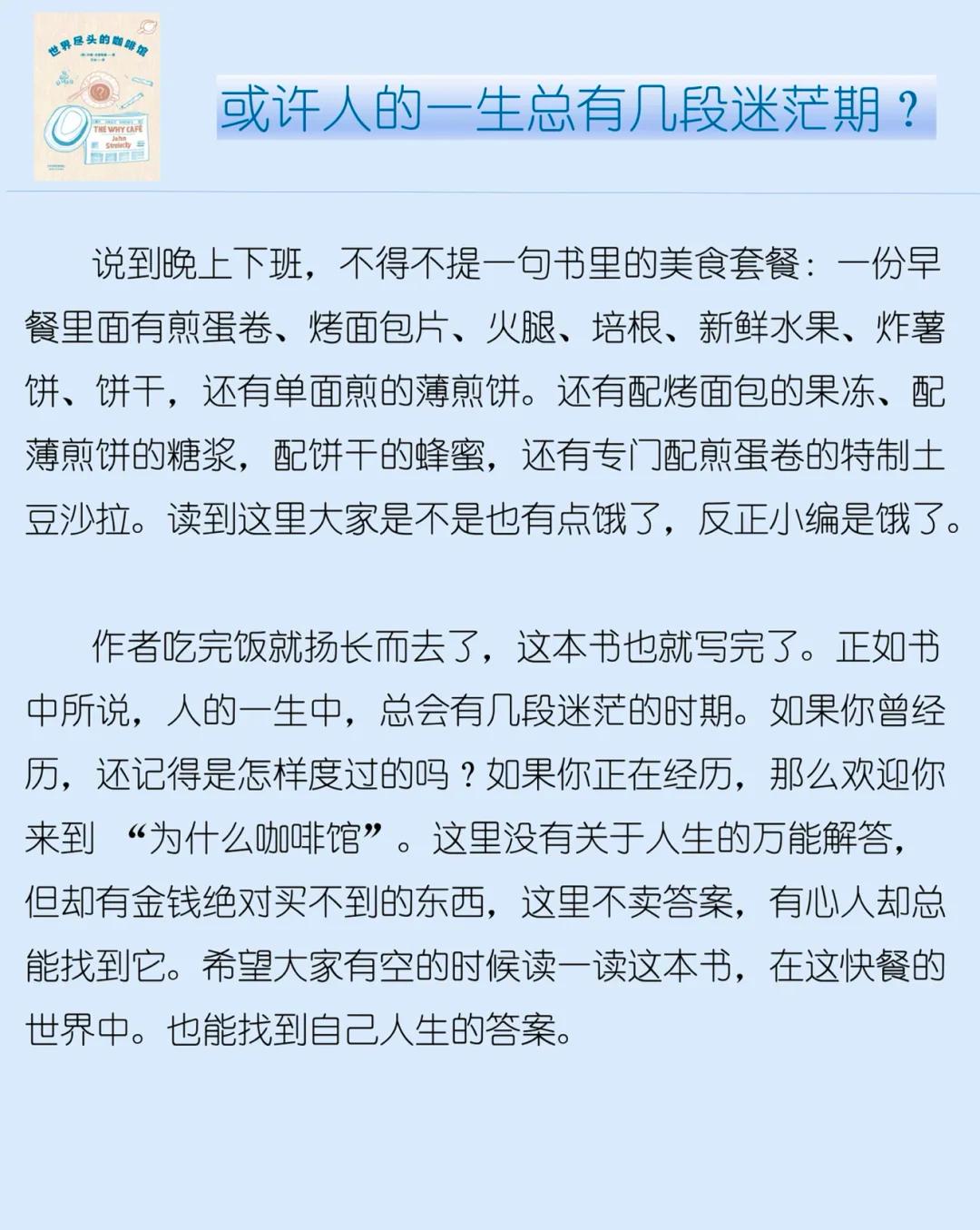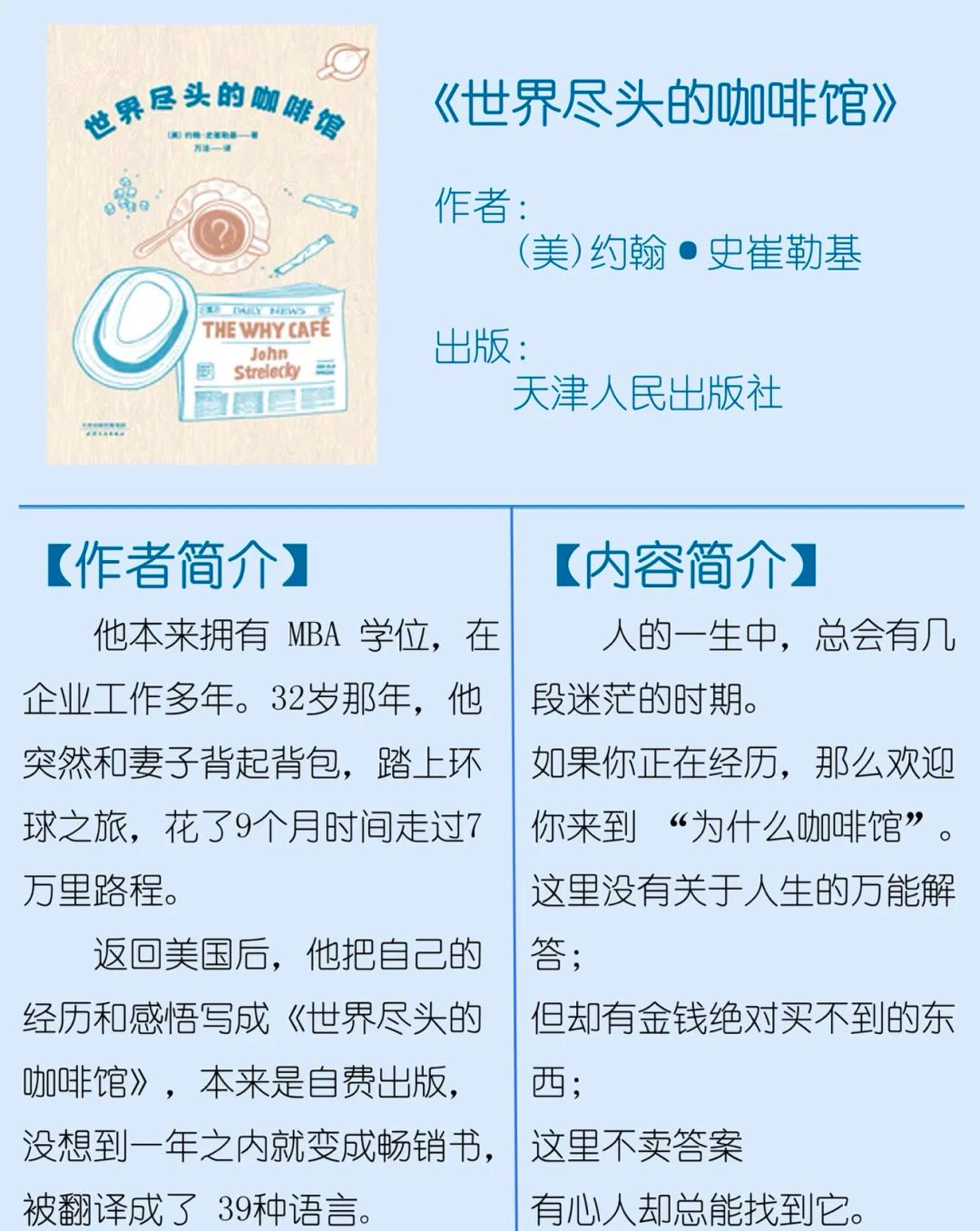 《世界尽头的咖啡馆》是潮新闻第十六期阅读活动我免费兑换到的书籍,想象一下,你正开车行驶在一条看不到尽头的公路上,人生突然陷入迷茫,不知去向何方。这时,路边出现一家名为“你为什么来这里咖啡馆”的神秘小店。走进去,菜单背面只有三个奇怪的问题:“你为什么来这里?”“你害怕死亡吗?”“你满足吗?” 这既是《世界尽头的咖啡馆》的开篇,也是它试图叩问每一个读者的灵魂谜题。作者约翰·史崔勒基(John Strelecky)用一段充满奇幻色彩的经历,引领人们开启一场关于自我与存在的深度对话。 📖 作品简介与创作背景 这本书是美国作家约翰·史崔勒基的处女作。32岁那年,拥有MBA学位的他,虽拥有体面高薪的工作却倍感迷茫。于是,他选择与妻子踏上为期9个月、行程超过7万英里的环球之旅。归来后,他将亲身感悟写成了这本约5万字的自传体小说,起初自费出版,却意外风靡全球,被译成39种语言,成为激励无数人的经典。 📚 故事内容:“菜单背后的灵魂三问” 故事主角约翰因厌倦工作开车旅行,却被堵车和迷路所困。在汽油耗尽之际,他偶然发现了一家名为“你为什么来这里咖啡馆”的小店。在这里,他与店员凯茜(Casey)、老板迈克(Mike)以及顾客安妮(Anne)等几位陌生人展开对话,话题始终围绕着菜单背面那三个看似简单却直抵内心的问题。 ✨ 核心思想:拥抱你的“PFE” 书中将这三个问题凝练为一个核心概念:PFE(Purpose For Existing),即“存在的意义”。为阐释这一概念,作者用了几个精妙的比喻: · 🐢 绿海龟的故事:海龟从不与海浪相争,反浪时保存体力,顺浪时借力前行。这启发我们,面对那些消耗精力的“反向浪”(如无效社交、机械工作),要学会保存实力,将能量聚焦于真正重要的事。 · 🎣 商人与渔夫:商人劝渔夫多捕鱼挣钱以便未来享受,而渔夫反问,他现在享受的陪伴家人、看夕阳,不正是商人奋斗的终点吗?这直指一个矛盾:我们是否在为某个“未来的幸福”而错过了当下的生活。 · 🏌️ 高尔夫球的故事:主角曾因“球场”环境艰苦而放弃打球,后通过“移走障碍物”解决了问题。这象征着我们有能力为自己移走限制性信念,主动选择人生道路。 📖 作品鉴赏:一场温柔而深刻的对话 · 寓言叙事,亲和有力:将哲理融入“偶遇咖啡馆”的奇幻故事,打破了传统说教的距离感。 · “灵魂三问”,直击核心:从“你为什么来这里?”(寻找目标)、“你害怕死亡吗?”(检视行动)到“你满足吗?”(评估状态),构成了一套完整的自我审视逻辑。 · 直觉与善意,情感共鸣:作者并非依靠严密的逻辑论证,而是用直觉和善意引导读者去感受内心渴望。 · 风格清新,短小精悍:全书仅5万字,文字温暖平实,适合在安静午后一口气读完,并在心中留下悠长回响。 🤔 多维度评价 · 🎯 支持者:温柔的心灵指南针:许多读者认为它是现代社会的解药,提供了一条摆脱迷茫、寻找自我的清晰路径。它像一位耐心的朋友,教会你反思日常,勇敢追求热爱。 · ⚖️ 中立者:有益的“引路石”:不少读者认可其作为“入门读物”的价值,认为它提出了一个好问题,能激发自我探索,尤其适合处于迷茫期的人。但它更适合作为起点而非终点。 · 🤨 质疑者:过度简化的“鸡汤”:批判者指出,它作为哲学小说深度不足,情节平淡、角色单薄。书中将复杂的人生意义简化为“做自己热爱的事”,并忽略现实障碍,显得过于理想化。 💎 总结:它是一场邀请,而非答案 《世界尽头的咖啡馆》并非一部精密的哲学论著,它更像一份来自未知世界的邀请,引导我们停下脚步,思考那些真正重要的问题。在充满喧嚣和单一成功标准的时代,它温和地提醒我们,人生的意义不需要他人赋予,而在于你自己的体验和定义。走进这家咖啡馆并非终点,它只是漫长探索旅程的开始。