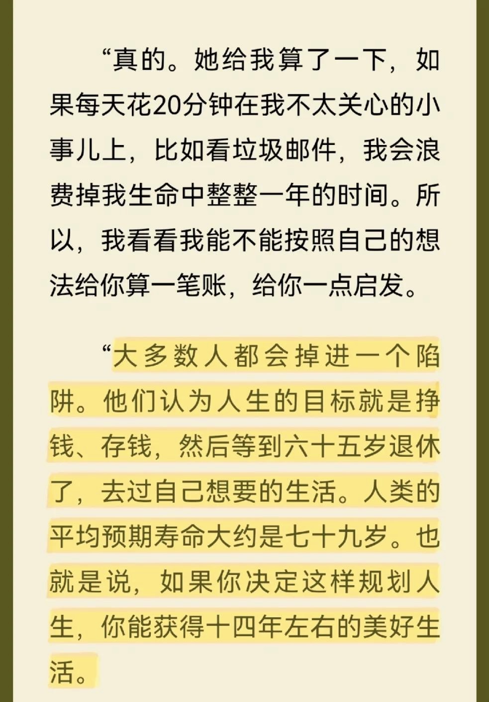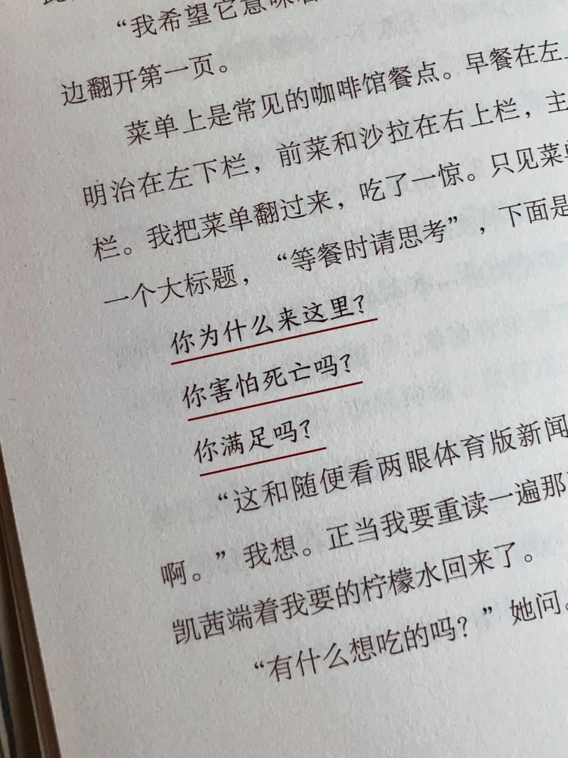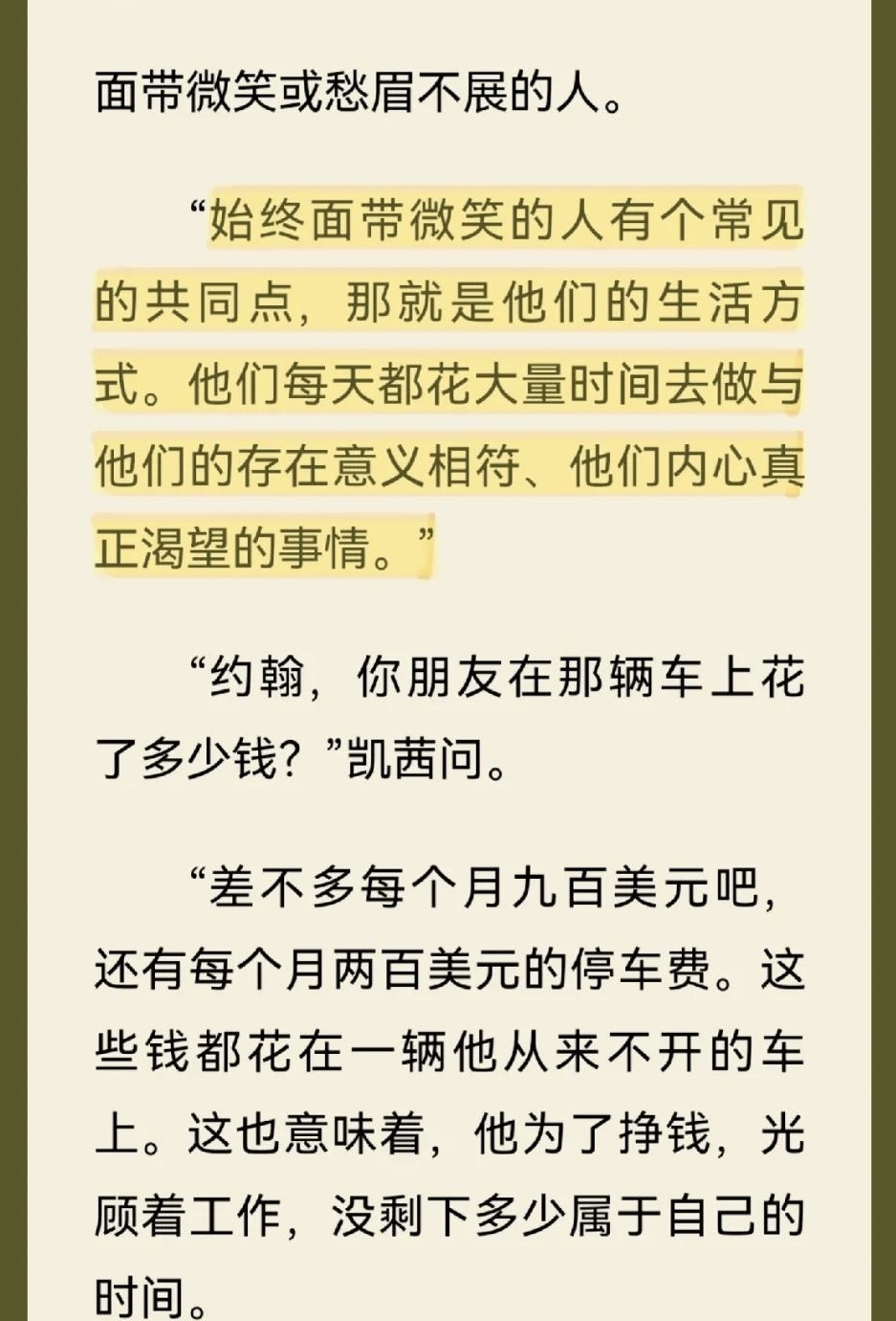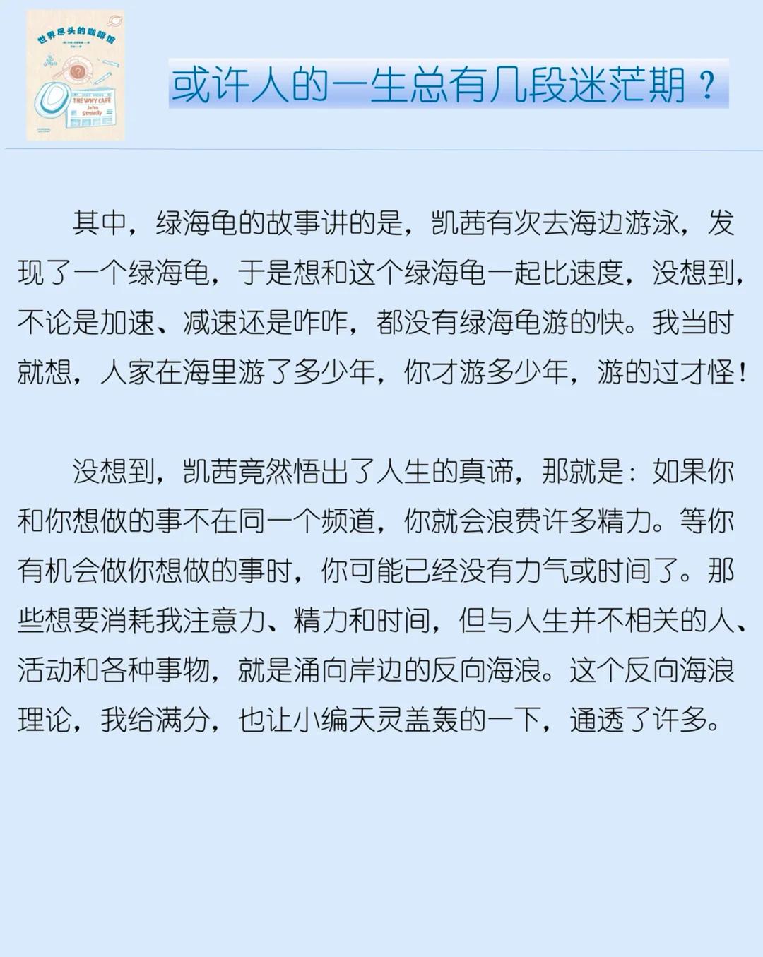 《世界尽头的咖啡馆》是潮新闻第十六期阅读活动我免费兑换到的书籍,想象一下,你正开车行驶在一条看不到尽头的公路上,人生突然陷入迷茫,不知去向何方。这时,路边出现一家名为“你为什么来这里咖啡馆”的神秘小店。走进去,菜单背面只有三个奇怪的问题:“你为什么来这里?”“你害怕死亡吗?”“你满足吗?” 这既是《世界尽头的咖啡馆》的开篇,也是它试图叩问每一个读者的灵魂谜题。作者约翰·史崔勒基(John Strelecky)用一段充满奇幻色彩的经历,引领人们开启一场关于自我与存在的深度对话。 📖 作品简介与创作背景 这本书是美国作家约翰·史崔勒基的处女作。32岁那年,拥有MBA学位的他,虽拥有体面高薪的工作却倍感迷茫。于是,他选择与妻子踏上为期9个月、行程超过7万英里的环球之旅。归来后,他将亲身感悟写成了这本约5万字的自传体小说,起初自费出版,却意外风靡全球,被译成39种语言,成为激励无数人的经典。 📚 故事内容:“菜单背后的灵魂三问” 故事主角约翰因厌倦工作开车旅行,却被堵车和迷路所困。在汽油耗尽之际,他偶然发现了一家名为“你为什么来这里咖啡馆”的小店。在这里,他与店员凯茜(Casey)、老板迈克(Mike)以及顾客安妮(Anne)等几位陌生人展开对话,话题始终围绕着菜单背面那三个看似简单却直抵内心的问题。 ✨ 核心思想:拥抱你的“PFE” 书中将这三个问题凝练为一个核心概念:PFE(Purpose For Existing),即“存在的意义”。为阐释这一概念,作者用了几个精妙的比喻: · 🐢 绿海龟的故事:海龟从不与海浪相争,反浪时保存体力,顺浪时借力前行。这启发我们,面对那些消耗精力的“反向浪”(如无效社交、机械工作),要学会保存实力,将能量聚焦于真正重要的事。 · 🎣 商人与渔夫:商人劝渔夫多捕鱼挣钱以便未来享受,而渔夫反问,他现在享受的陪伴家人、看夕阳,不正是商人奋斗的终点吗?这直指一个矛盾:我们是否在为某个“未来的幸福”而错过了当下的生活。 · 🏌️ 高尔夫球的故事:主角曾因“球场”环境艰苦而放弃打球,后通过“移走障碍物”解决了问题。这象征着我们有能力为自己移走限制性信念,主动选择人生道路。 📖 作品鉴赏:一场温柔而深刻的对话 · 寓言叙事,亲和有力:将哲理融入“偶遇咖啡馆”的奇幻故事,打破了传统说教的距离感。 · “灵魂三问”,直击核心:从“你为什么来这里?”(寻找目标)、“你害怕死亡吗?”(检视行动)到“你满足吗?”(评估状态),构成了一套完整的自我审视逻辑。 · 直觉与善意,情感共鸣:作者并非依靠严密的逻辑论证,而是用直觉和善意引导读者去感受内心渴望。 · 风格清新,短小精悍:全书仅5万字,文字温暖平实,适合在安静午后一口气读完,并在心中留下悠长回响。 🤔 多维度评价 · 🎯 支持者:温柔的心灵指南针:许多读者认为它是现代社会的解药,提供了一条摆脱迷茫、寻找自我的清晰路径。它像一位耐心的朋友,教会你反思日常,勇敢追求热爱。 · ⚖️ 中立者:有益的“引路石”:不少读者认可其作为“入门读物”的价值,认为它提出了一个好问题,能激发自我探索,尤其适合处于迷茫期的人。但它更适合作为起点而非终点。 · 🤨 质疑者:过度简化的“鸡汤”:批判者指出,它作为哲学小说深度不足,情节平淡、角色单薄。书中将复杂的人生意义简化为“做自己热爱的事”,并忽略现实障碍,显得过于理想化。 💎 总结:它是一场邀请,而非答案 《世界尽头的咖啡馆》并非一部精密的哲学论著,它更像一份来自未知世界的邀请,引导我们停下脚步,思考那些真正重要的问题。在充满喧嚣和单一成功标准的时代,它温和地提醒我们,人生的意义不需要他人赋予,而在于你自己的体验和定义。走进这家咖啡馆并非终点,它只是漫长探索旅程的开始。