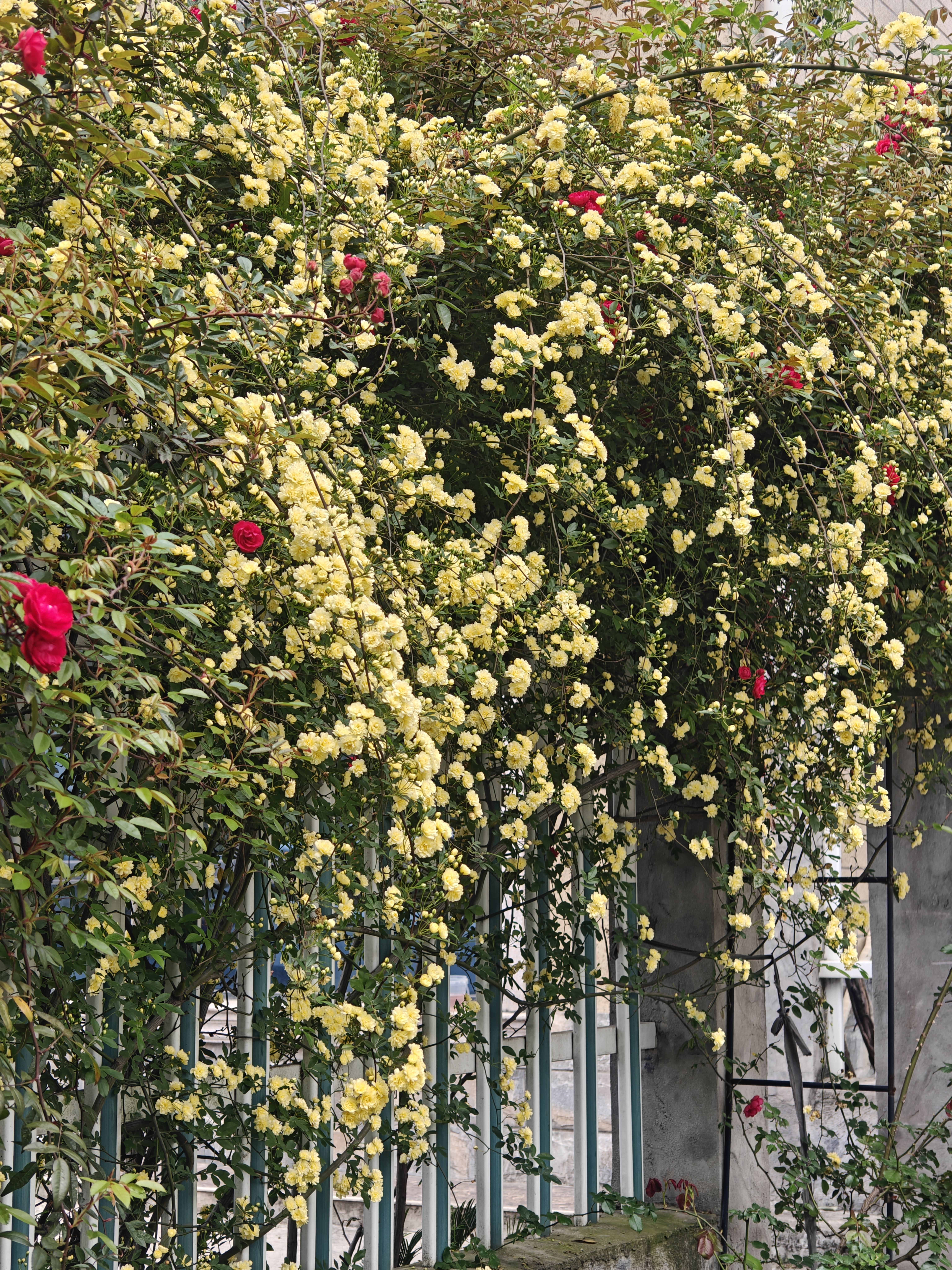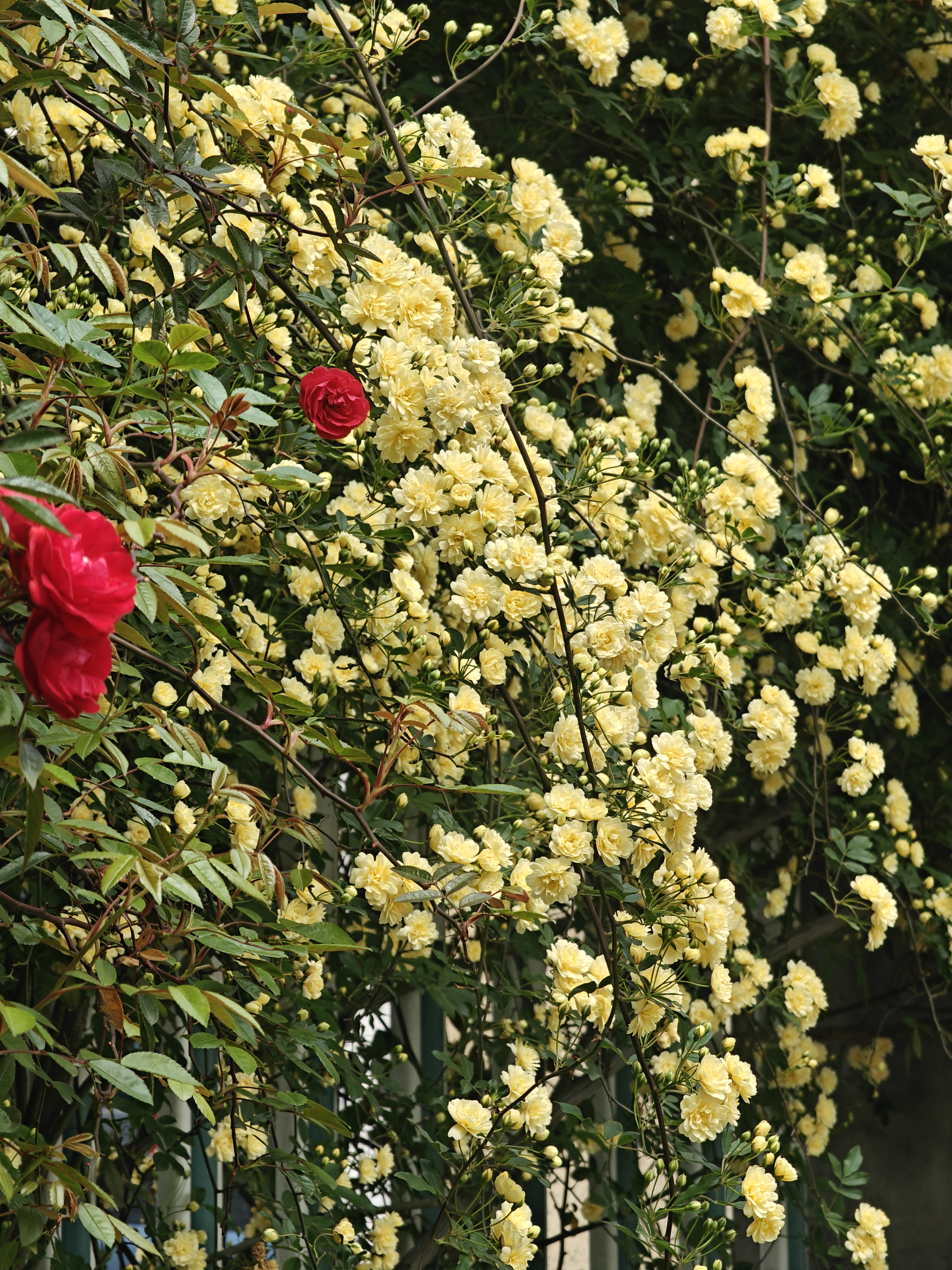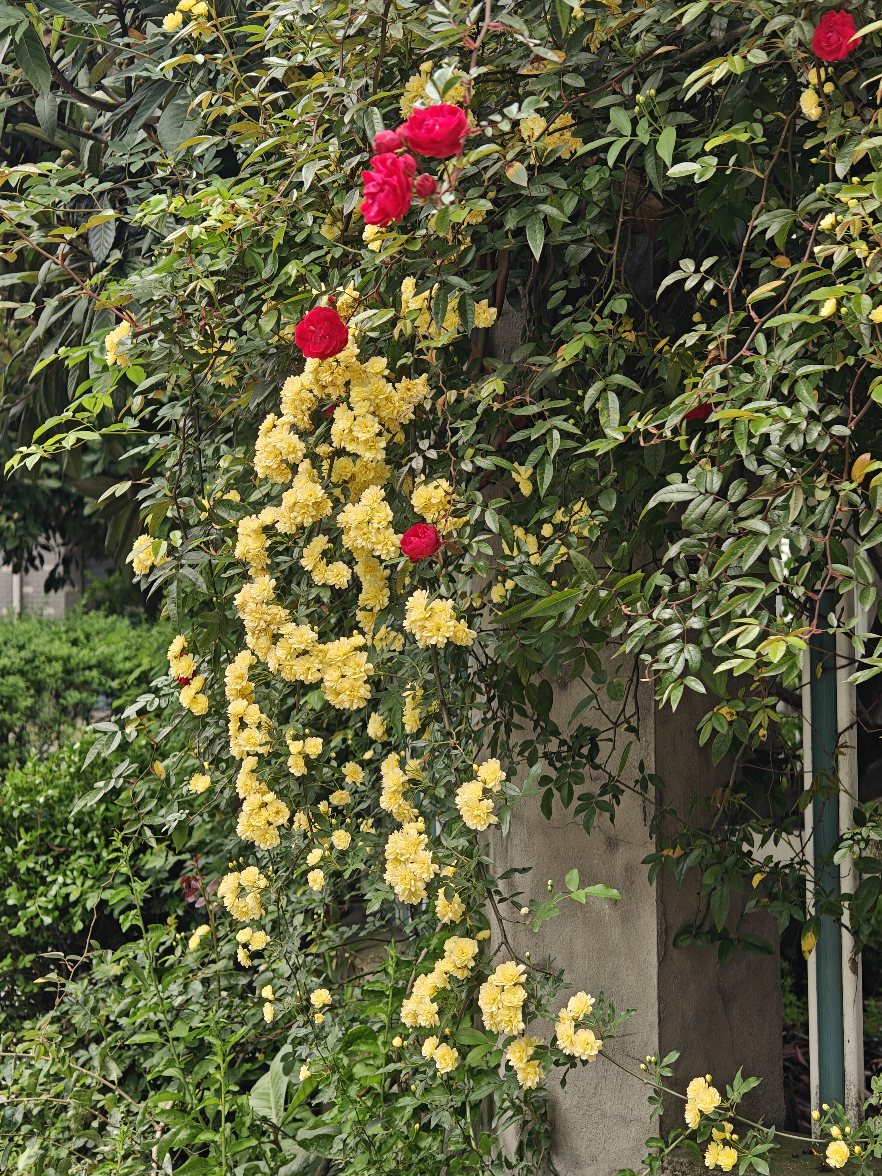 黄木香瀑布垂落,红玫瑰悄悄探头~春日花墙太上镜,随手一拍就是氛围感!