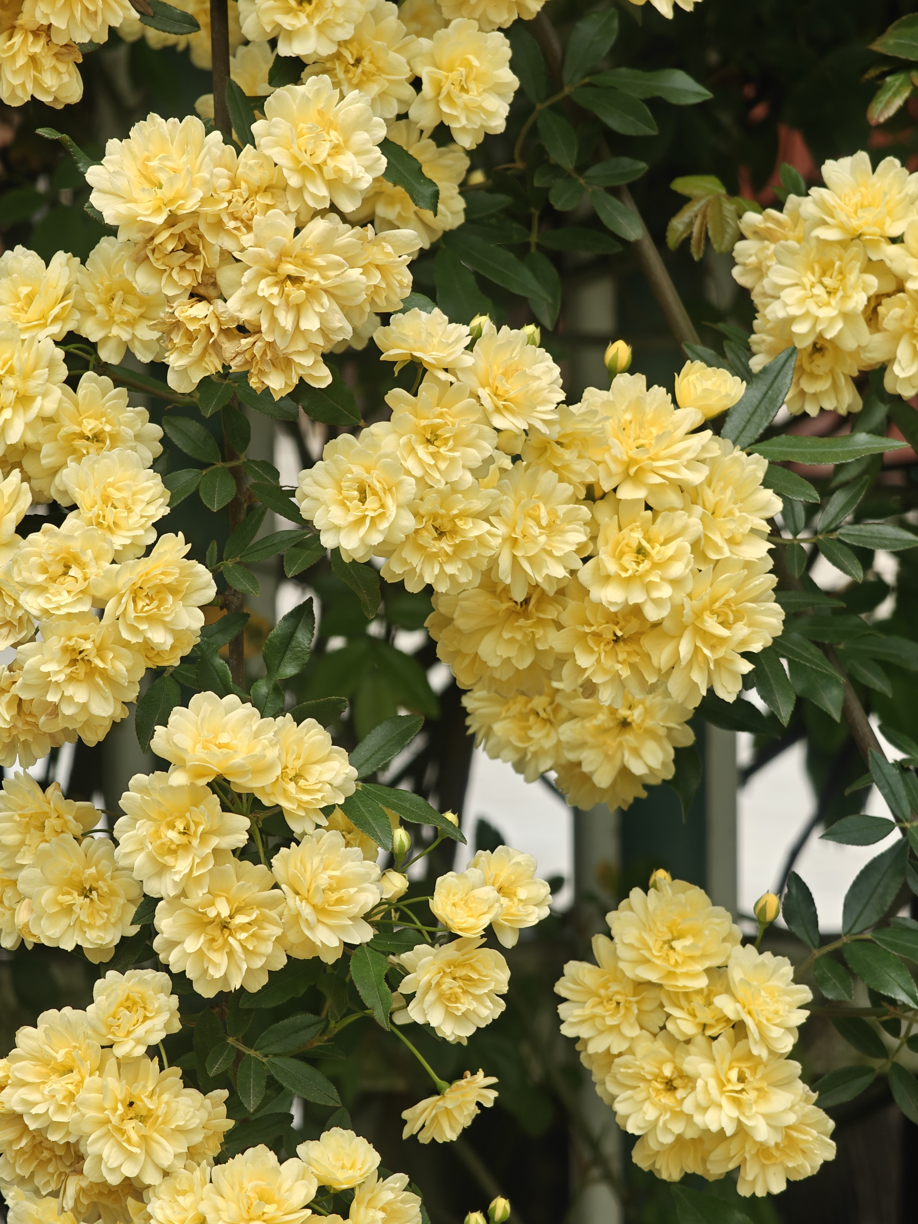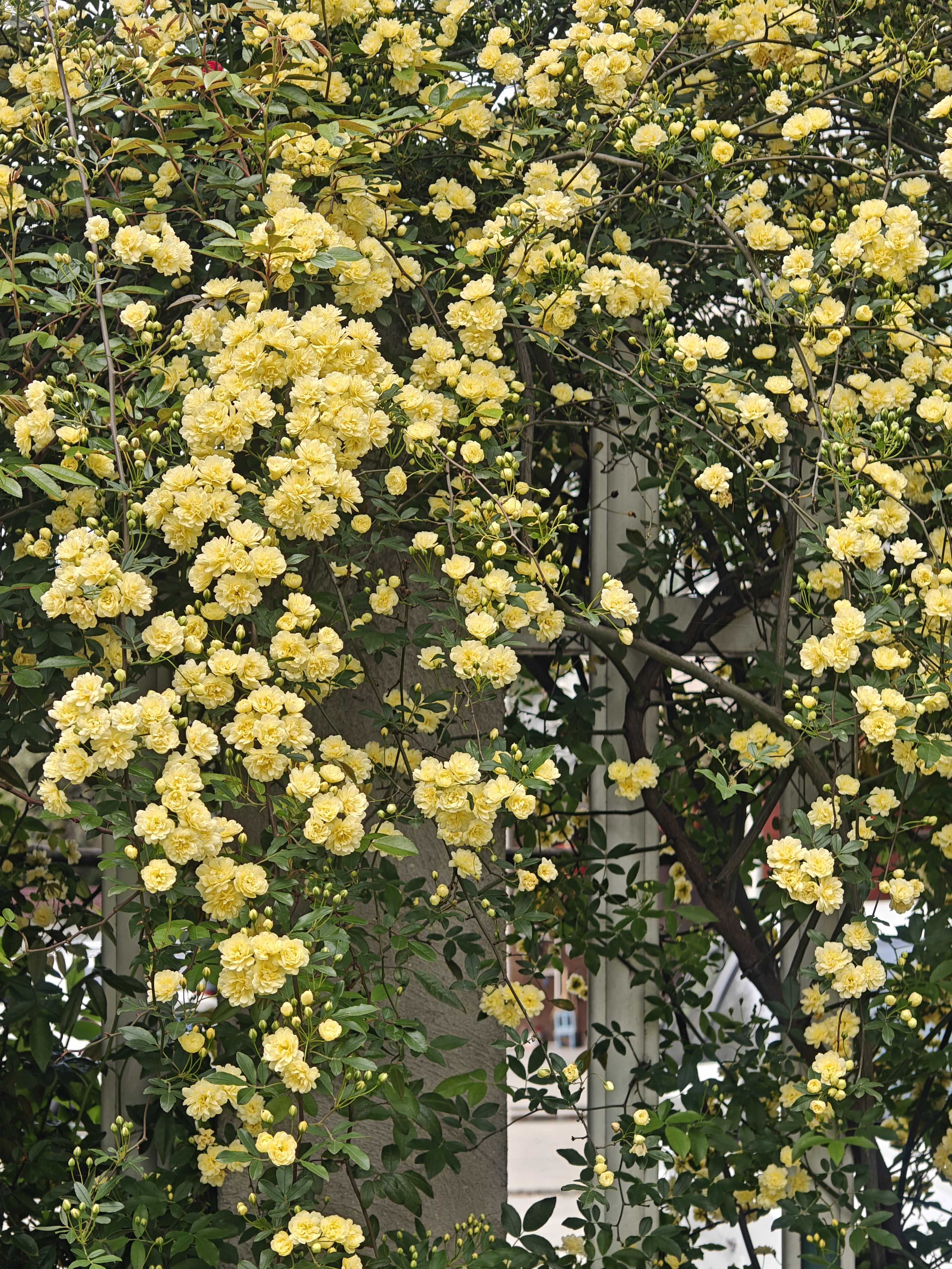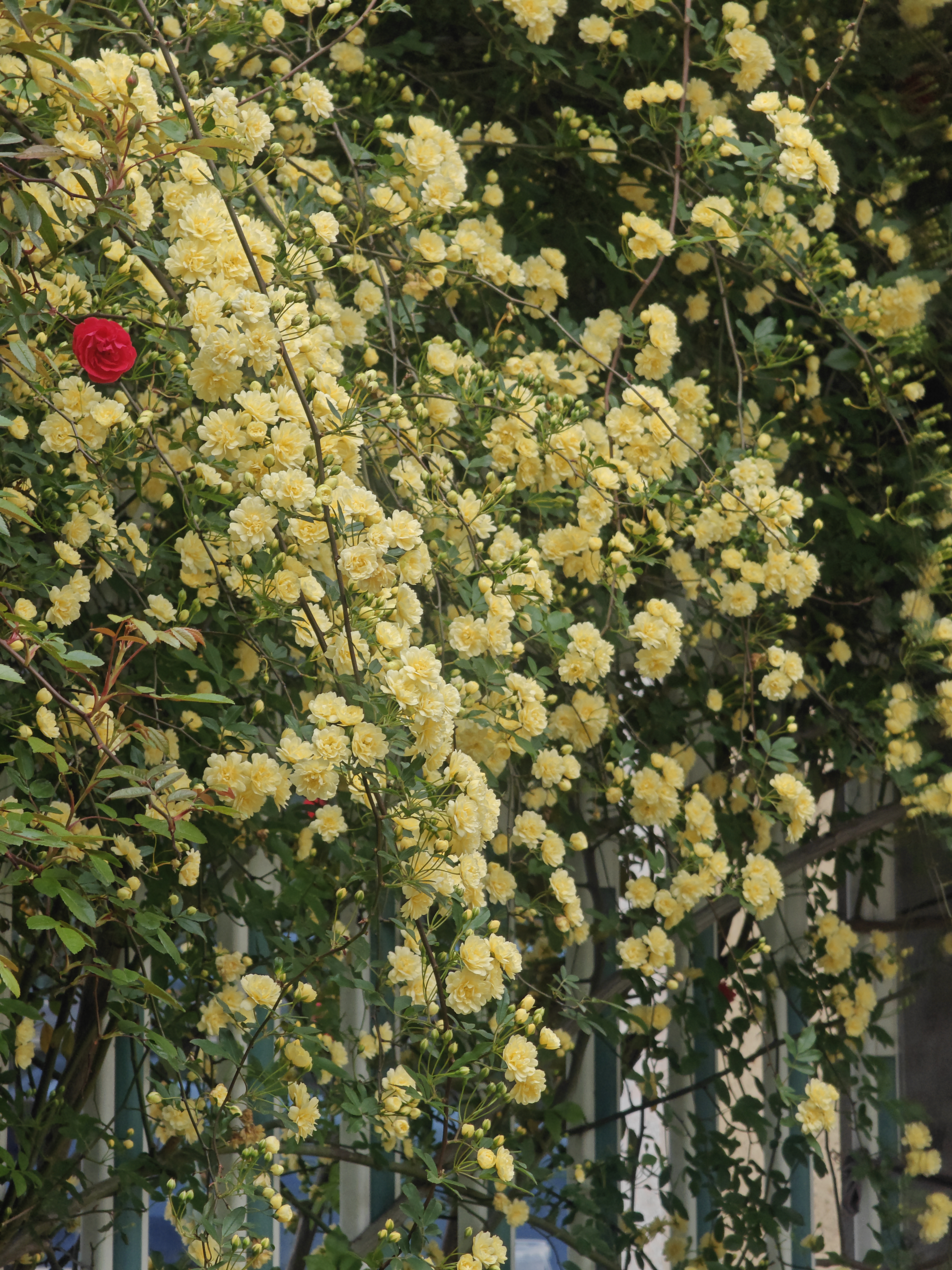 黄木香瀑布垂落,红玫瑰悄悄探头~春日花墙太上镜,随手一拍就是氛围感!