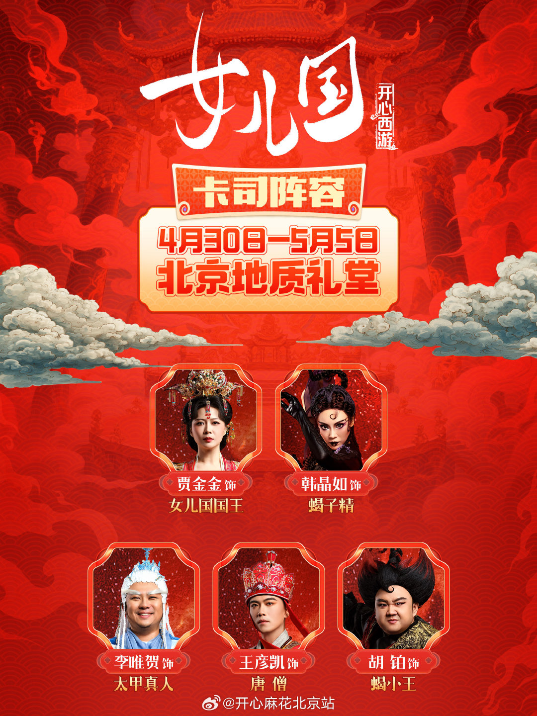 卡司集结就位,五一爆笑西游之旅启程!✅脑洞新编:取经路变天庭选秀真人秀,反套路剧情反转不断✅ 双强对决:女儿国国王×蝎子精高能对线,人妖羁绊张力拉满✅视听盛宴:高空威亚+杂技动作+电影级舞美,沉浸式幻境体验✅ 笑点密集:麻式幽默玩梗自然,全程包袱不断,合家欢适配五一来次白塔寺CITY WALK,顺路来看《开心西游·女儿国》快乐不散场!
