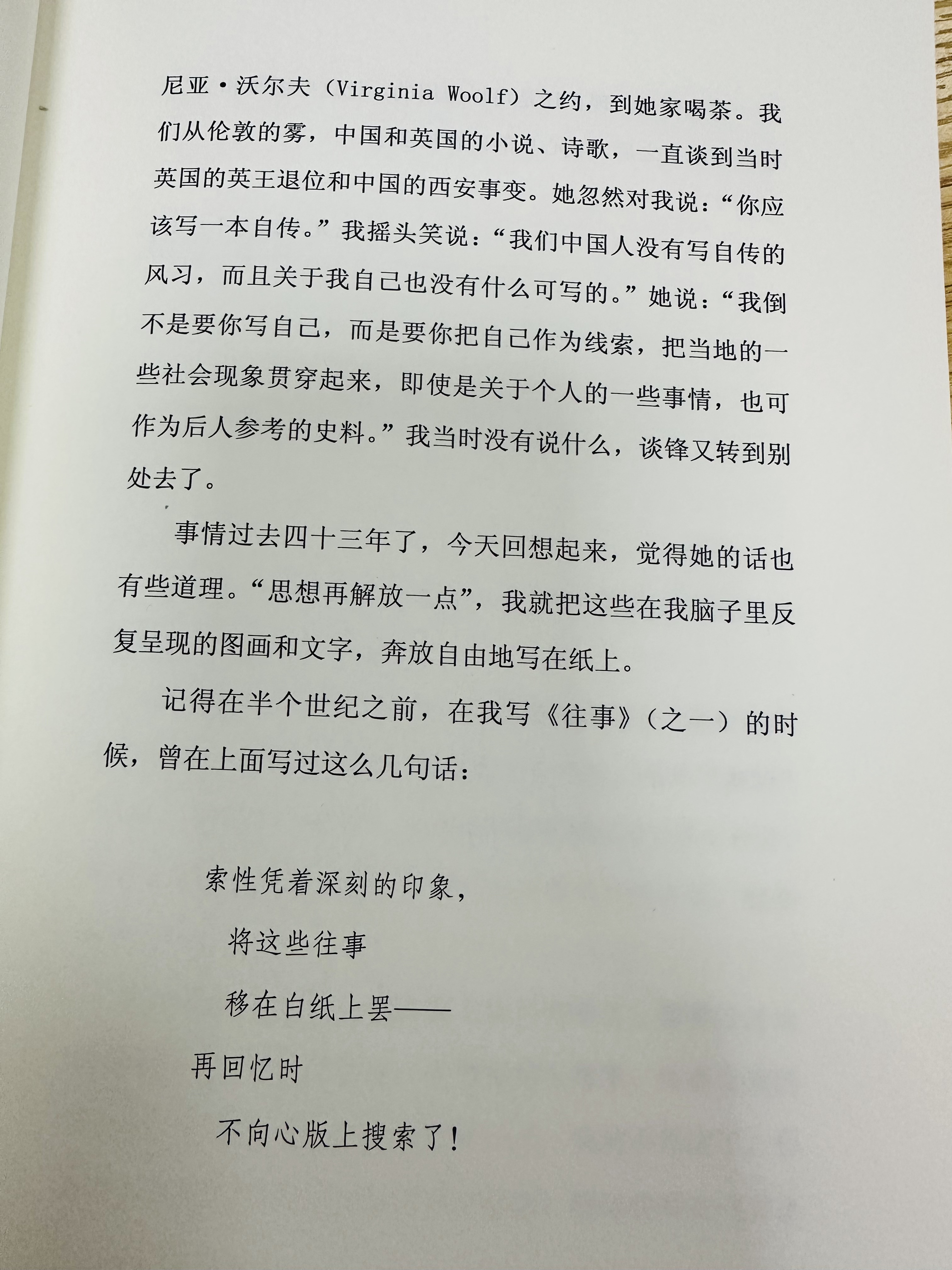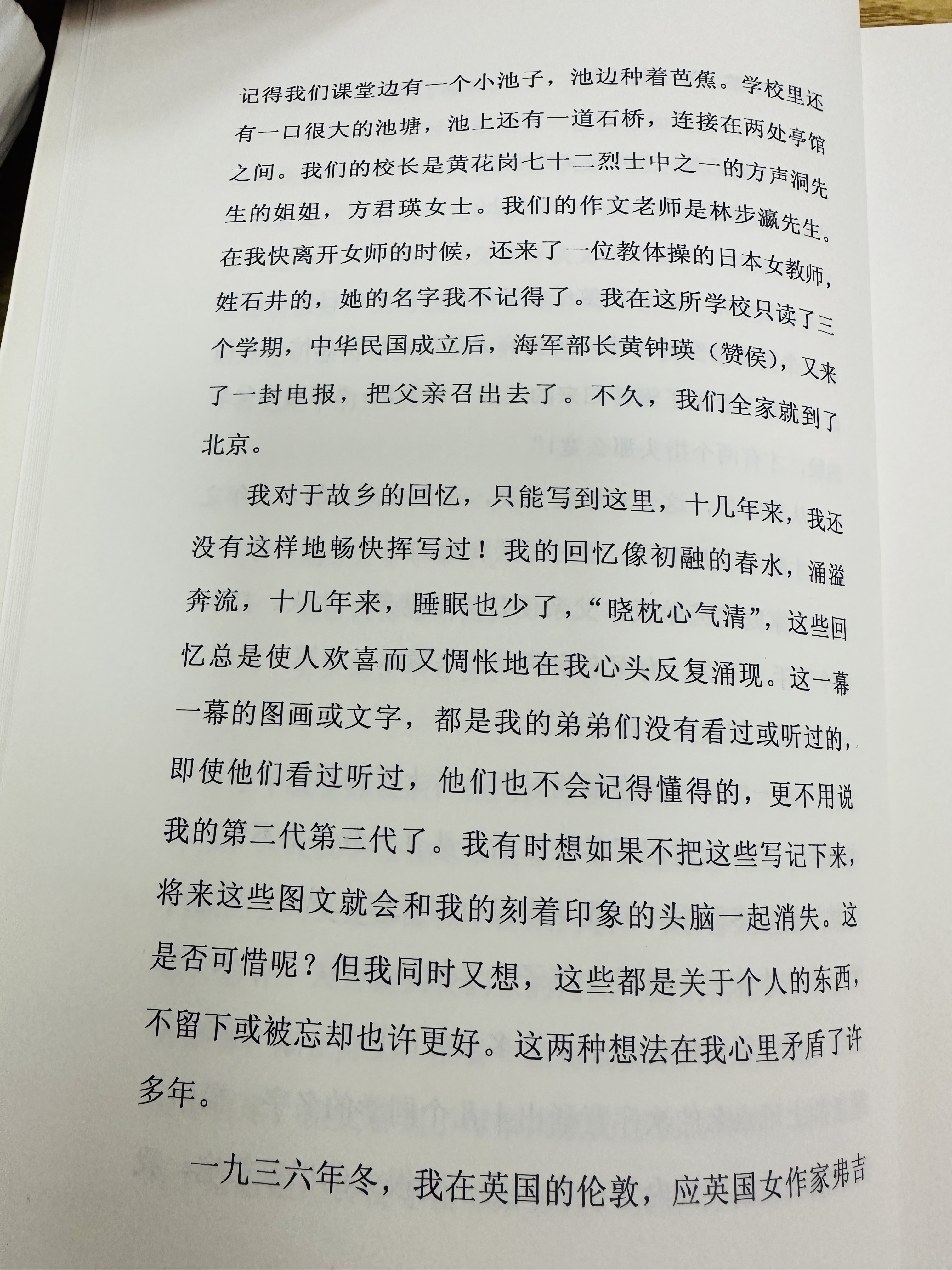我对于故乡的回忆,只能写到这里,十几年来,我还没有这样地畅快挥写过!我的回忆像初融的春水,涌溢奔流,十几年米,睡眠也少了,“晓枕心气清”,这些回忆总是使人欢喜而又惆怅地在我心头反复涌现。这一幕一幕的图画或文字,都是我的弟弟们没有看过或听过的,即使他们看过听过,他们也不会记得懂得的,更不用说我的第二代第三代了。我有时想如果不把这些写记下来,将来这些图文就会和我的刻着印象的头脑一起消失。这是否可惜呢?但我同时又想,这些都是关于个人的东西,不留下或被忘却也许更好。这两种想法在我心里矛盾了许多年。——冰心《繁星闪烁着》