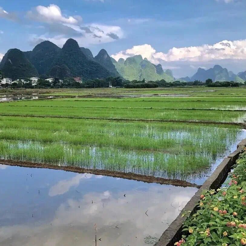 漓江边的稻田,梯田叠翠,水田倒影里藏着蓝天白云,随手一拍都是南方小清新~