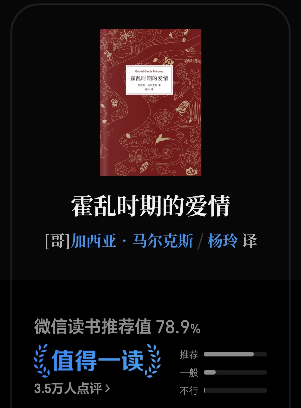 今天读到一篇文章说,在这个短视频时代,我们需要通过阅读去复健我们的文化体力,我非常认同这个观点。 看到有书友在阅读马尔克斯的《百年孤独》,又阅读到关于爱情的描述和这本书的介绍,于是我又打开了微信读书重温这本书。 《霍乱时期的爱情》主要讲述了弗洛伦蒂诺·阿里萨对费尔明娜·达萨一见钟情,少年恋情因女方父亲反对中断。费尔明娜嫁给医生乌尔比诺,弗洛伦蒂诺则用五十一年九个月零四天的等待,在医生去世后,以“一生一世”的告白,在挂着霍乱旗帜的船上重燃爱情。 在我看来, 费尔明娜是清醒的务实主义者。少年时她凭直觉斩断恋情,嫁给医生追求体面与安稳;晚年丧夫后,她看透弗洛伦蒂诺用622段风流填补的空虚,却最终接纳了这份“残缺的真实”。她不是被感动的被动者,而是在衰老中重新选择了爱情,既现实又浪漫,既妥协又反叛。
