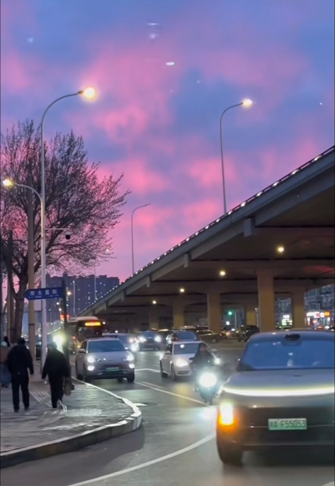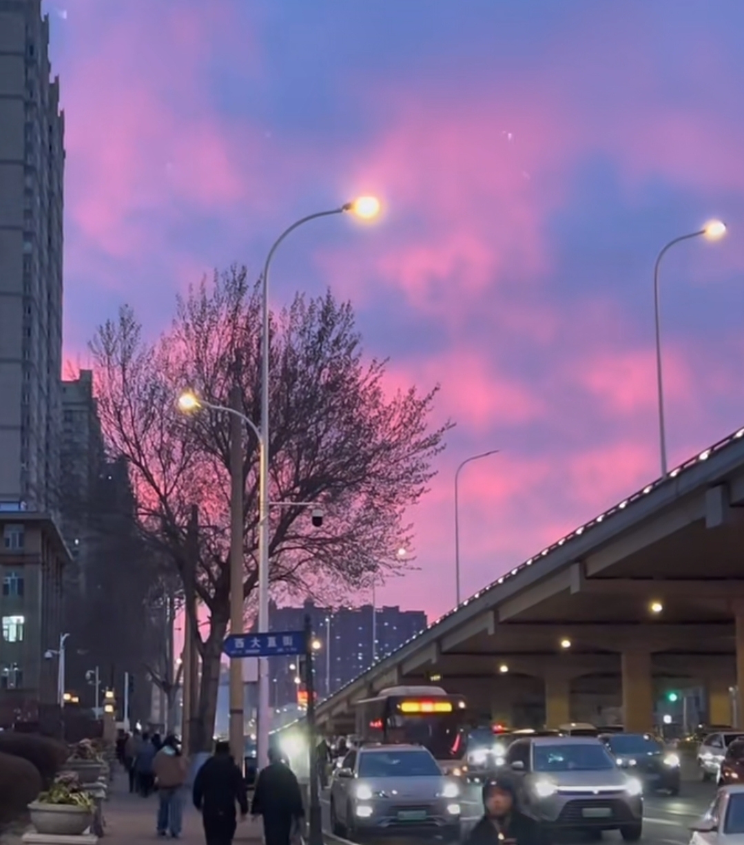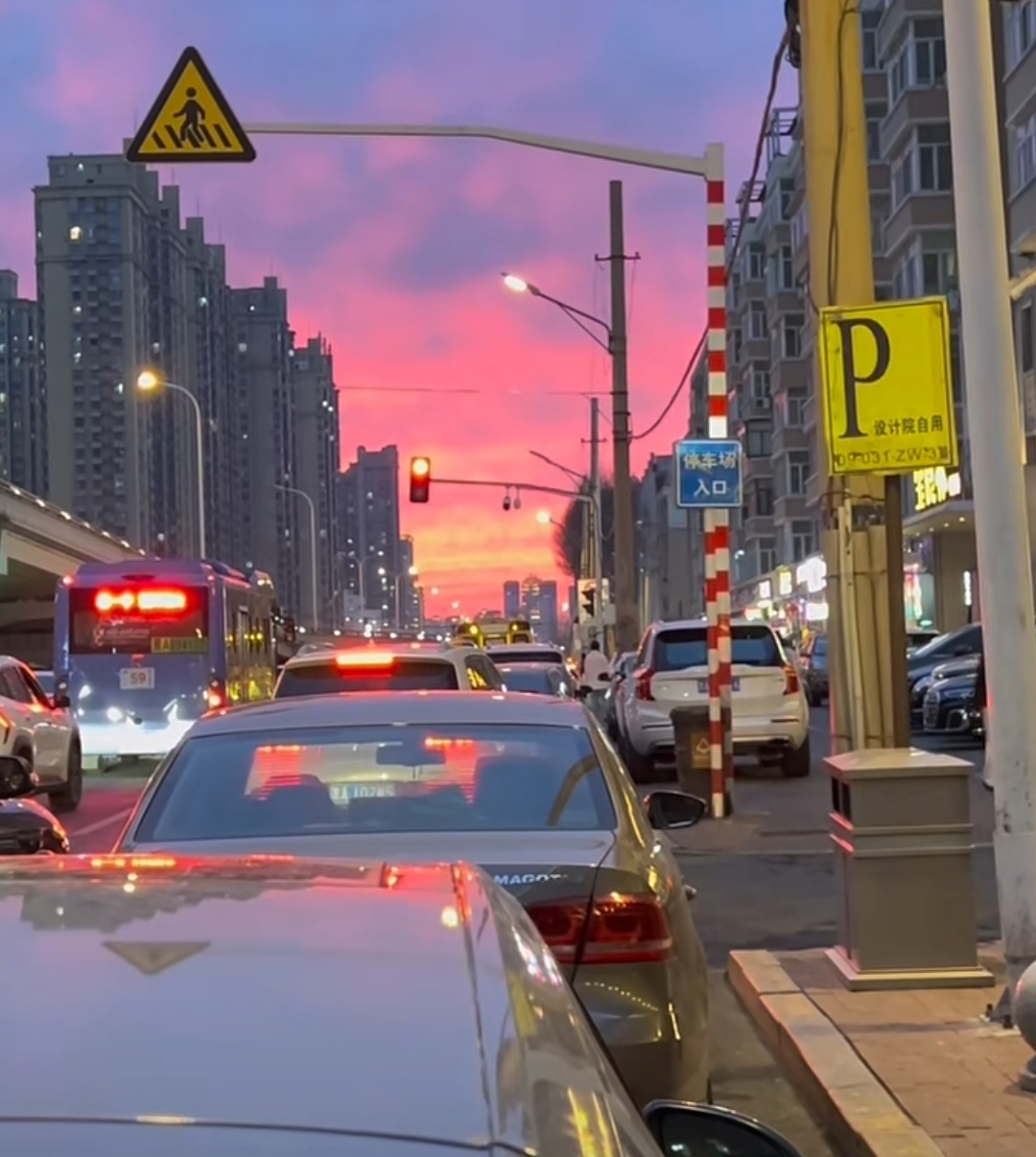 暮空凝粉,晚照流霞,把天际染成了半卷胭脂色。街灯次第亮起,暖光与漫天粉紫相融,桥下的车水马龙,都成了这温柔暮色里的流动诗行。风过树梢,人间烟火与天上云霞,在此刻温柔相逢。