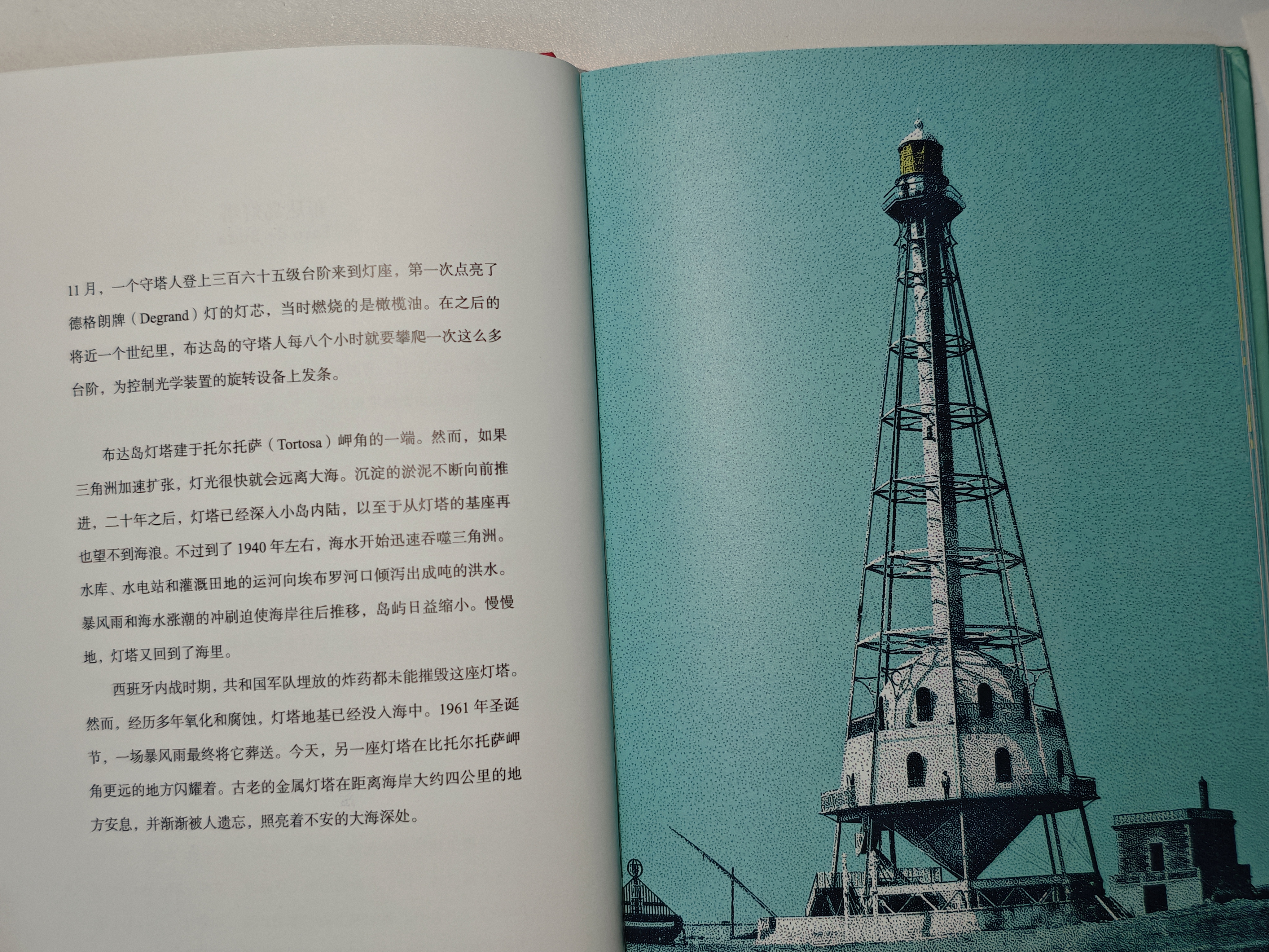 《世界尽头的灯塔》之布达岛灯塔 布达岛灯塔是一座充满传奇色彩的灯塔,它的独特之处在于建在一座“流动”的岛屿上,最终被大海吞噬。布达岛灯塔位于西班牙地中海沿岸的埃布罗河口三角洲,其所在的布达岛是由河流泥沙长期堆积而成的淤泥岛。 这座岛屿最奇特之处在于它并非固定不变,而是会随着水流和泥沙的沉积、冲刷而缓慢漂移,面积也时大时小。因此,建于19世纪的灯塔也随之“游走”,时而深入岛屿内陆,时而出现在海边,景象十分奇特。 由于岛屿本身极不稳定,灯塔的根基也逐渐受到侵蚀。自1864年建造以来,灯塔便随着岛屿慢慢下沉。 最终,在1961年圣诞节的一场猛烈暴风雨中,这座见证了无数船只航行的灯塔被彻底摧毁,葬身于狂暴的海洋之中。