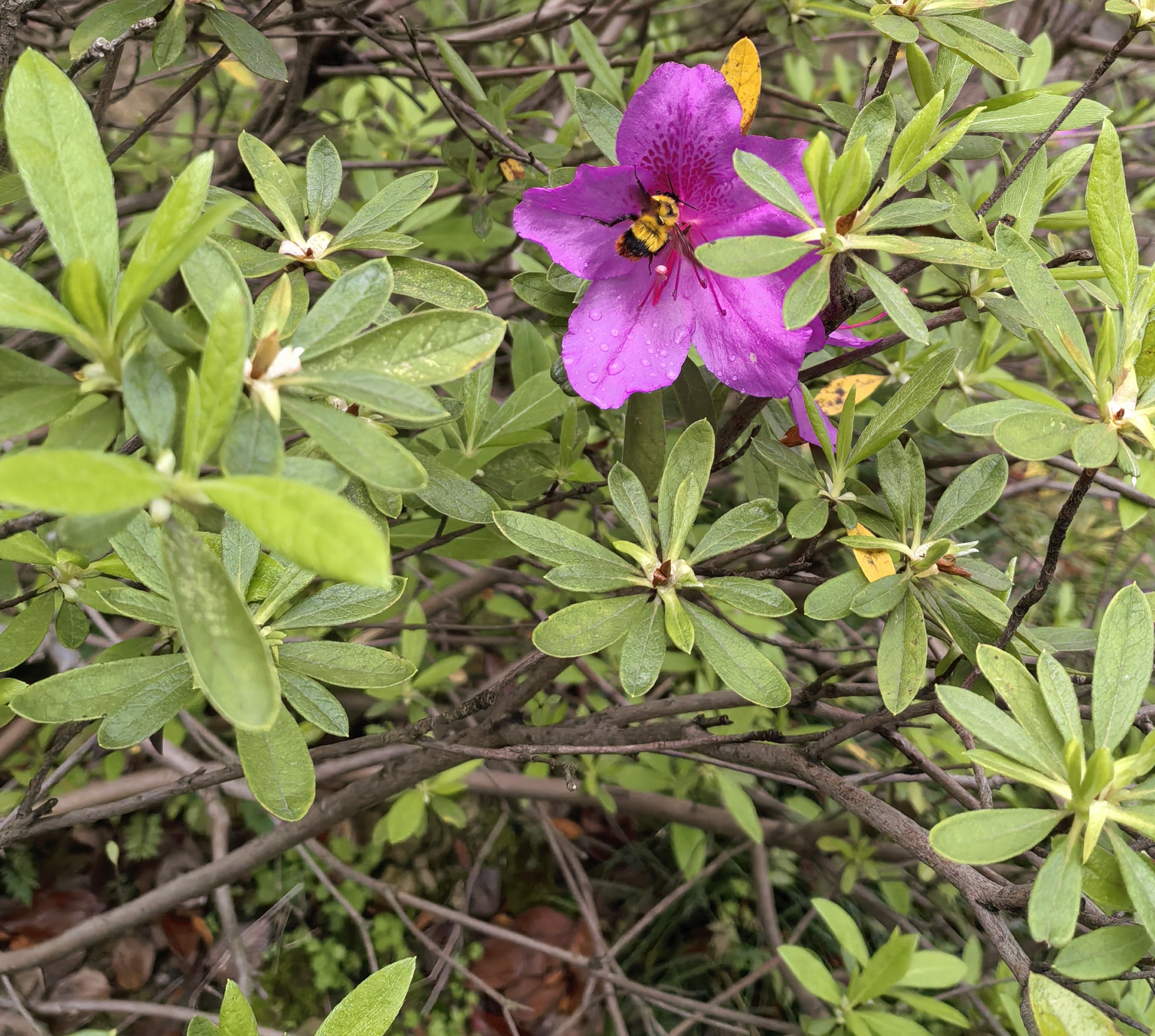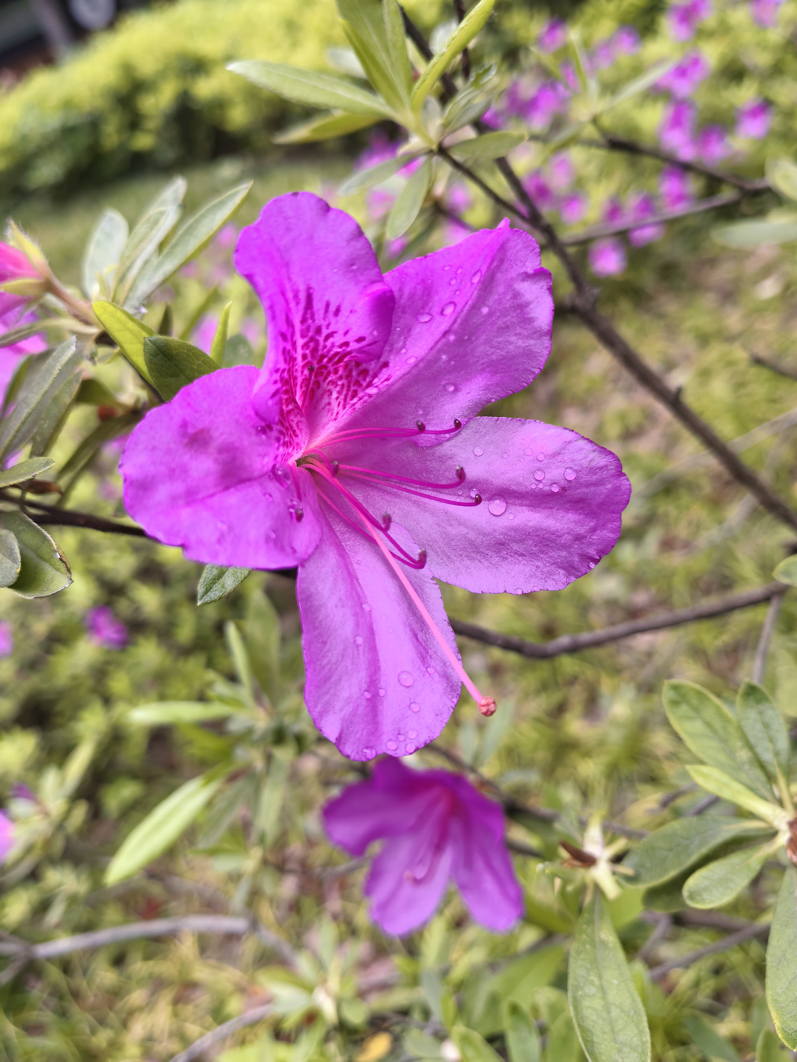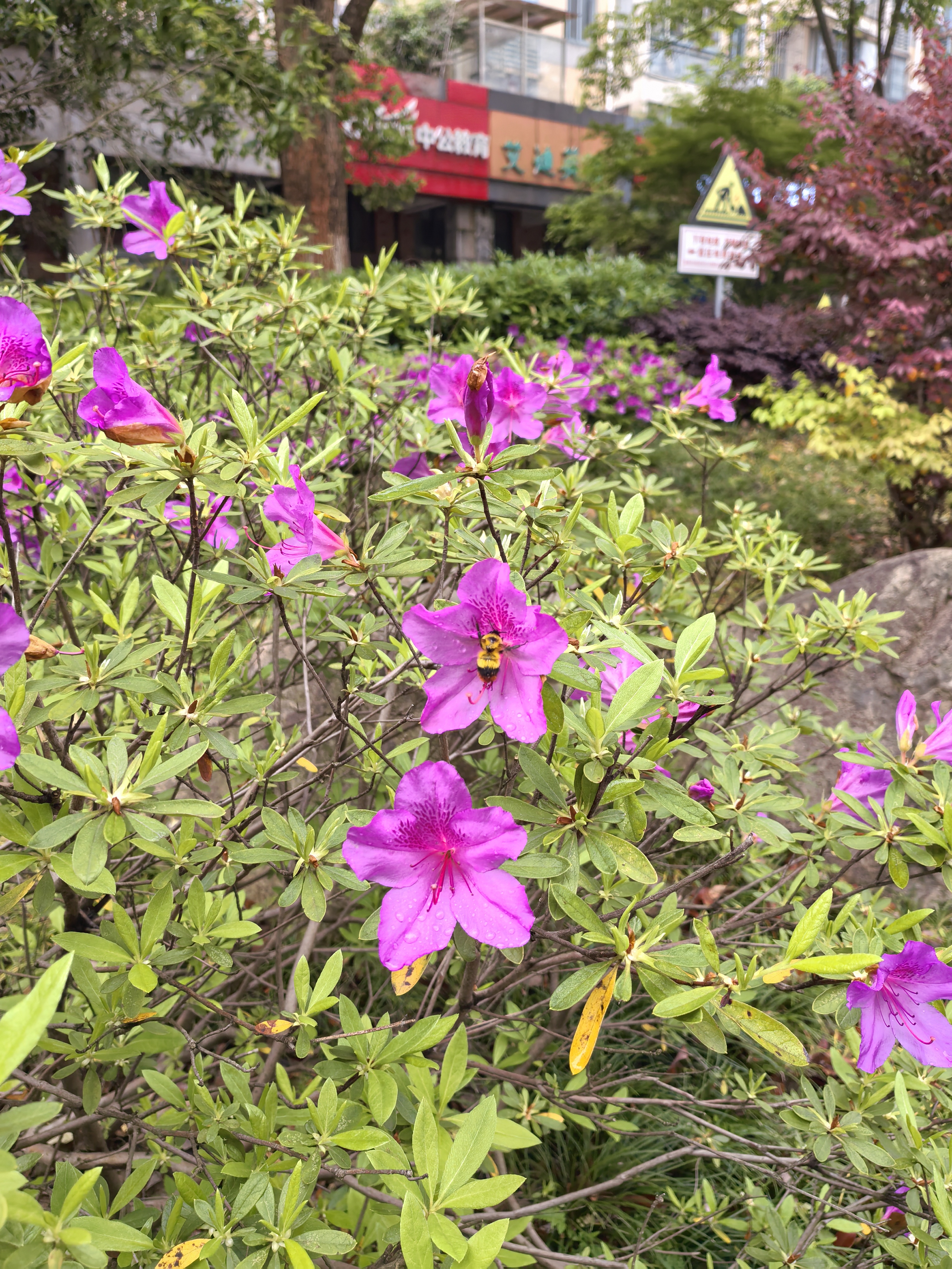 春日的公园一隅,杜鹃花悄然绽放,如云霞般铺展在绿叶丛中。 紫红花瓣层层叠叠,宛若少女羞涩的裙摆,在微风中轻舞摇曳。 每一朵花都舒展着五片柔美的花瓣,中心点缀着深色斑纹,细长花蕊如丝线般探出,仿佛在向阳光致意。 露珠轻缀其上,晶莹剔透,为这抹艳丽更添几分清新灵动。 绿叶衬托下,杜鹃花愈发娇艳欲滴,枝干交错间,蜜蜂嗡嗡穿梭,停驻于花心采蜜,为静谧的画面注入生机与喧嚣。 远处建筑隐约,近处草色青翠,落叶铺地,构成一幅自然与城市交融的诗意画卷。 杜鹃花不争高枝,却以热烈色彩点亮春天,是大地写给季节最温柔的情书。