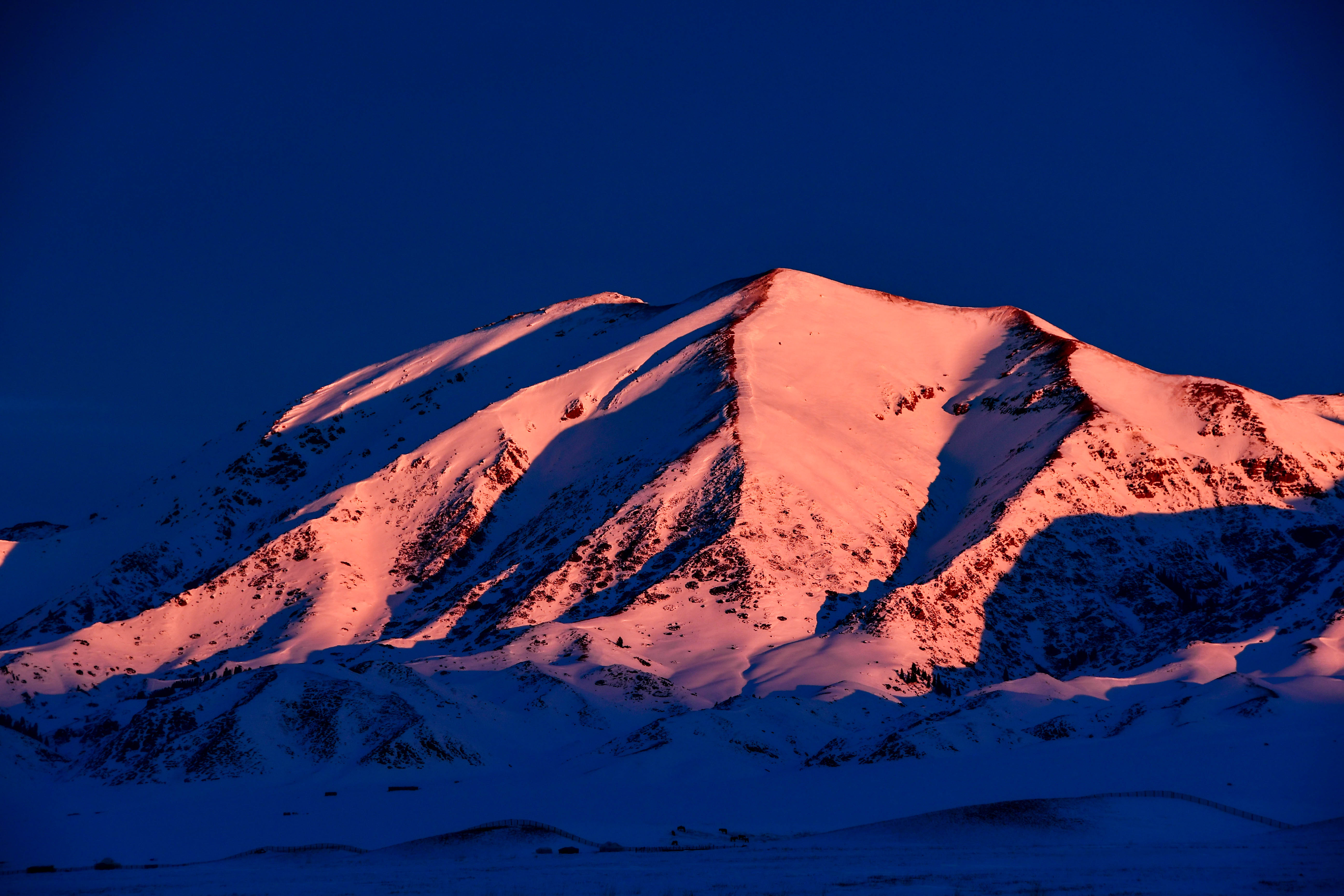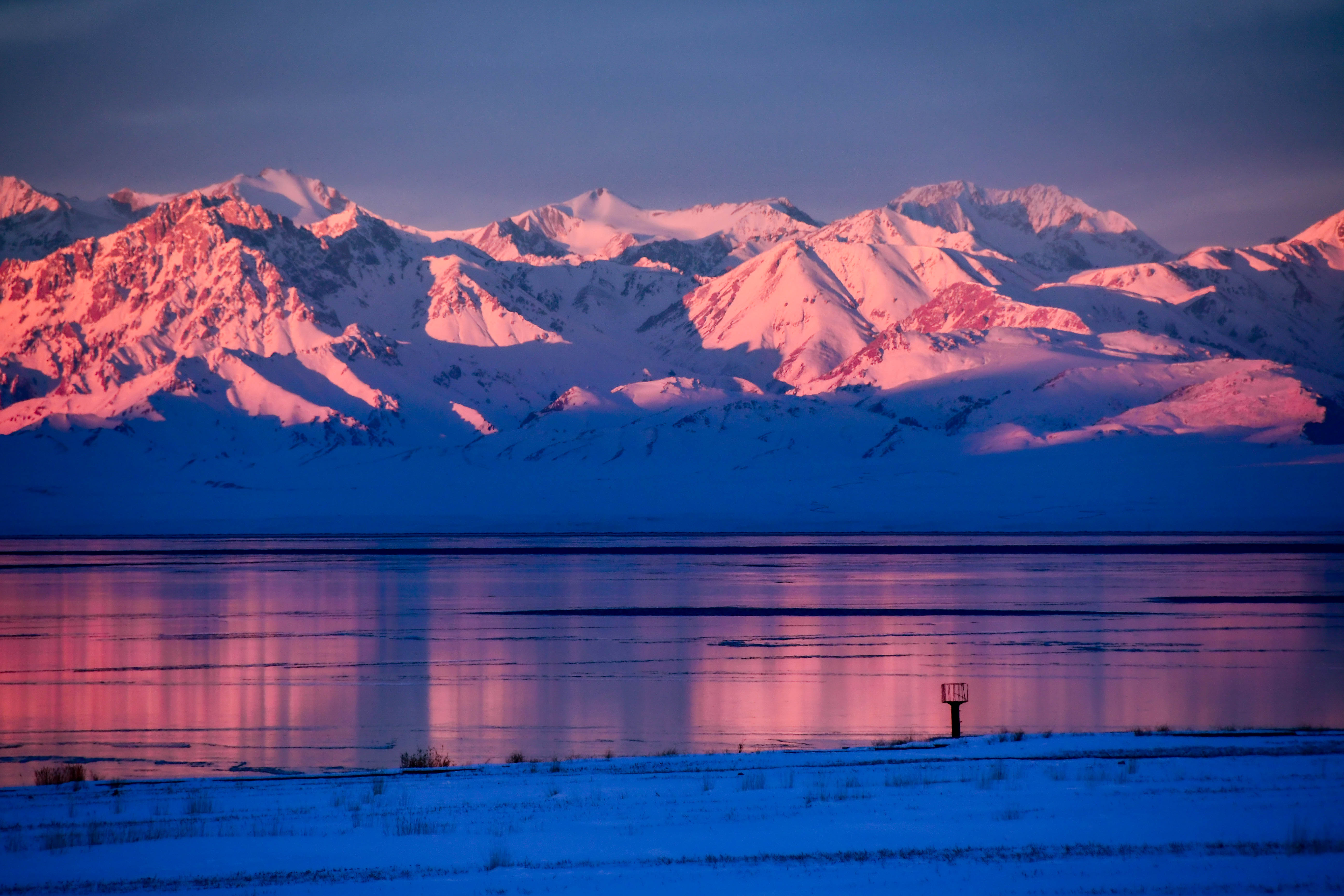 晨光轻抚雪峰,粉霞染透天山;赛湖如镜,倒映冰川与静谧荒野