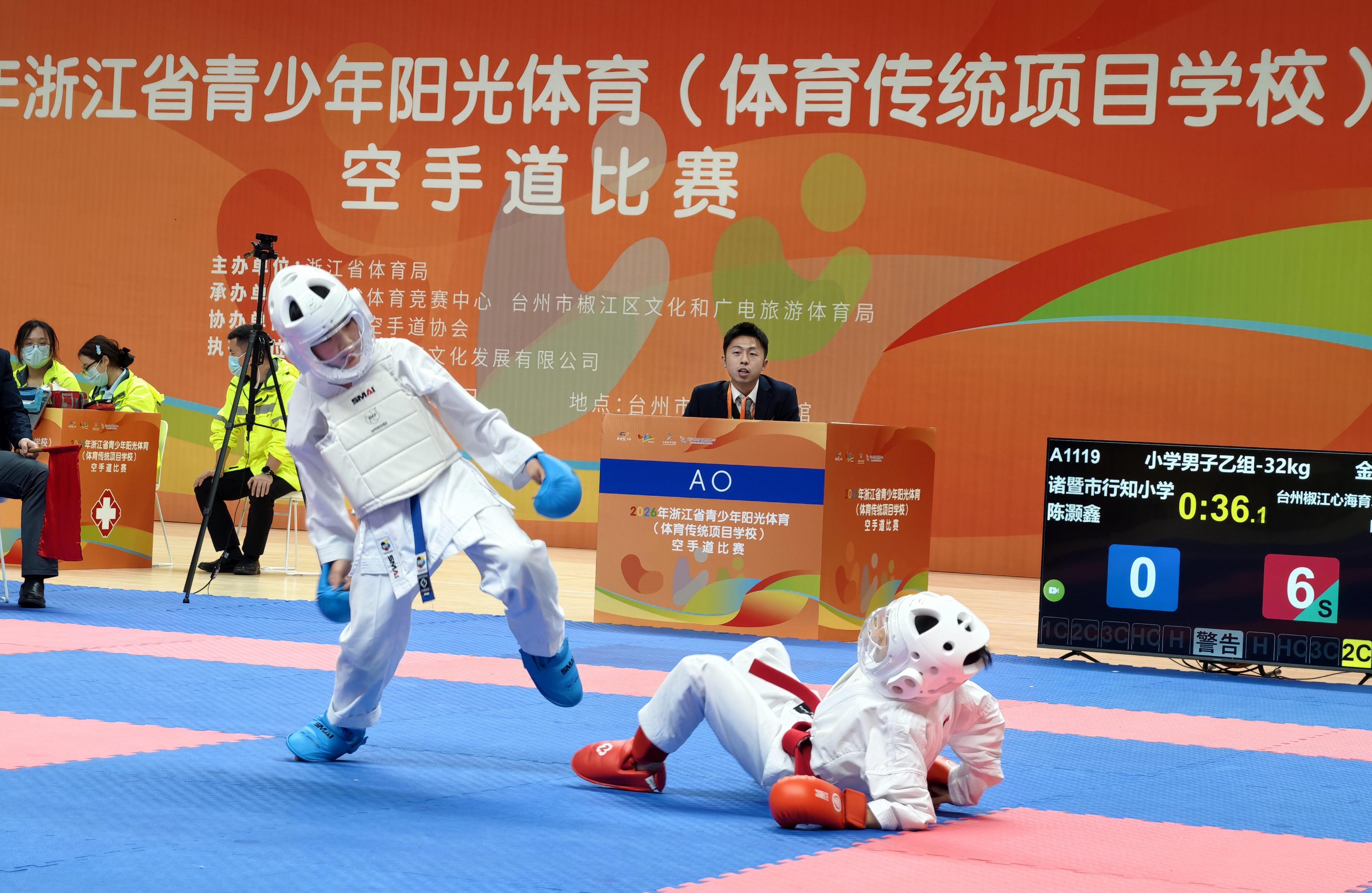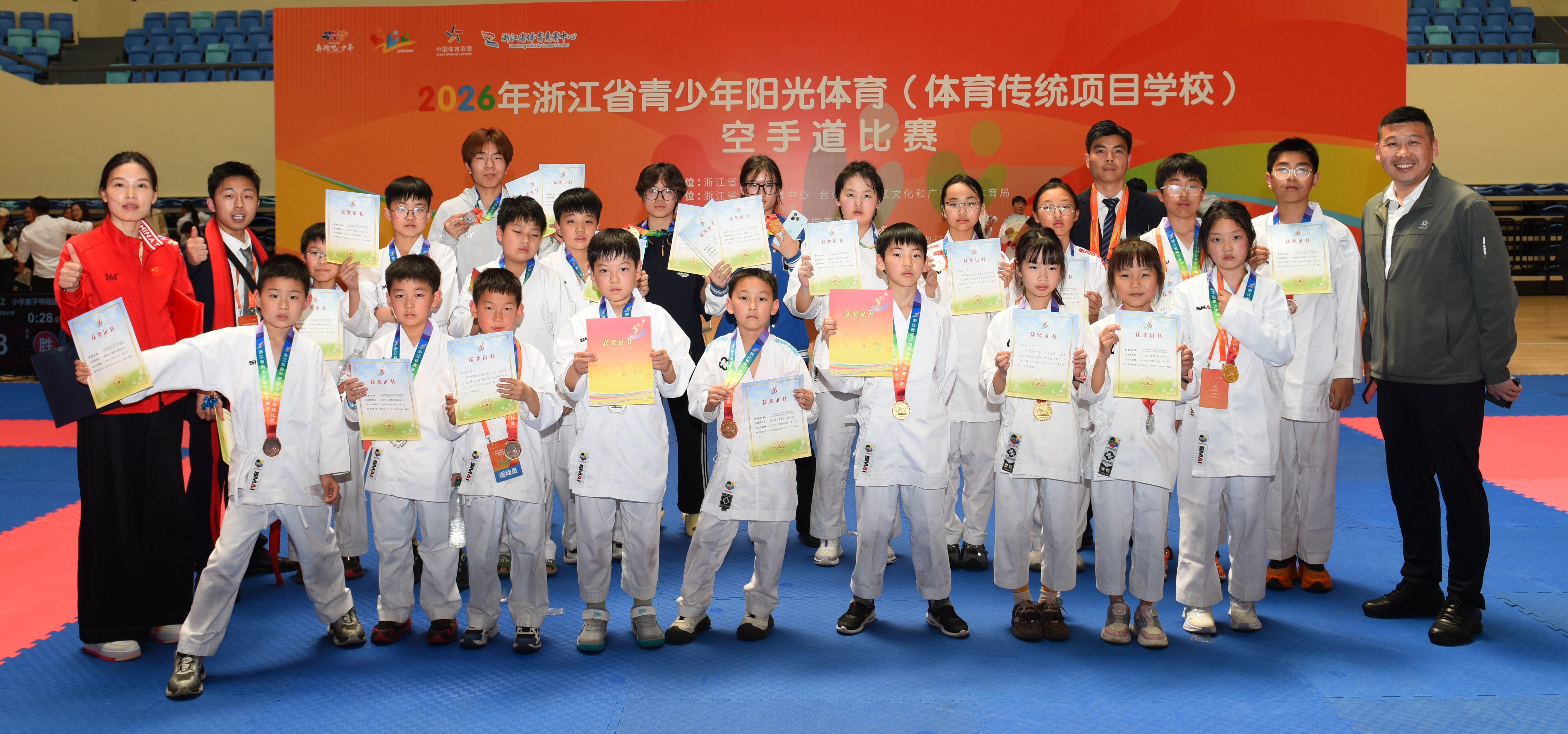 诸暨市在2026年浙江省青少年阳光体育(体育传统项目学校)空手道比赛中取得佳绩 4月19日,由浙江省体育局主办,为期二天的2026年浙江省青少年阳光体育(体育传统项目学校)空手道比赛在台州市椒江体育馆闭幕,来自全省39所学校的200多名中小学生齐聚一堂,展现了空手道运动的竞技魅力,由行知小学、暨阳小学、浣东小学、浬浦高中四所学校21名选手组成的诸暨市代表队顽强拚搏,取得优秀成绩,摘得14块金牌、3块银牌、8块铜牌,行知小学获得小学组团体总分第一名,浬浦高中获高中组第三名。