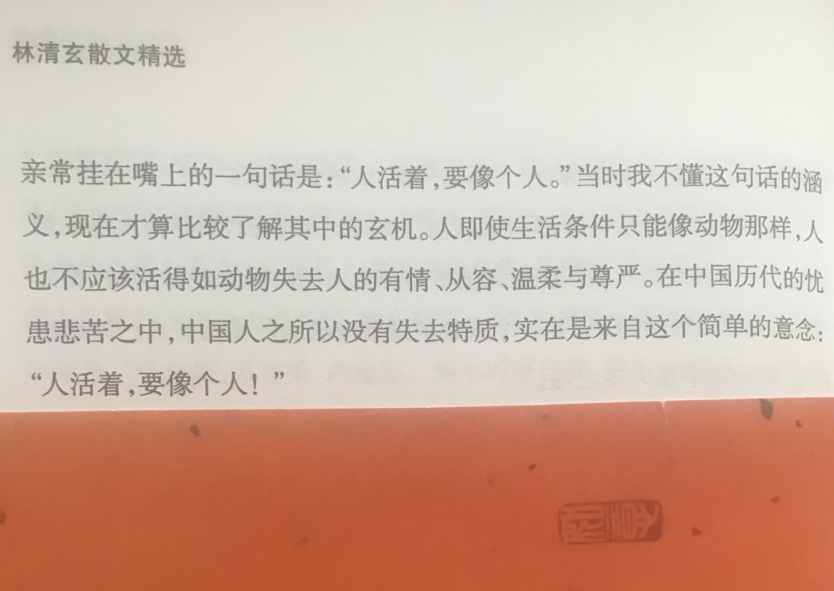 《林清玄散文精选》金句摘抄(3): 人即使生活条件只能像动物那样,人也不应该活得如动物失去人的有情、从容、温柔与尊严。在中国历代的忧患悲苦之中,中国人之所以没有失去特质,实在是来自这个简单的意念:"人活着,要像个人!"