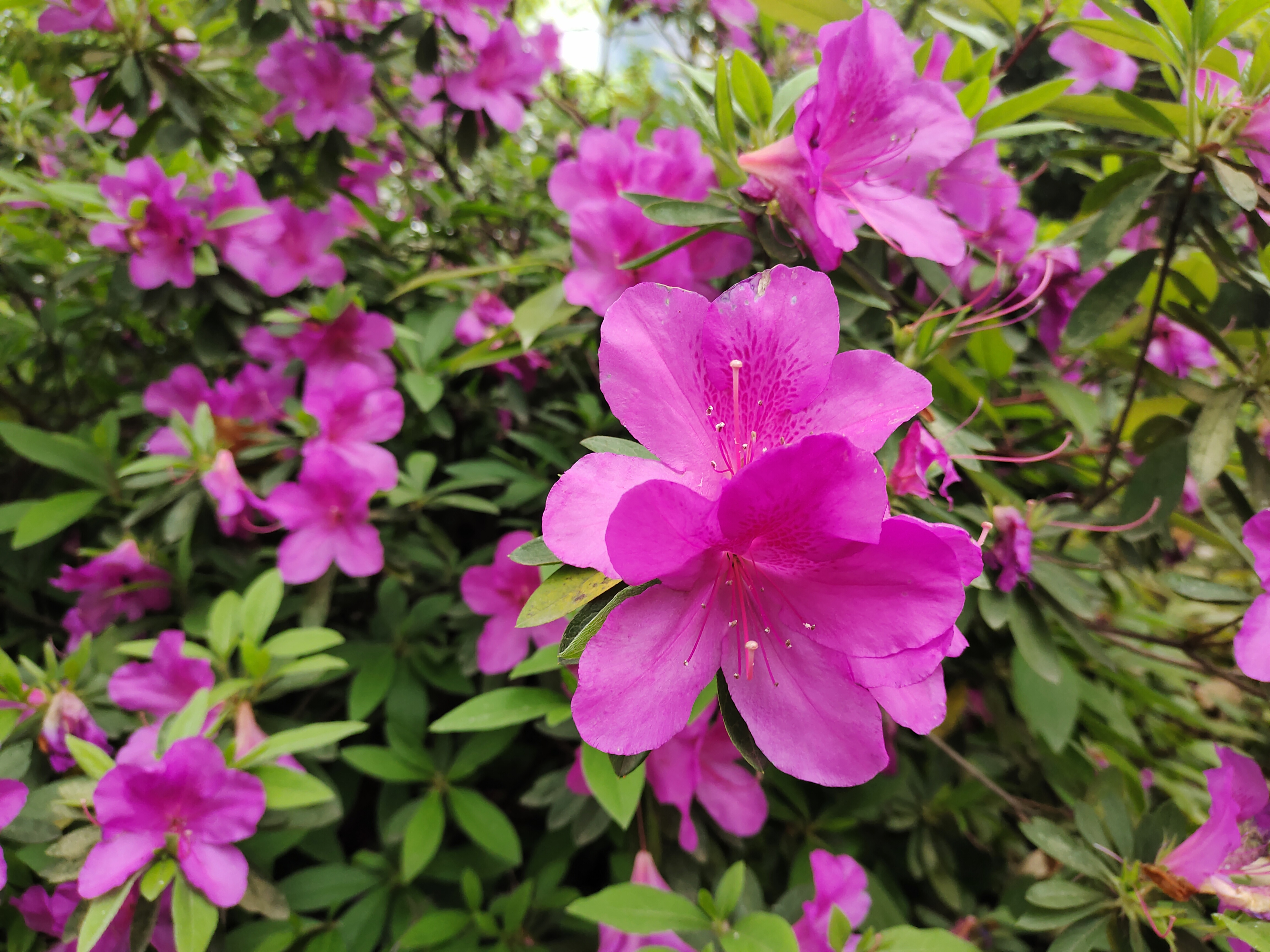 紫红杜鹃在绿叶里冒头,花蕊都透着小俏皮。