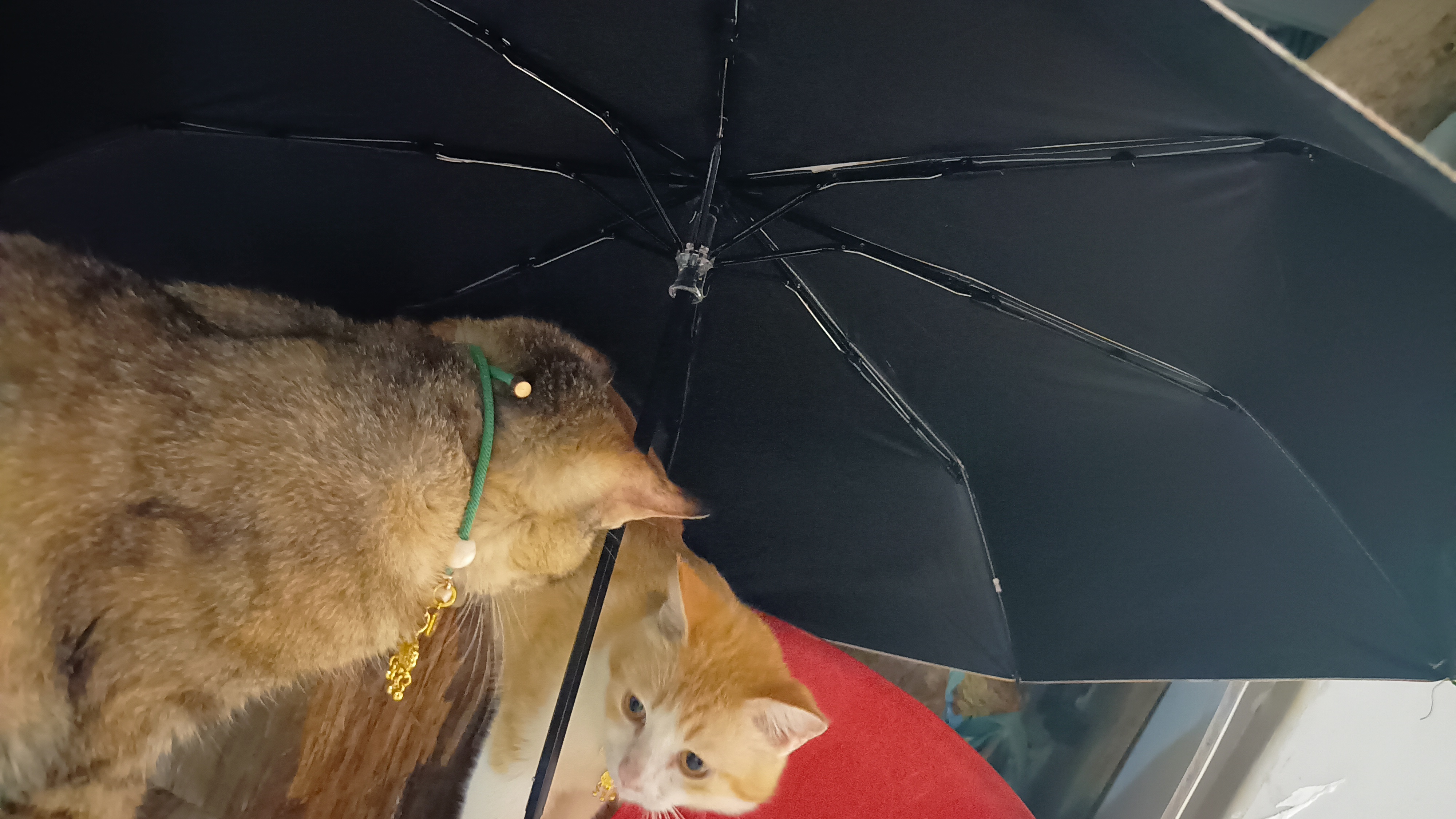 “快看,快看。“妈妈笑着叫我,我忙过去,原来两猫在我的伞下约会了,猫也是懂浪漫的噢。