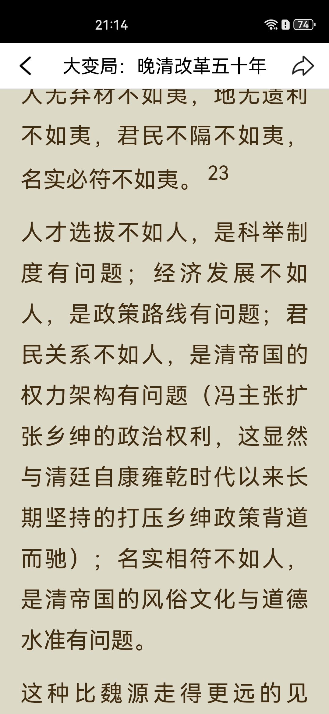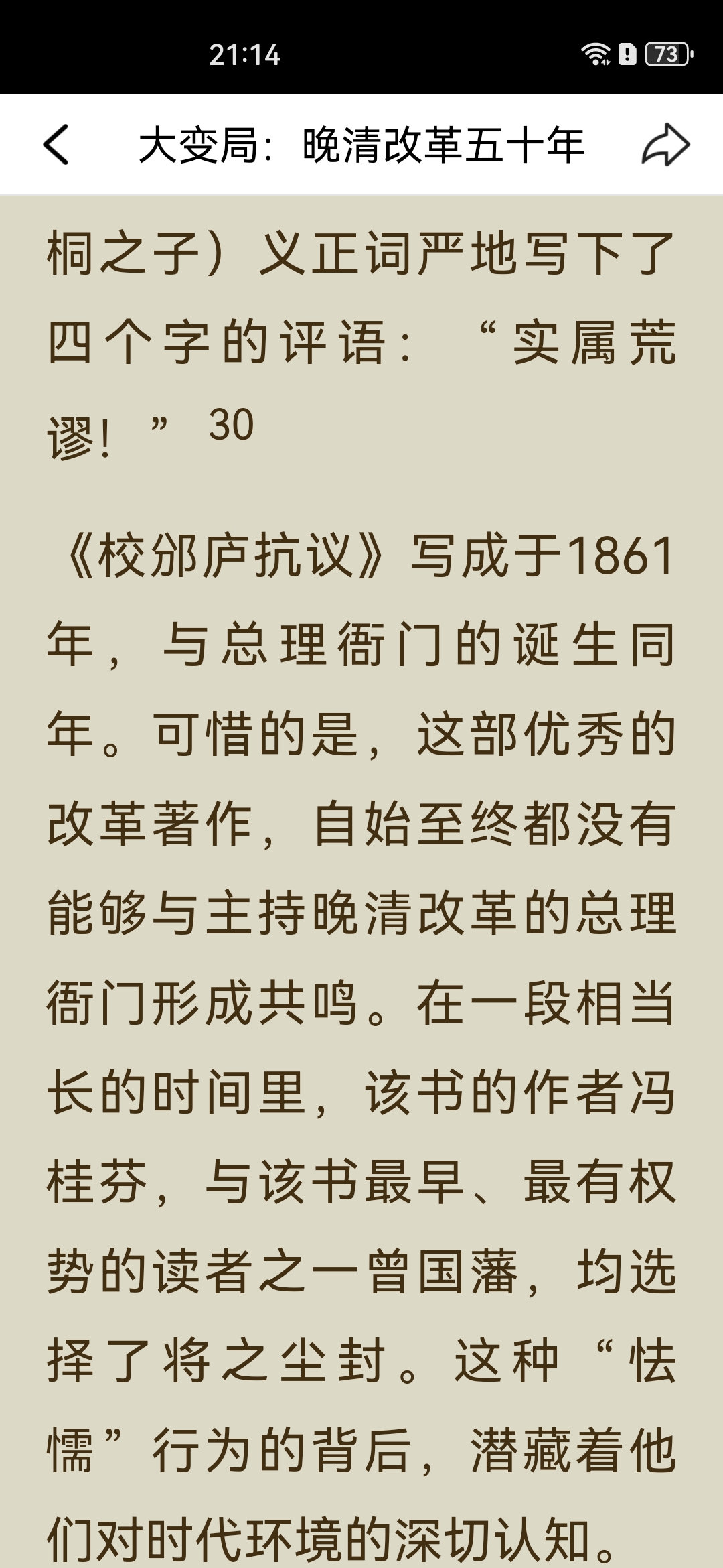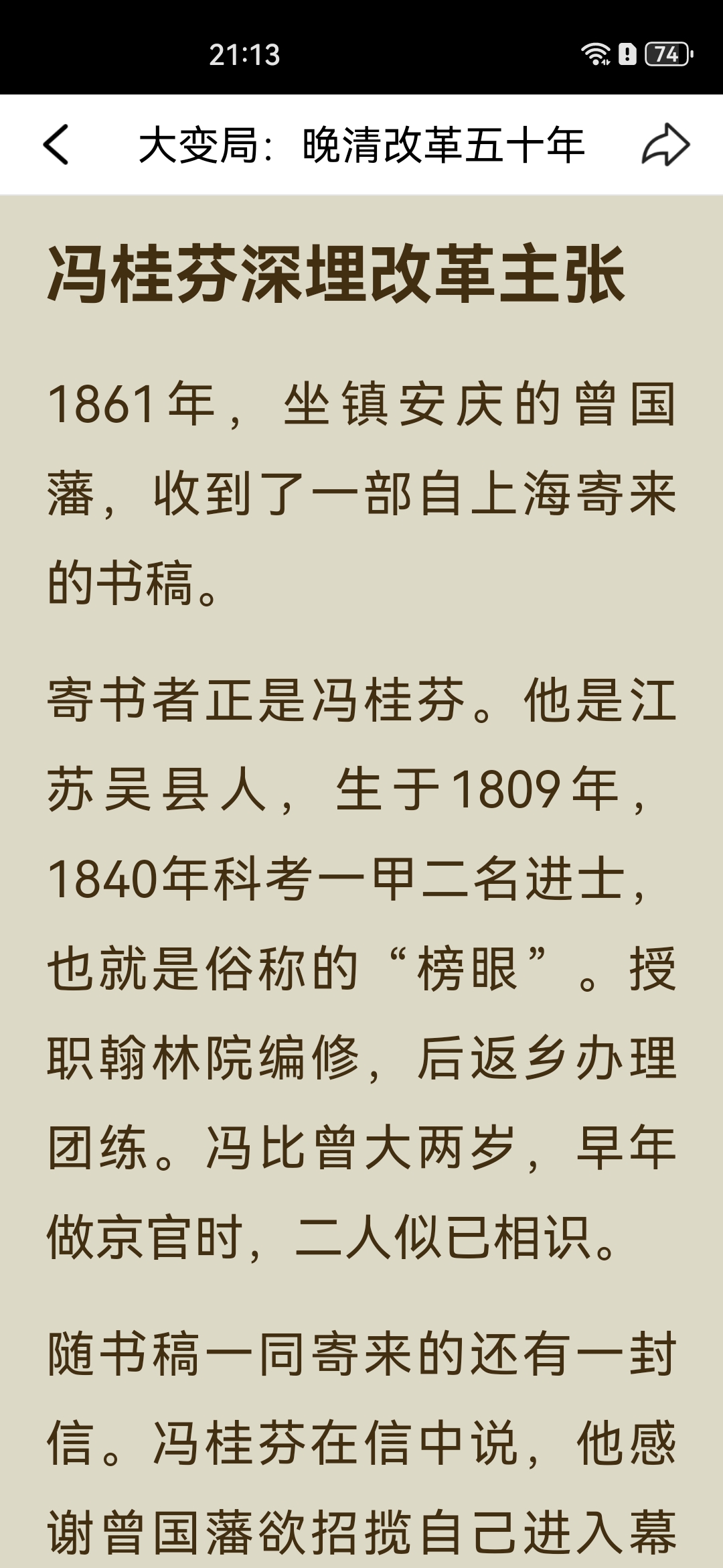 《大变局》之第一章《1861年:改革始于人事更迭》之第3节《冯桂芳深藏改革主张》的主要内容及阅读理解。 一、核心内容提要 本节围绕冯桂芬与代表作《校邠庐抗议》展开,核心讲述一个“清醒却保守”的改革者,在1861年那个变局之年,如何因时代局限而将极具洞见的改革主张深埋的历史细节。 1. 人物与书稿缘起 - 人物背景:冯桂芬(1809-1874),林则徐门生,1840年科考“榜眼”,受恩师影响深研经世致用之学。 - 创作背景:1861年,第二次鸦片战争惨败,咸丰帝出逃,内忧外患。冯桂芬避难上海租界,感时伤世,撰写《校邠庐抗议》,试图为清帝国寻找自强之路。 - 关键行为:将书稿寄给曾国藩,恳请作序以“托青云而显”,但曾国藩虽激赏却最终婉拒,书稿被长期尘封。 2. 思想的深度与局限 - 超越时代的洞见:相比魏源“师夷长技以制夷”仅停留在器物层面,冯桂芬直指制度弊端,提出清廷“四不如夷”:- 人无弃材不如夷(人才选拔/科举问题) - 地无遗利不如夷(经济/政策问题) - 君民不隔不如夷(权力架构/君民关系问题) - 名实必符不如夷(风俗文化/道德水准问题) - 小心翼翼的包装:为规避风险,他将改革主张包装在传统儒家框架内,确立“以中国之伦常名教为原本,辅以诸国富强之术”的核心原则,只敢在“不畔于三代圣人之法”下做有限改良。 3. “深藏”的真相 - 自我删改:在稿本中删去称赞西方民主制度(如美国“传贤不传子”)的敏感文字,批注“末句似不足为典”,尽显内心惴惴不安。 - 拒绝出版:好友劝其刊印,他至死不从,仅以抄本流传。直到去世九年后(1883年),《校邠庐抗议》才正式刻本面世,且内容已被大幅删改。 - 时代的判词:曾国藩评其“多难见之施行”,李鸿章言其“知洋情而胆不足”。这种“怯懦”并非个人软弱,而是先行者对时代环境的深切认知——当时的社会远未接受如此激进的改革。 二、深度阅读理解 本节内容深刻揭示了晚清改革的“历史宿命”,可从以下三个维度解读: 1. 转型期知识分子的典型困境 冯桂芬是“承上启下”的关键人物。他既有传统士大夫的家国情怀,又具备开眼看世界的视野。但他的悲剧在于:认知已走在时代前列,灵魂却被传统礼教禁锢。他不敢也不能彻底打破“夷夏之防”,只能用传统话语包裹西学主张,这种“带着镣铐跳舞”**的无奈,是当时所有开明士大夫的共同困境。 2. 改革“知行分离”的根源 书中细节(曾国藩不写序、冯桂芬不敢出版)精准指出了洋务运动失败的深层原因: - 顶层设计缺失:核心改革者缺乏破釜沉舟的勇气,改革方案多为“修修补补”,未触及封建专制根本。 - 社会阻力巨大:正如徐承煜在戊戌变法时批其“实属荒谬”所示,守旧势力异常强大,任何触及体制的变革都可能招致杀身之祸。 - 这也解释了为何晚清改革**“只改器物、不改制度”,并非领导者不知晓路,而是时代不允许他们走得更远**。 3. 历史的辩证价值 尽管被“深藏”,《校邠庐抗议》仍具有不可磨灭的启蒙意义: - 它是早期“中体西用”思想的源头,为后来的洋务运动提供了理论纲领。 - 冯桂芬的“深藏”反证了历史的残酷与曲折:真正的思想火种,往往在压抑中孕育,虽未必即时燎原,却终将照亮未来。它为戊戌变法等后续改革铺垫了思想基础,成为近代中国从封闭走向开放的重要思想阶梯。
