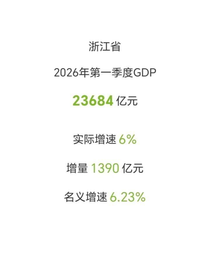 【浙江: 一季度GDP火力全开, 4万亿差距几乎追平广东增量】真是个大大的惊喜! 浙江今年一季度GDP出来了, 不仅增速高增量也高 面对广东这种14万亿级别的巨头,浙江也是战斗力爆表—— 一季度广东和浙江的增量分别为1422.34亿和1390亿, 广东在总量领先浙江4万亿的优势下,增量却只比浙江领先不到40亿 思来想去,一个很大原因就是近几年浙江牢牢抓住了新兴产业,催生出了一大批代表前沿科技的创新公司,原先的阿里巴巴暂且不提,近两年涌现的宇树科技 深度求索等等,都出现在浙江,广东却一家都没有,难怪浙江增长速度如此之快。