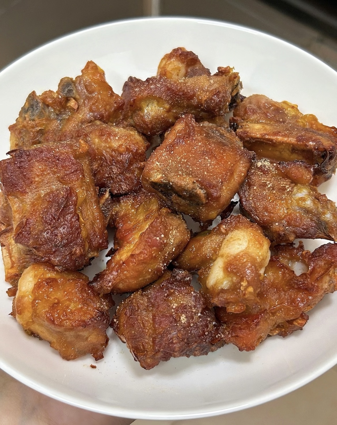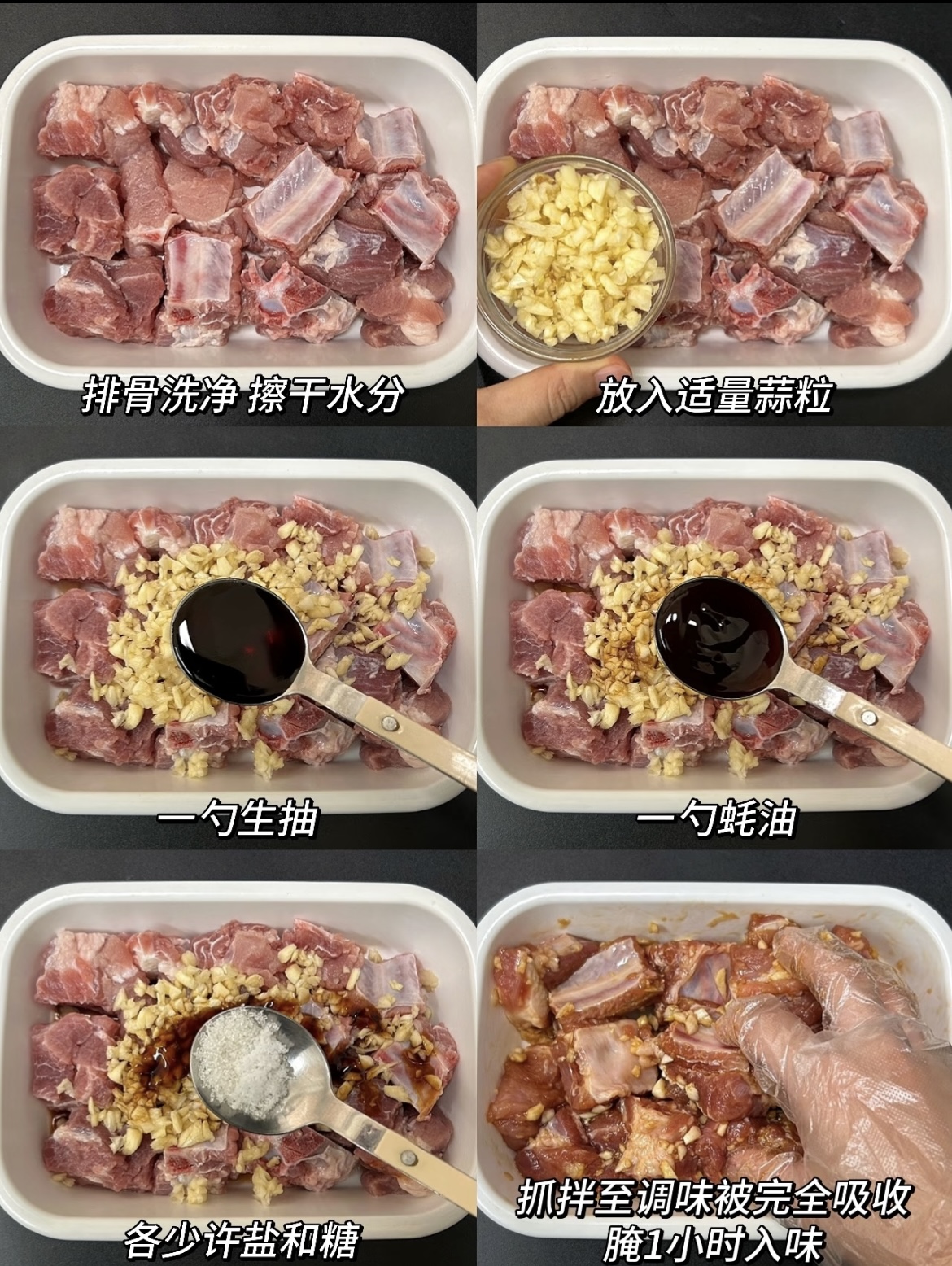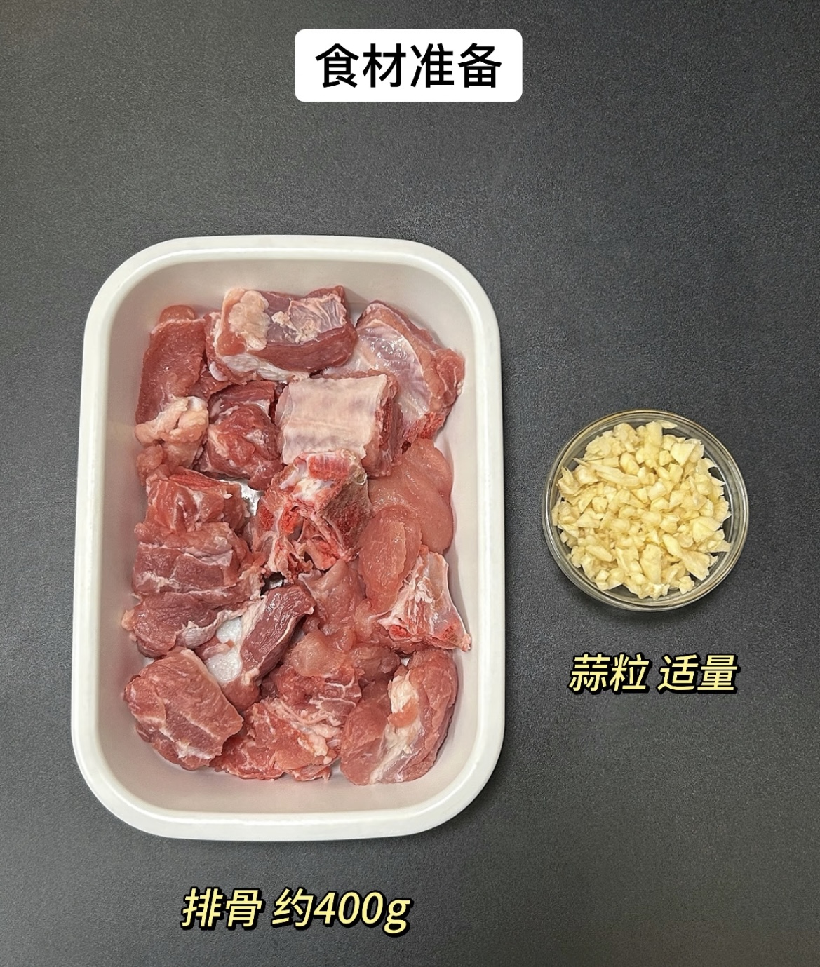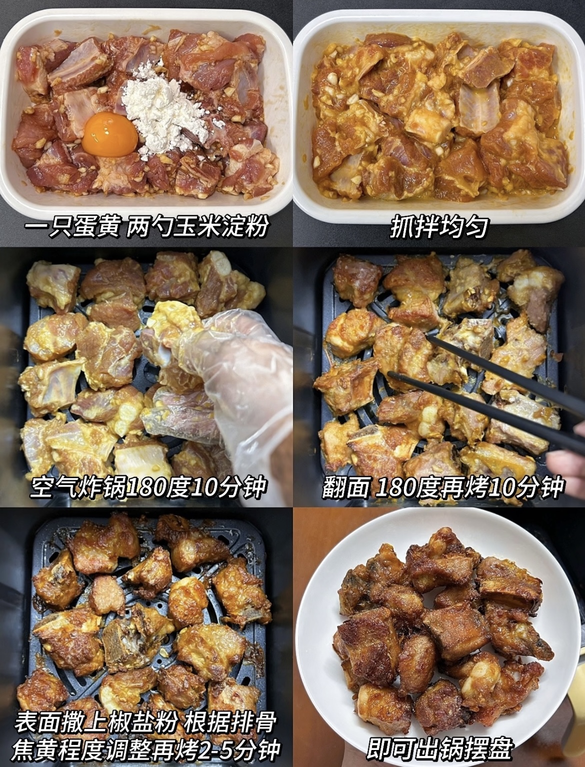 蒜香椒盐排骨(空气炸锅版) 食材准备: 排骨约400克 大蒜一头 做法步骤: 1. 排骨洗净后擦干水分,方便入味。 2. 加入蒜粒、一勺生抽、一勺蚝油、少许盐和糖,抓拌均匀后腌制1小时。 3. 腌好的排骨中加入一个蛋黄和两勺玉米淀粉,再次抓拌均匀。 4. 放入空气炸锅,180度烤10分钟,翻面后再烤10分钟。 5. 表面撒上椒盐粉,根据上色情况,再烤2-5分钟即可出锅。