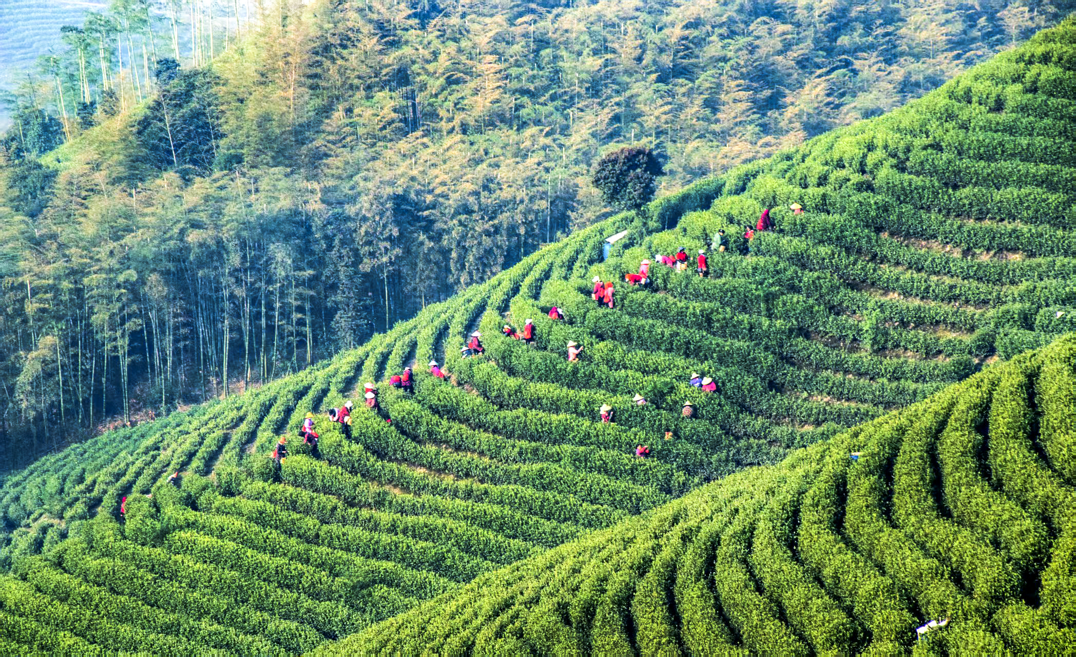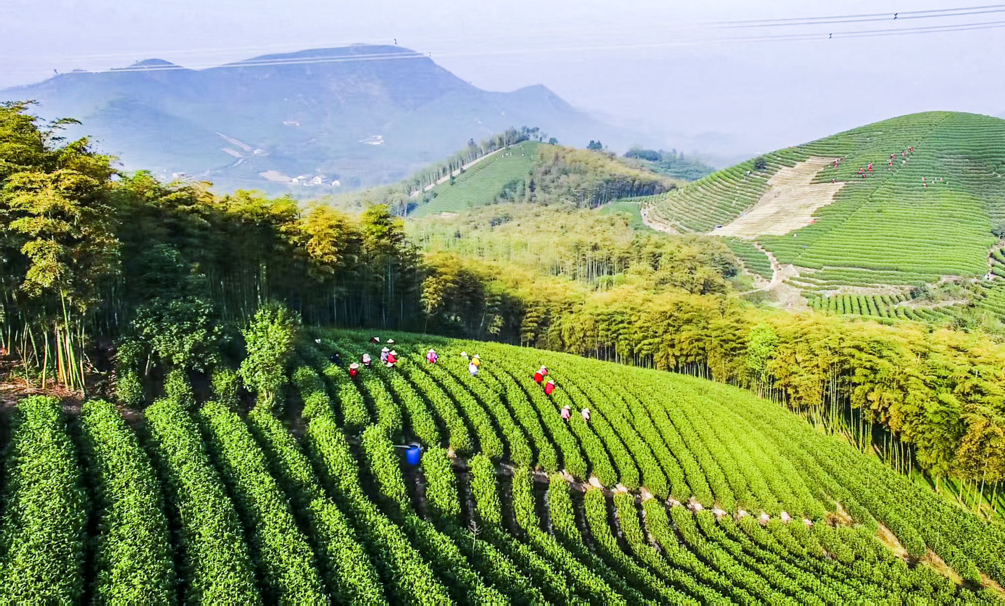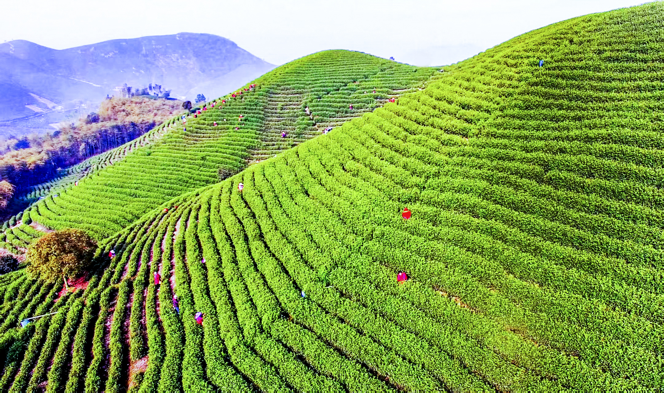 无人机航拍茶香翠岭 满目苍翠的明前茶山峦,红衣采茶女在蜿蜒盘旋的茶垄中移动着莲花步采撷茶尖尖的模样犹如茶垄“五线谱”上跳动的音符。茶山是春天的大舞台采茶女指尖的“青玉”就是这大舞台上的精灵!生活的美好画卷随之展开……