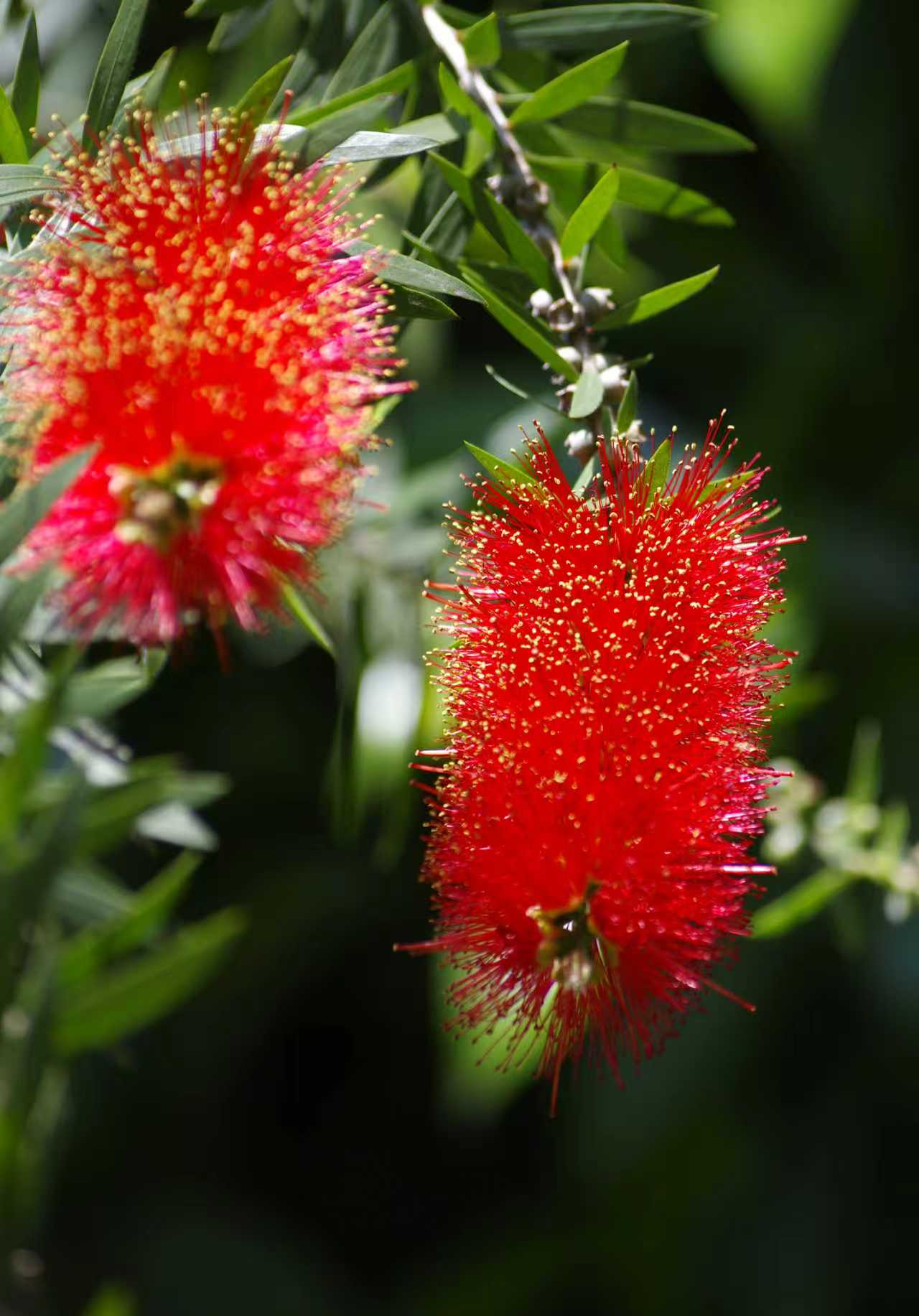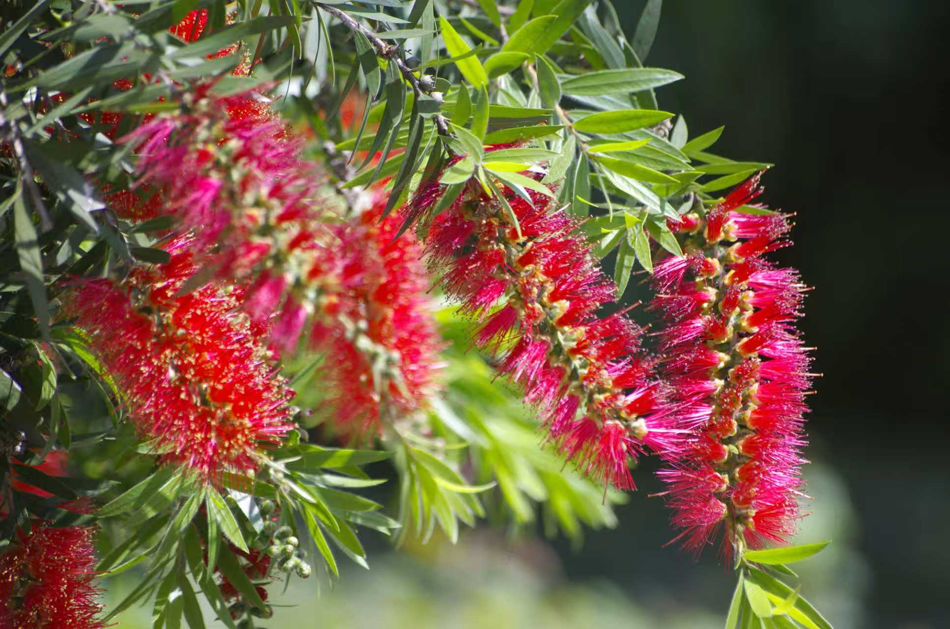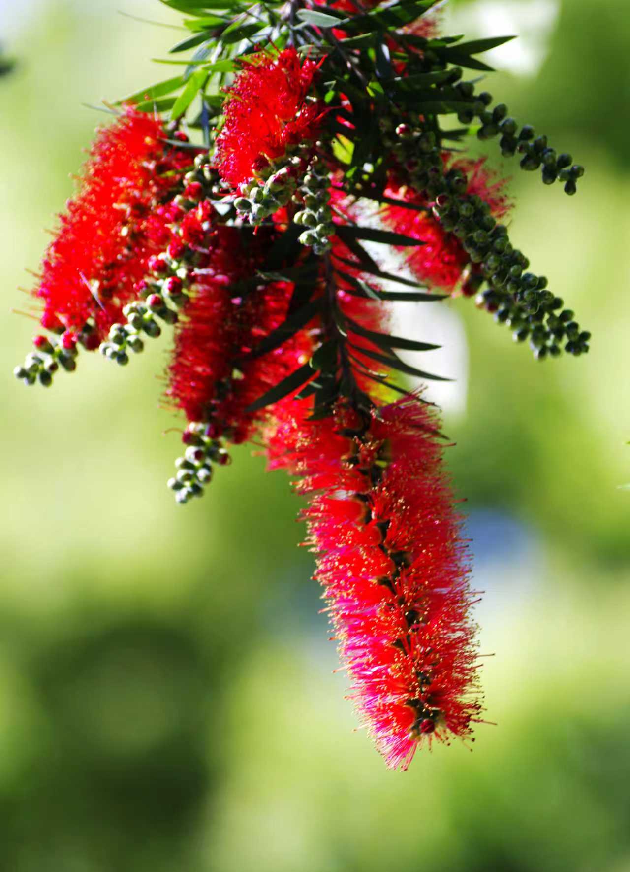 红千层,花开像一把红毛刷子。 最早认识红千层是在大学,校园里种植着不少,树上挂有名字牌,第一次见到这花还以为是假的。初来杭州的时候,在杭州艮山门大雕像下看到过红千层,本来还想着是不是去艮山门看看。昨晚看到一个朋友分享在临桥巷和江南大道口看到了红千层,今天特意去拍了几张照片。