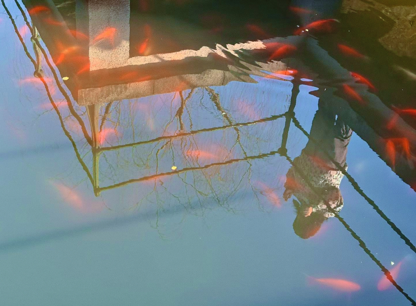 #春拍大赛#锦鲤拖曳霞色游弋池中,红鳞是流动的火焰。栏杆倒影与云影共舞,观鱼人静默成雕塑,心随尾鳍轻摆,偷得浮生半刻闲。(拍摄于花港观鱼)