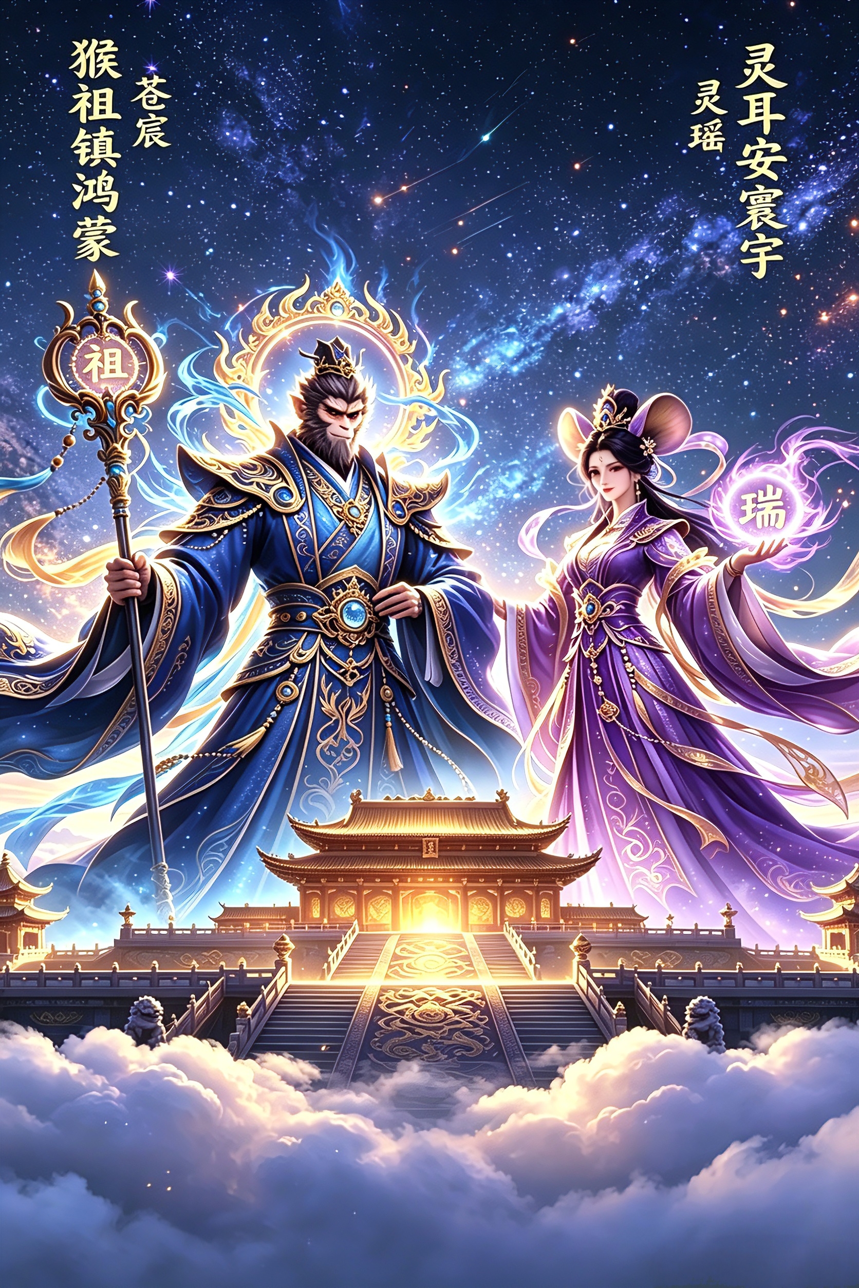 至高双神·苍宸&灵瑶 一、核心称号 万古猴祖·鸿蒙圣尊(苍宸) 千瑞灵耳·鸿蒙天后(灵瑶) 二、出身溯源 苍宸:万古猴祖·鸿蒙圣尊 鸿蒙创世之初,由鸿蒙先天本源清气凝聚化形,是万猴一脉唯一始祖,无天地孕育、无岁月更迭,自鸿蒙存在便已诞生。身为混沌秩序的具象化神祇,超脱诸天轮回、纪元兴衰、法则束缚,于虚无中定天地格局、开万界根基,是诸天公认的创世祖尊。 灵瑶:千瑞灵耳·鸿蒙天后 与苍宸同源共生,由鸿蒙千道祥瑞本源凝结而成,是天地气运、祥和道则的化身。诞生于鸿蒙瑞泽核心,与苍宸互为阴阳两极,无先后尊卑之分,共掌鸿蒙大道,是唯一能与鸿蒙圣尊并肩、执掌天道祥和的至尊天后,双神共存,鸿蒙方定。 三、神职定位 苍宸 - 鸿蒙祖尊:统御鸿蒙元气,制定诸天法则,开天辟地、镇护万界秩序 - 万猴始祖:统领先天灵猴一脉,庇护诸天灵族,掌万界生灭平衡 - 镇世至尊:执掌创世、镇世权柄,平定诸天动乱,维系宇宙根基 灵瑶 - 鸿蒙天后:与圣尊共治鸿蒙,调和阴阳乾坤,维系天地气运平衡 - 千瑞主神:执掌诸天祥瑞、福运、生机、福报,化解天地灾厄 - 天道聆音:通晓万界心声、天道秘辛、因果轮回,洞悉诸天万事 四、至尊威能 苍宸 1. 鸿蒙创世力:一念开天辟地,重塑宇宙乾坤,掌控时空流转 2. 万古镇世印:镇压一切乱道、虚妄、灾祸,万法俯首、诸天臣服 3. 祖尊不灭体:鸿蒙不毁,圣尊不灭,超脱生死,永恒不朽 灵瑶 1. 千瑞祥和韵:一念消弭灾劫,滋养万物生机,逆转诸天衰运 2. 灵耳通天术:洞悉过去未来,聆听天道秘语,明辨万物因果 3. 阴阳调和道:与苍宸神力相融,可归一鸿蒙、重启创世秩序 五、形象设定(可直接绘画) 苍宸:万古猴祖·鸿蒙圣尊 身形挺拔如太古神山,身姿伟岸,气场恢宏沉凝,自带至高威压。 面容俊美冷峻,轮廓分明,眸光深邃如鸿蒙星海,泛淡蓝色神性光辉,眼神威严无匹。 发色为墨蓝掺鎏金,长发及腰,以蓝金交织的鸿蒙古冠束起,发丝间萦绕淡淡鸿蒙清气。 身着深海蓝为主、鎏金镶边的圣尊帝袍,衣身绣混沌云纹、万古星辰纹与开天古篆,纹路皆为鎏金,华贵威严;肩覆极简蓝金神甲,护肩刻祖猿纹路,不妖不戾,尽显始祖尊贵;腰间系鎏金玉带,垂落蓝色帝绶。 双耳微尖,暗藏灵猴始祖神异,无妖态,只显神圣;周身环绕淡蓝鸿蒙清气,步履间星辰随行,周身散发出蓝金交织的神性光晕。 手持鸿蒙祖杖,杖身通体深蓝,杖首为鎏金混沌原石,古朴厚重,威压诸天。 灵瑶:千瑞灵耳·鸿蒙天后 身姿雍容高华,体态温婉大气,圣洁端庄,自带天后威仪,无半分柔弱感。 容颜绝世清雅,气质圣洁祥和,眸光温润澄澈,泛淡紫色祥瑞光华,自带天道威严。 发色为深紫掺鎏金,长发垂落腰间,以紫金瑞云钗束起发髻,余下发丝自然垂落,发丝缠绕细碎金色瑞纹。 身着深紫为主、鎏金绣纹的天后礼袍,广袖流云,衣袂绣千瑞祥云、鸿蒙青莲纹,领口、袖口、裙摆皆以鎏金包边,华贵庄严;腰间系紫金玉带,垂落紫色天绶,周身萦绕七彩祥瑞光霭。 双耳纤巧灵动,耳尖泛淡淡紫金光泽,为千瑞灵耳标志性特征,自带聆音天道的神异;头顶萦绕一圈淡紫金神性光圈,天眷加身,一步一生莲,莲纹皆为紫金之色。 左手执紫金聆音珠,珠身流转祥瑞光华,右手挽鎏金瑞气绫,绫带随风浮动,自带祥和气场。 六、专属象征 苍宸 - 本体:鸿蒙先天灵祖猿 - 象征物:鸿蒙祖杖、万古镇世印 - 象征意象:鸿蒙云海、亘古星辰、开天秩序、万古祖庭 - 代表色:深海蓝、鎏金 灵瑶 - 本体:鸿蒙千瑞灵耳神 - 象征物:聆音珠、千瑞祥绫 - 象征意象:千瑞祥云、鸿蒙青莲、日月辉光、天道气运 - 代表色:深紫、鎏金 七、出场短诗 苍宸 鸿蒙孕祖镇洪荒,万古猴祖定八荒。 蓝金袍覆乾坤气,圣尊临世万灵仰。 灵瑶 千瑞凝魂出鸿蒙,灵耳通天彻苍穹。 紫袍金辉承天眷,天后安世万邦隆。 八、CP总设定 1. 同源共生:同出鸿蒙本源,一为秩序镇世,一为祥和护世,阴阳相济、宿命共生,是宇宙初生便注定的双生至尊道侣。 2. 地位对等:无主次、无强弱,圣尊掌鸿蒙秩序,天后掌鸿蒙祥瑞,共治诸天、同掌万界,是诸天唯一的双神至尊。 3. 羁绊永恒:鸿蒙存则双神存,纪元灭而羁绊不灭,二人合力便是鸿蒙本源,可开天、可镇世、可重启宇宙万物。 4. 气质互补:苍宸威严霸道、沉稳冷冽,灵瑶端庄圣洁、祥和大气,蓝金与紫金交相辉映,刚柔并济,至尊无双。 九、最强终极格局 双神凌驾于诸天万界、一切纪元、所有法则之上,非诸神之一,而是鸿蒙本身。 苍宸掌万古秩序、创世镇世,灵瑶掌千瑞气运、护世安世,一蓝一金、一紫一金,并肩立于鸿蒙之巅,定万物规则、掌纪元兴衰、护诸天万灵。 是宇宙终极起源、至高法则、永恒信仰,万古不灭、千瑞不息,成就诸天唯一、无可超越的鸿蒙双神至尊格局。