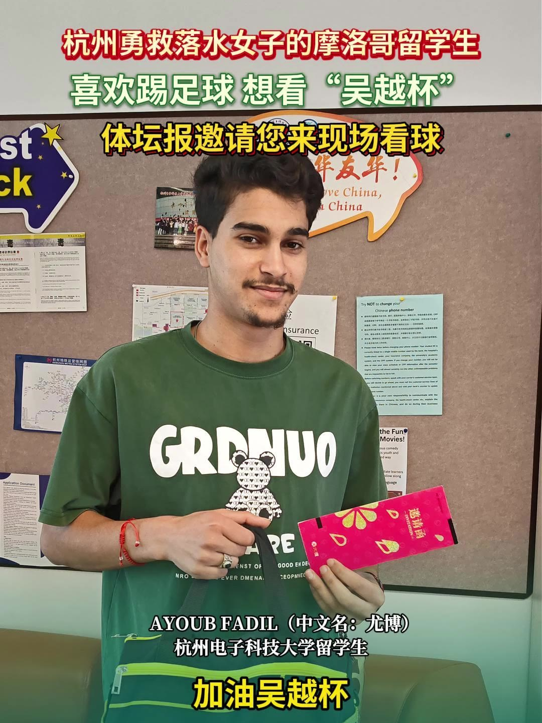 勇救落水女子的摩洛哥留学生尤博,体坛报邀请您来“吴越杯”现场看球 !