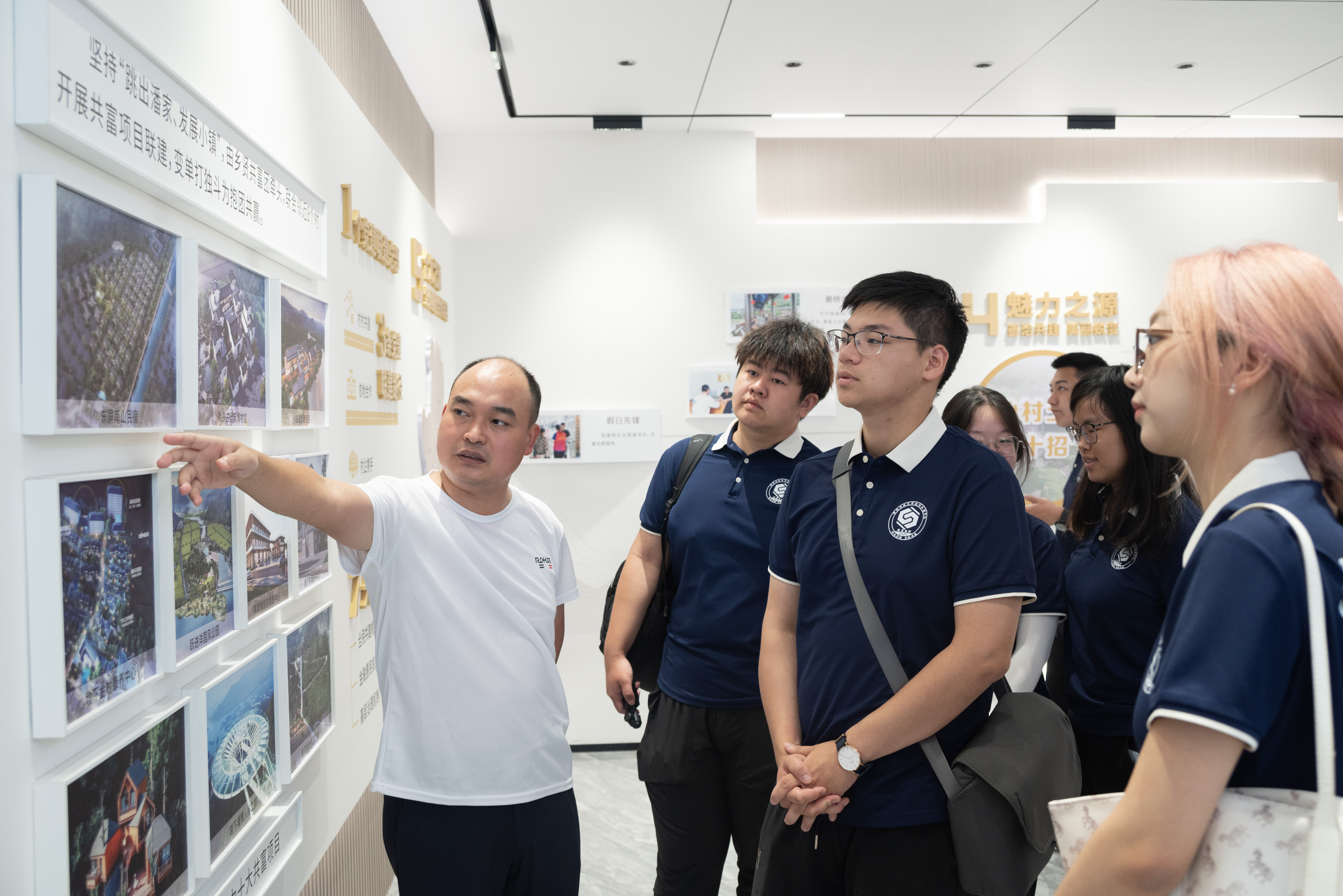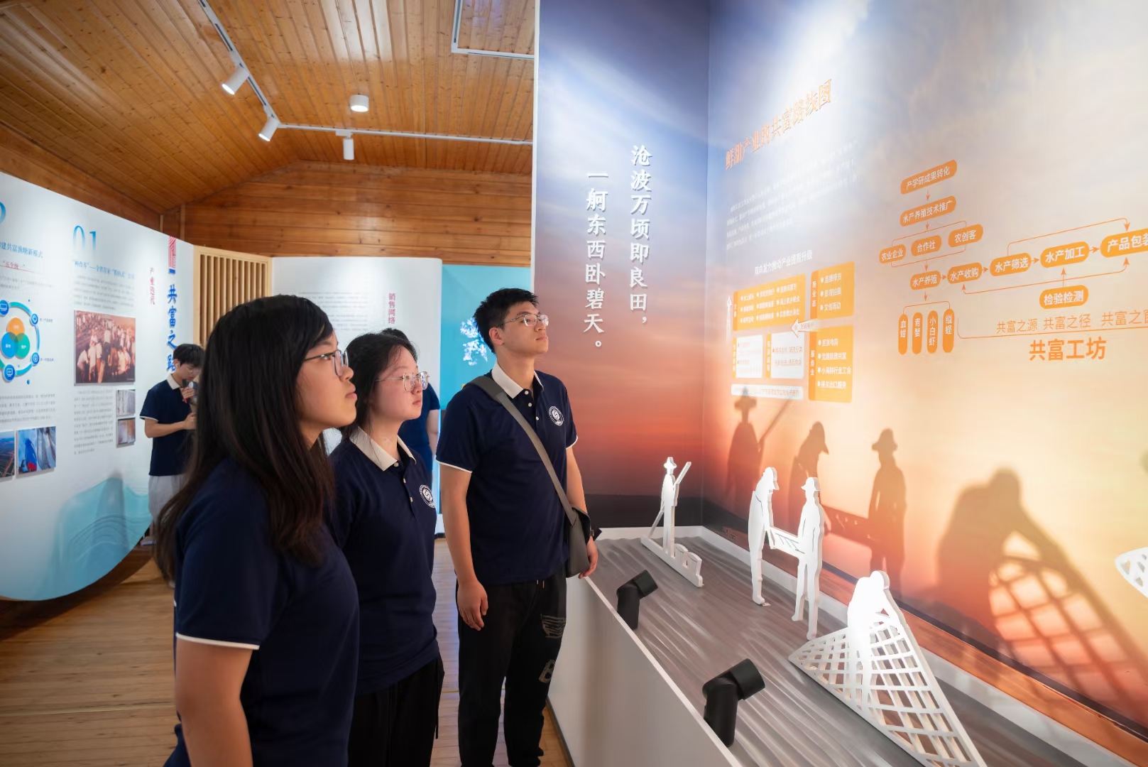 🚩“科技引领,乡振未来”深蓝暑期社会实践队第八站:三门县岩下潘村,横渡镇。 📍缘起千万工程,铺就生态文旅新道路。实践队走进岩下潘村,漫步水坊街,游览"情人谷"景区,体验多元化农家乐模式与度假模式,探寻在潘书记的带领下,该村从空心村到明星村的蝶变之旅。 📍追溯横渡起源,探索旅游提速新密码。实践队与横渡镇团委书记深入交流,梳理横渡镇的发展脉络,探索其从“传统农业镇”到“特色旅游镇”的转变历程。 📍体悟乡土文化,感受乡村艺术新融合。实践队走进横渡美术馆,参观集艺术展览、艺术课程、书咖为一体的多功能空间,体验拓印非物质文化遗产。展馆以乡村自然为基调,以新型艺术为切入带动乡村未来社区形成,成为横渡镇的文旅新地标与周围如诗如画的田园风光完美融合,有效激活了农村沉睡资源。